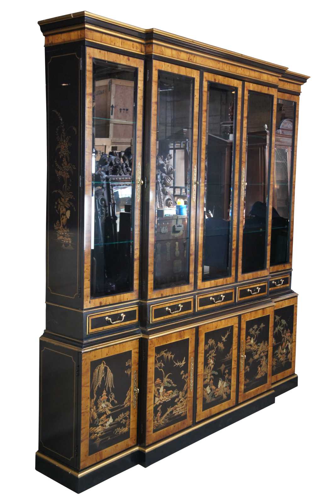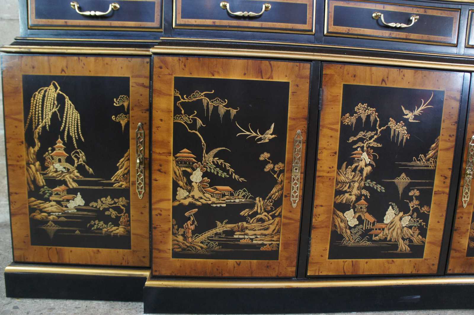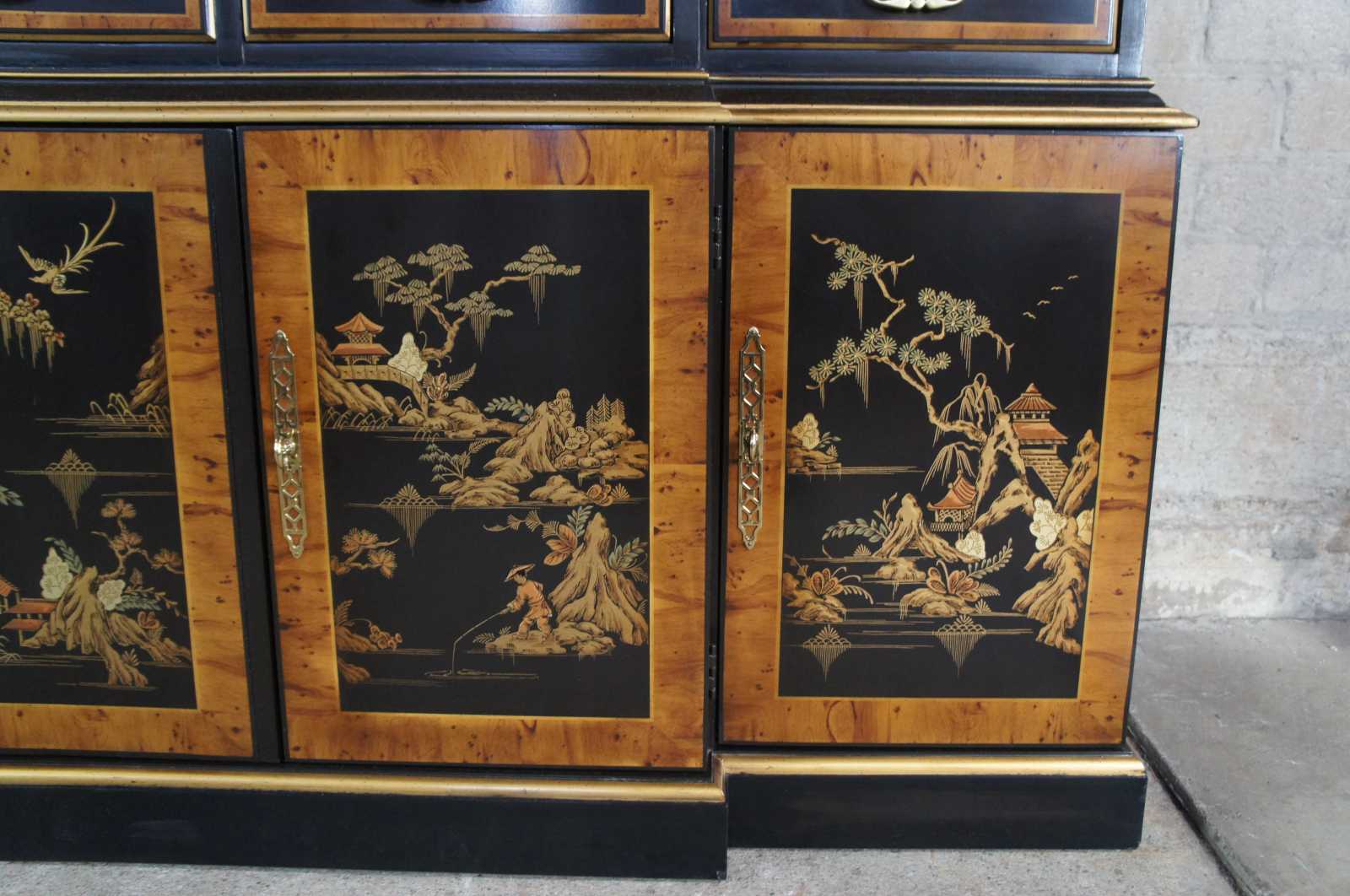 Vintage 1984 Drexel Heritage Et Cetera Chinoiserie breakfront china cabinet featuring black lacquer with gold painted accents, and pagoda mountain / water landscape scenes with geisha, fisherman, trees, and birds.