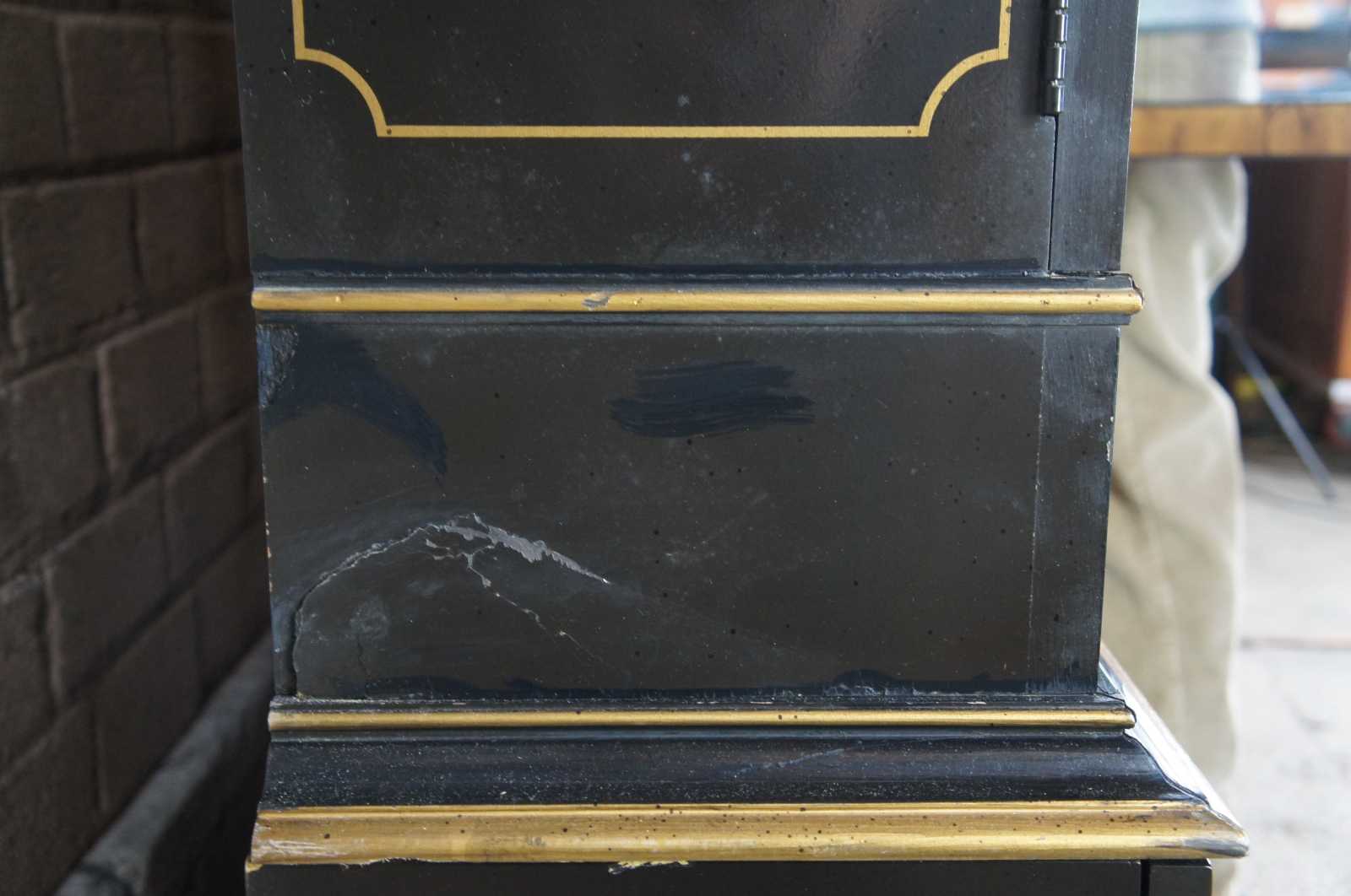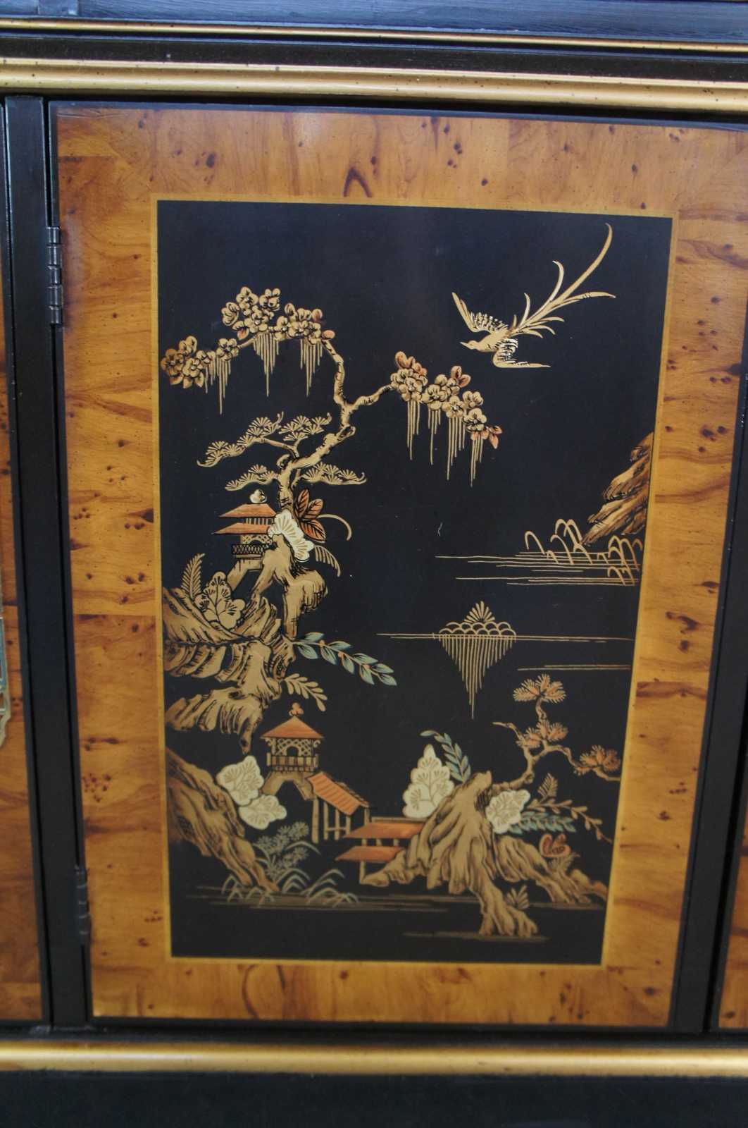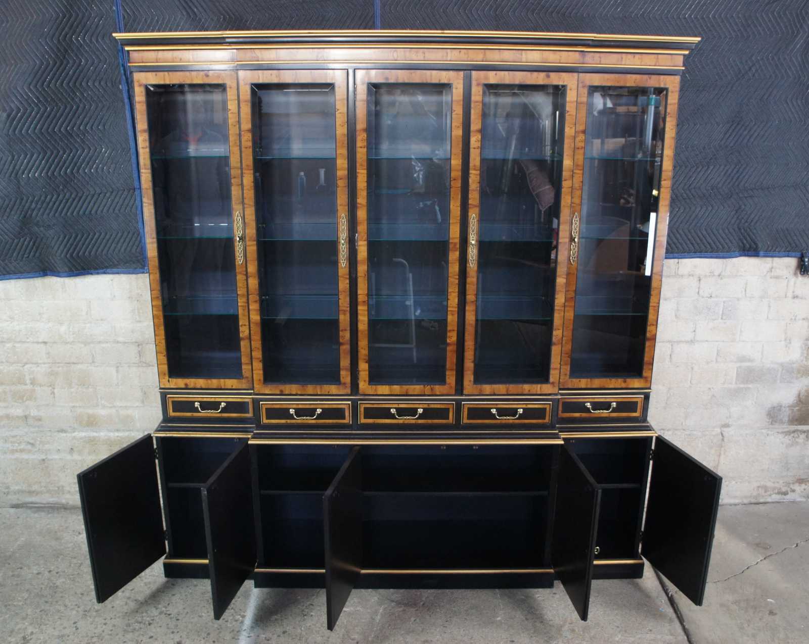 Vintage 1984 Drexel Heritage Et Cetera Chinoiserie breakfront china cabinet featuring black lacquer with gold painted accents, and pagoda mountain / water landscape scenes with geisha, fisherman, trees, and birds.