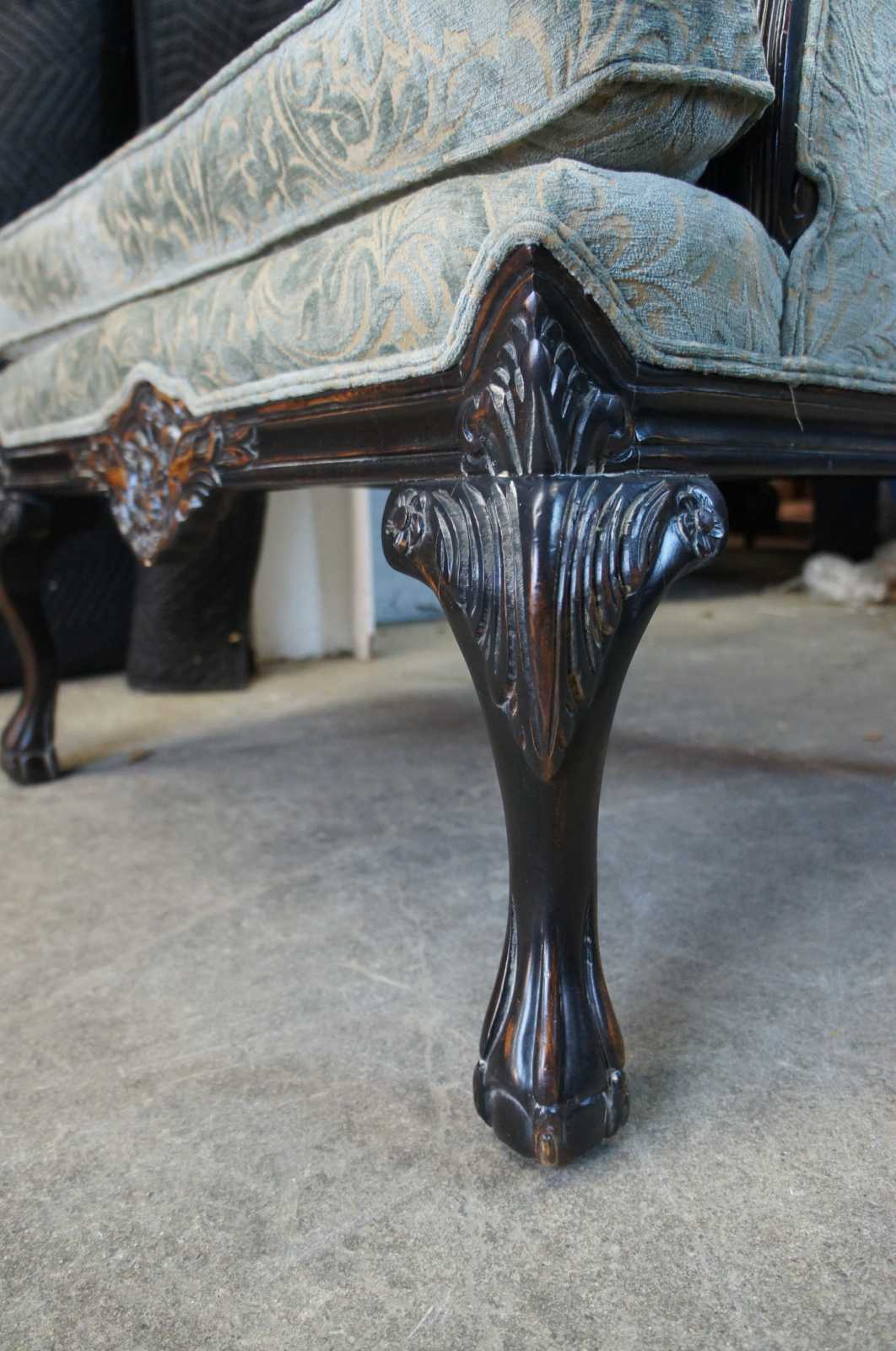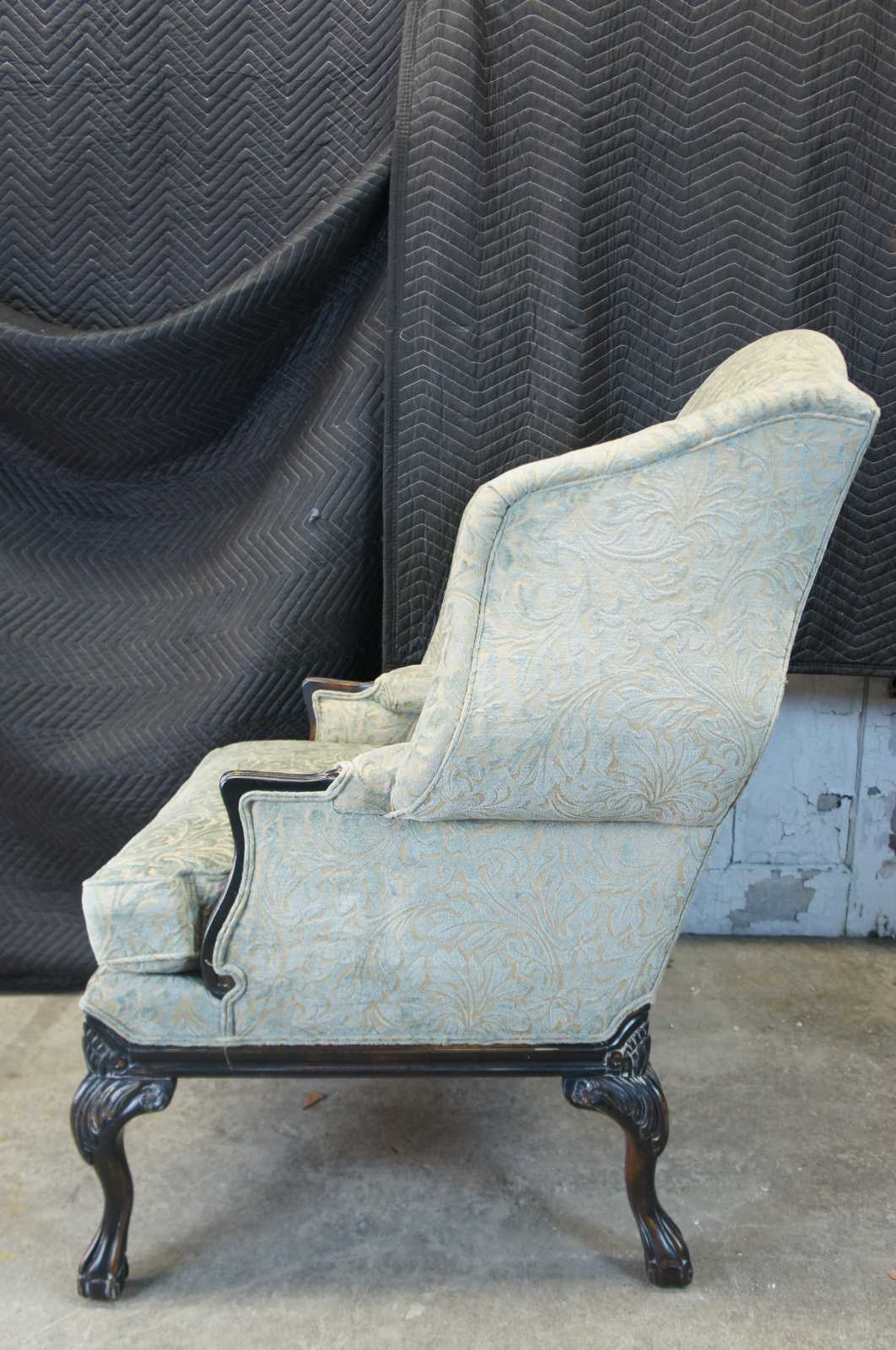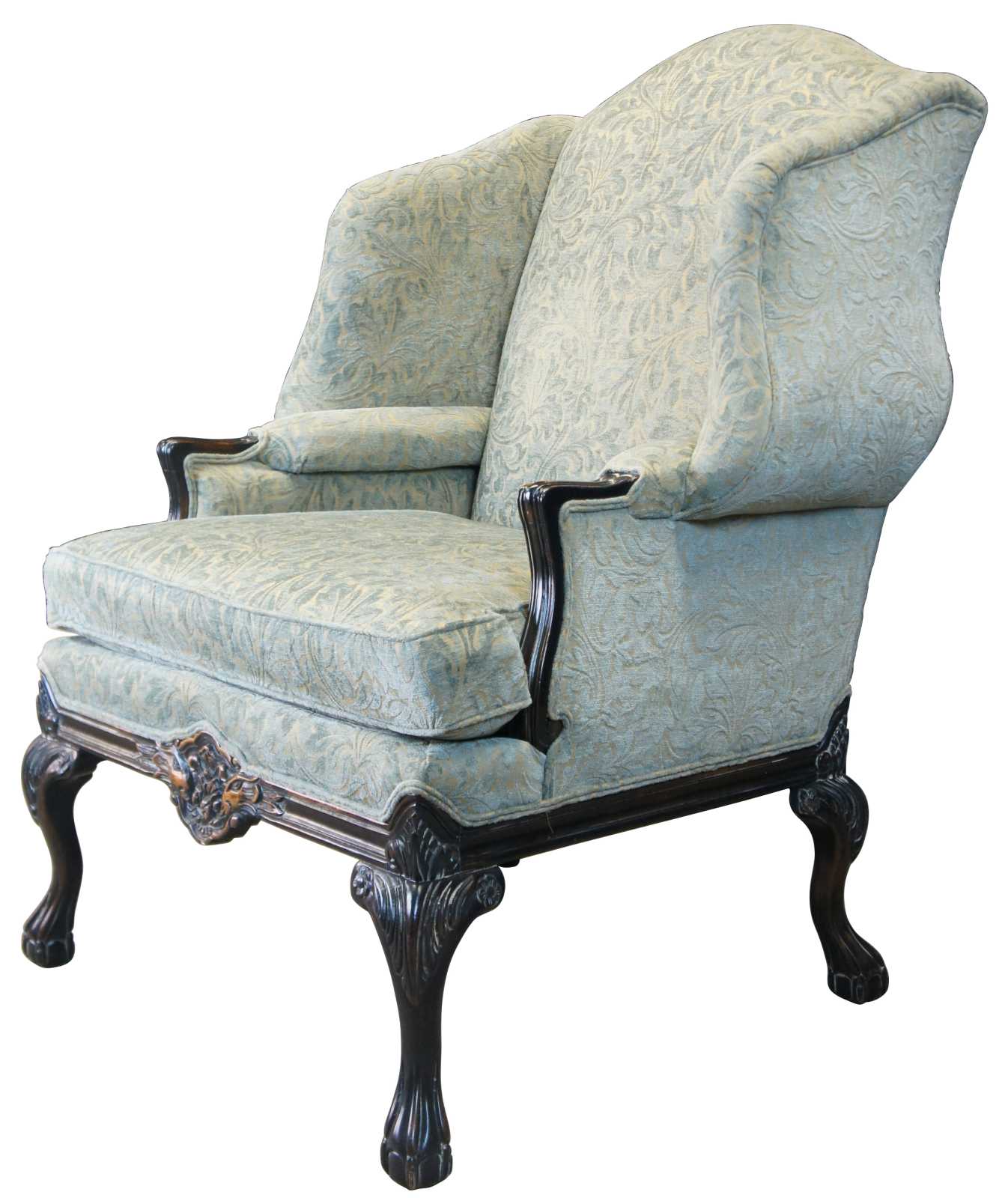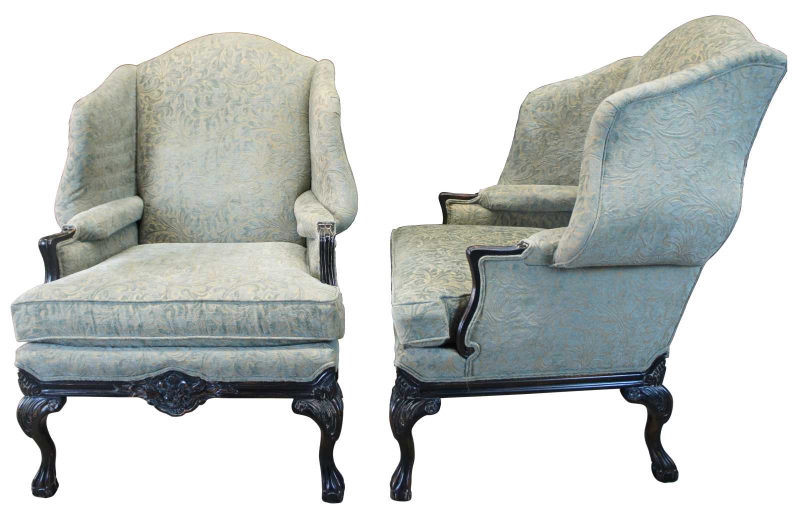 An exquisite pair of George III syle wingback chairs by Woodmark. Features a teal and gold raised velvet floral upholstery and ebonized frame. Supported by cabriole legs leading to ball and claw feet. Includes acanthus and floral carved embellishments. Circa 2005