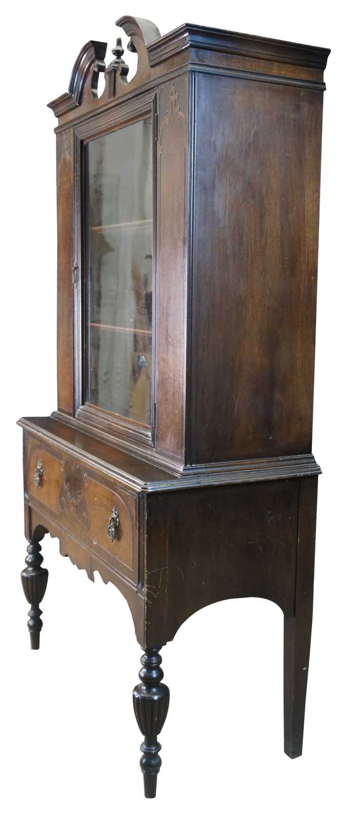 Jacobean revival china hutch, circa 1940s. Made from walnut with a burled front panels. Features two shelves concealed by a large central door over dovetailed silverware drawer. Includes an open pediment crown and serpentine lower apron. The cabinet is supported by balusters turned and fluted front feet.