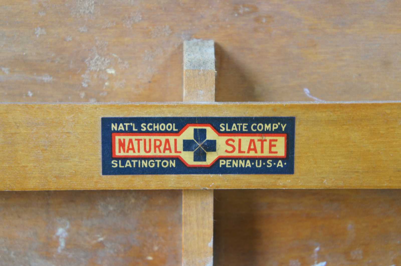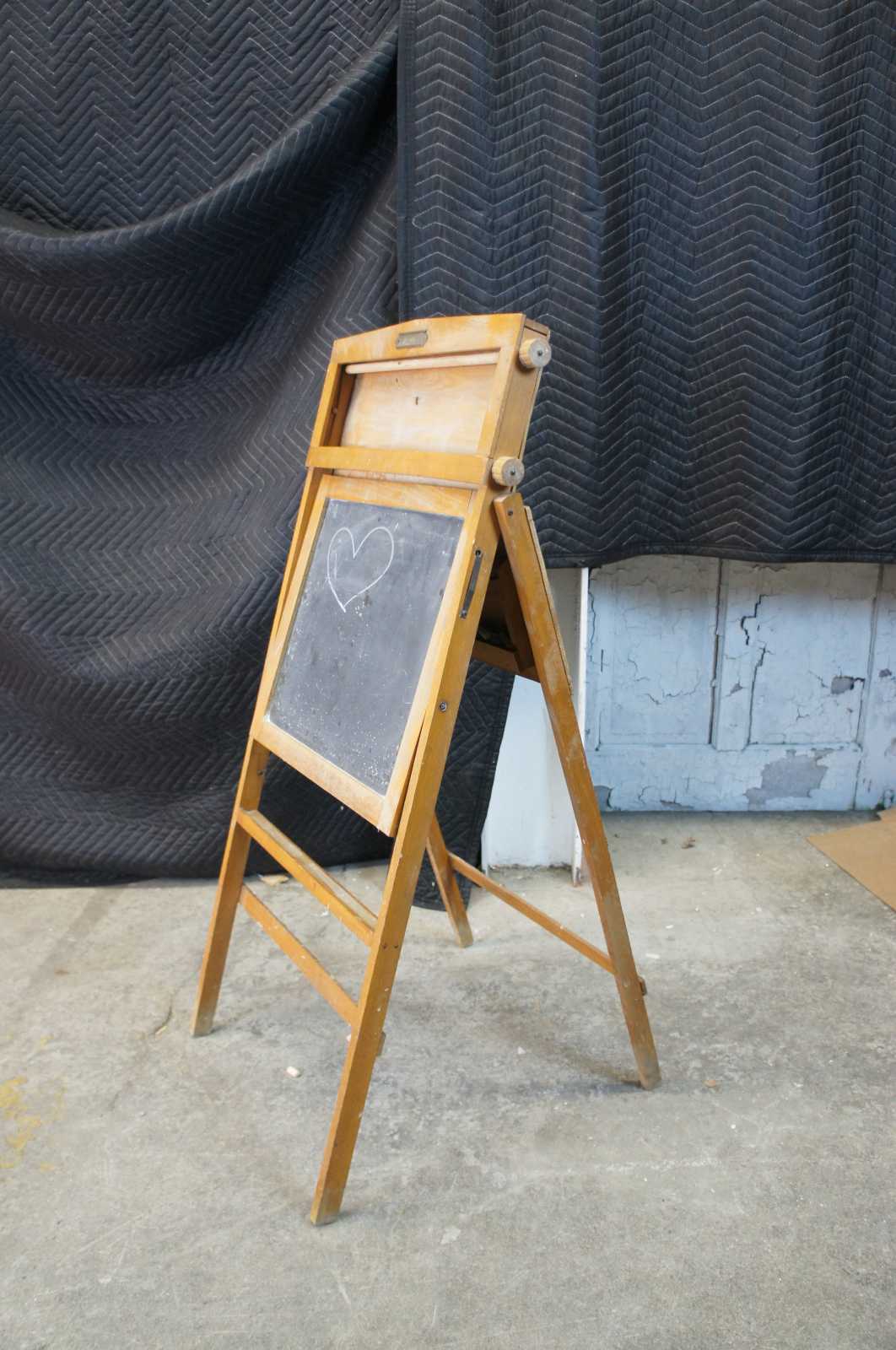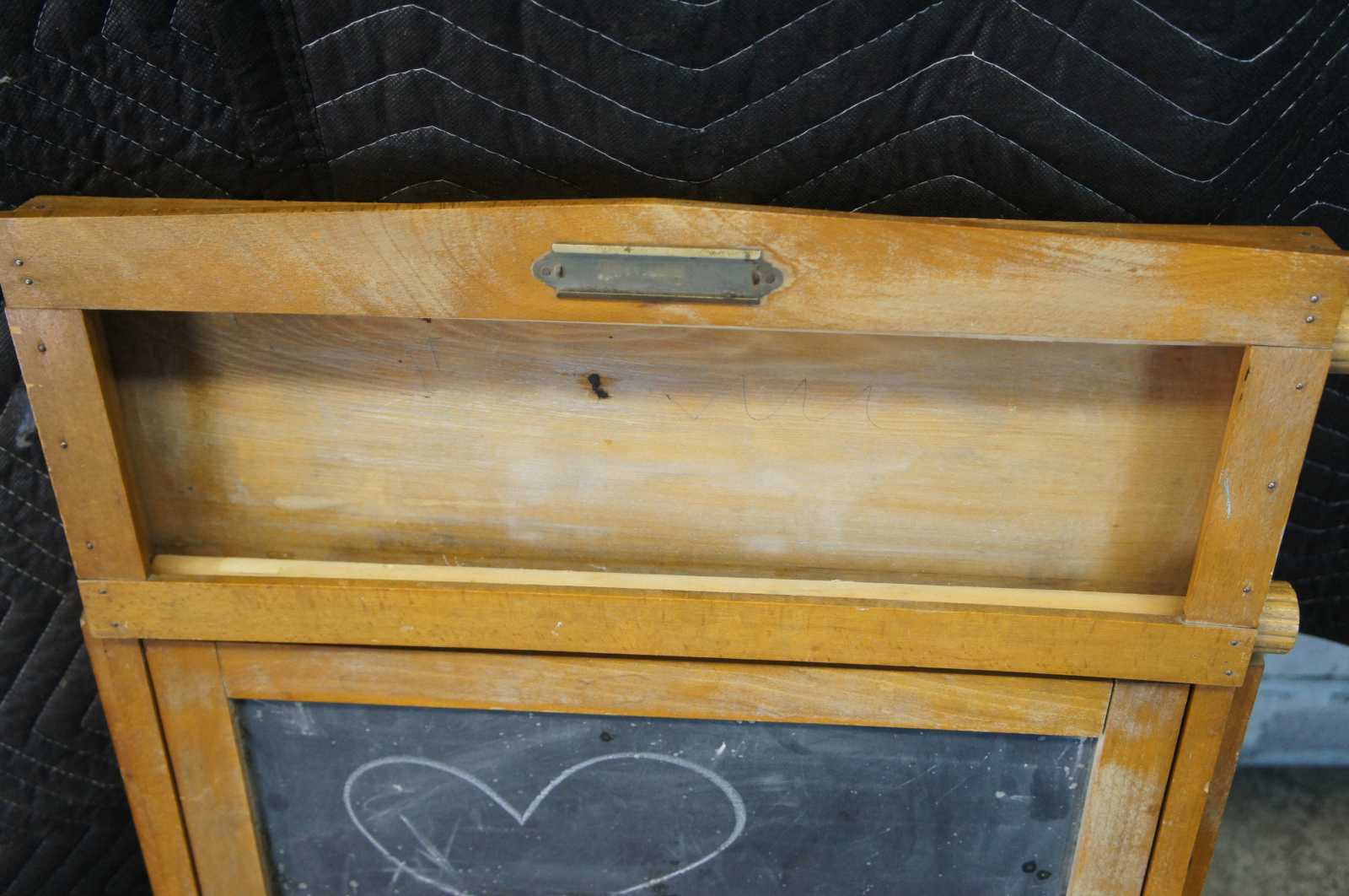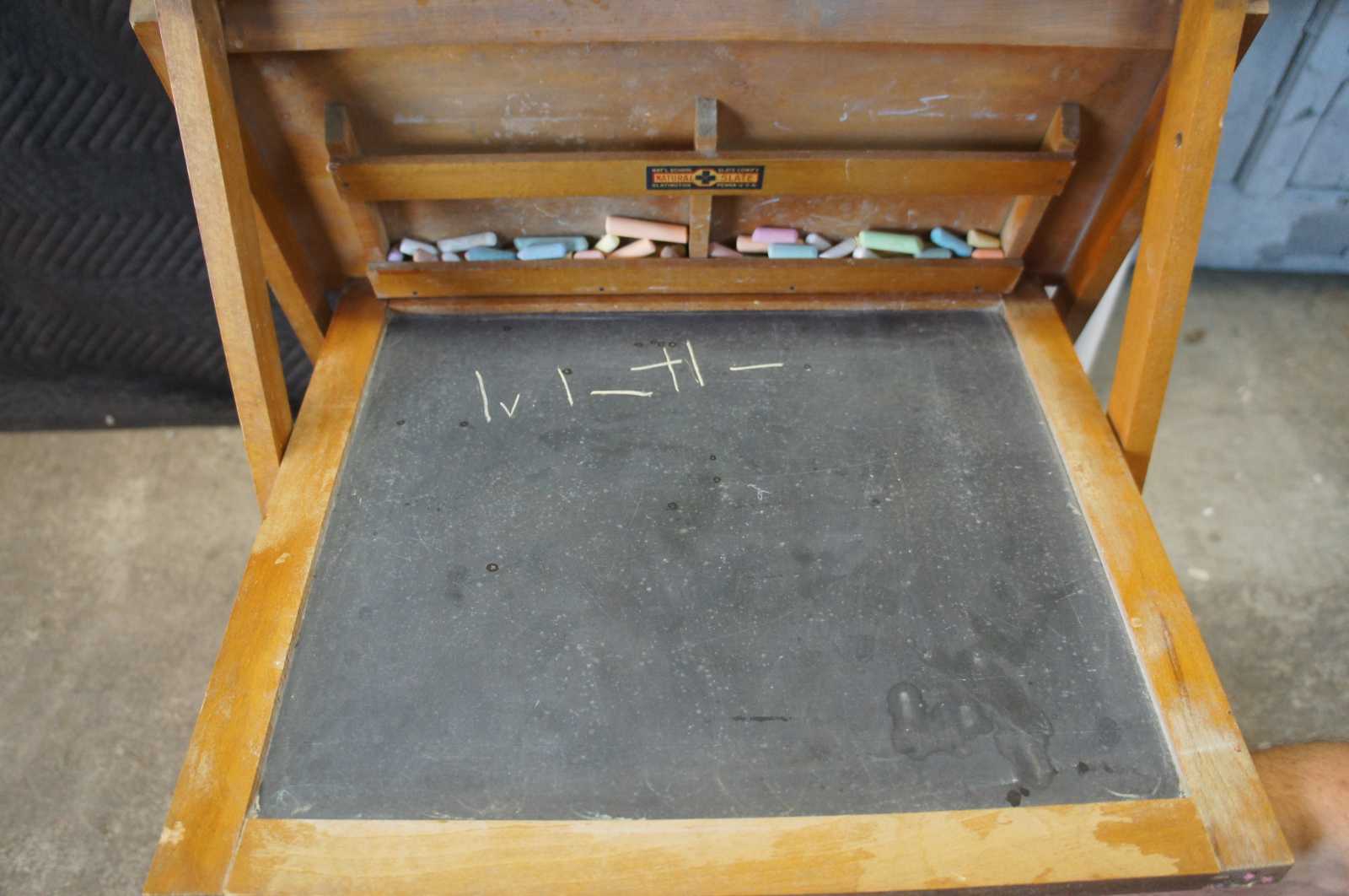 Circa 1940s National School Slate Company Chalkboard. Made from oak with a two sided fold out board allowing for use in the upright or tabletop position. Includes chalk and erasers. The upper portion is meant for a paper scroll that can be advanced or rewound by hand for additional drawing.