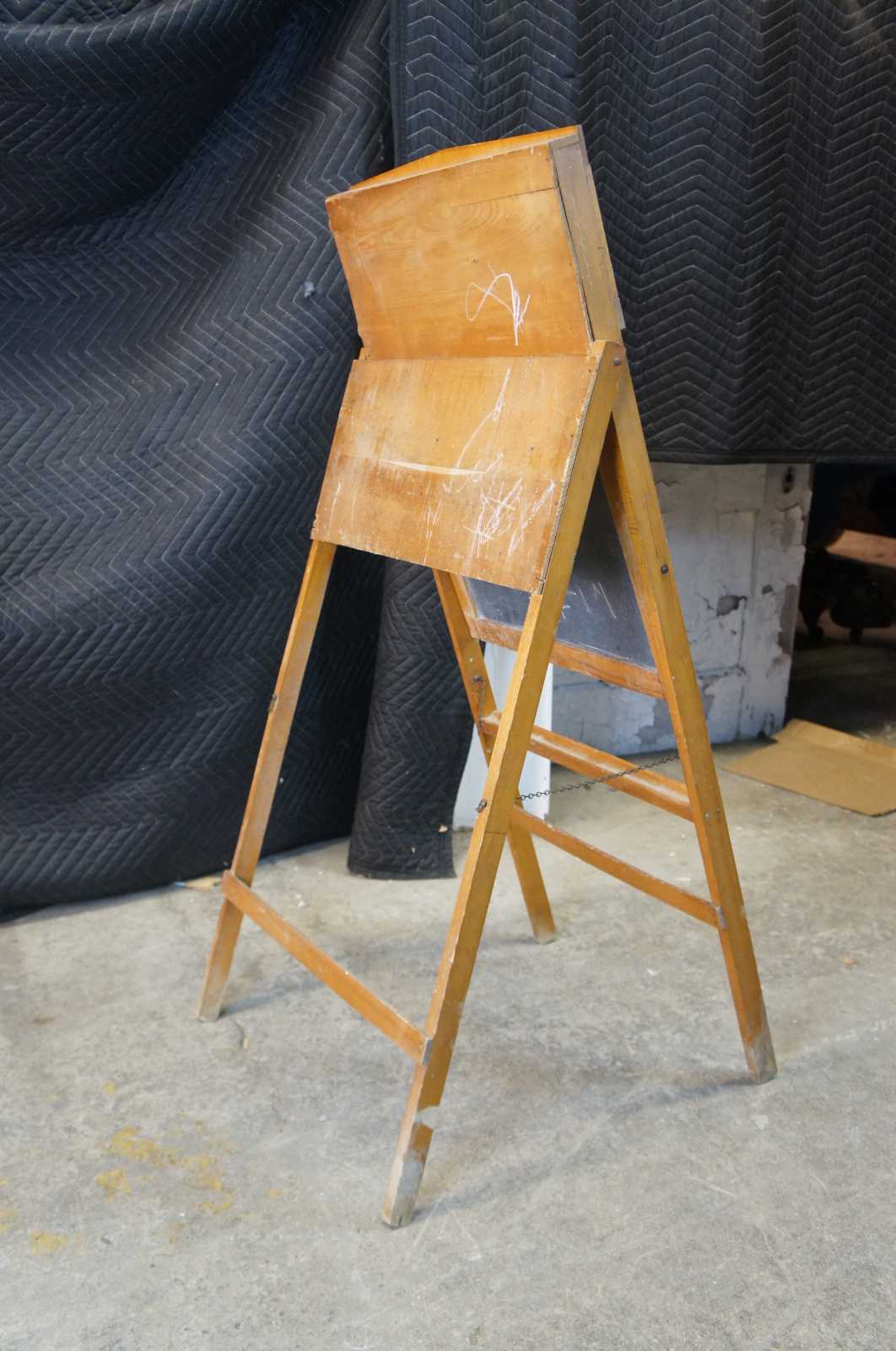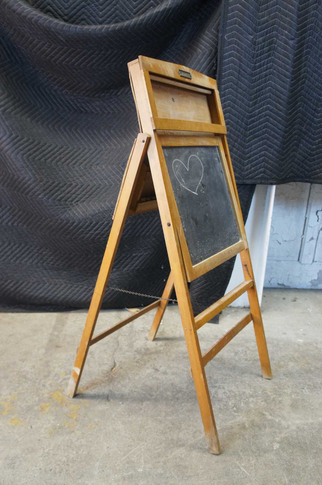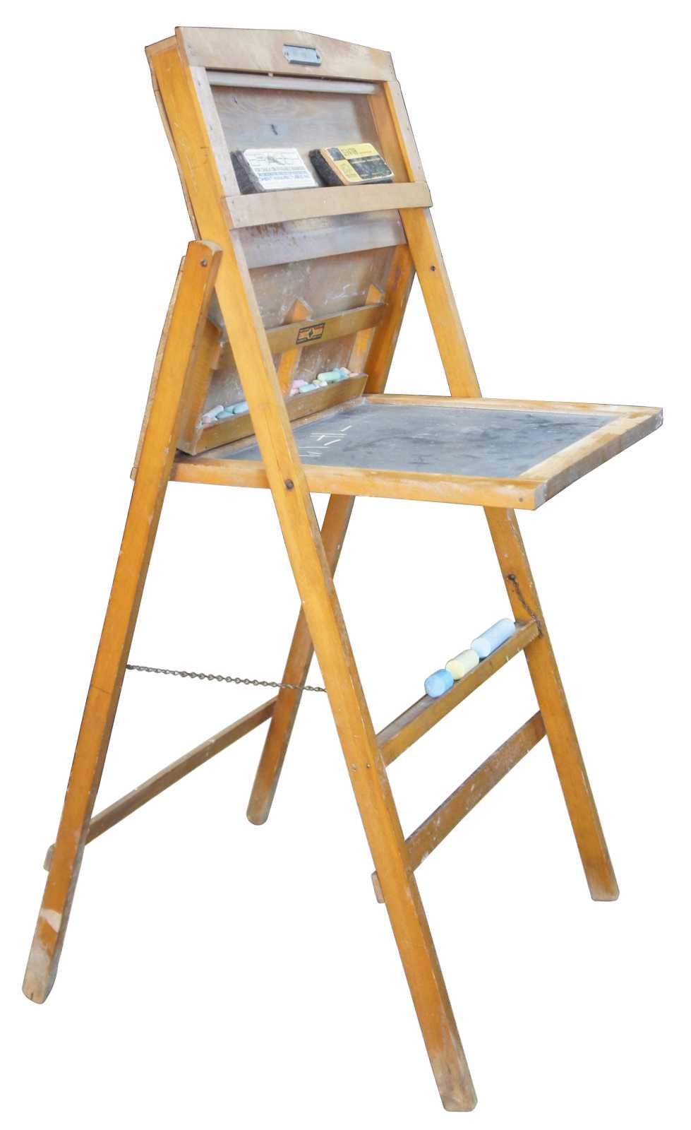 Circa 1940s National School Slate Company Chalkboard. Made from oak with a two sided fold out board allowing for use in the upright or tabletop position. Includes chalk and erasers. The upper portion is meant for a paper scroll that can be advanced or rewound by hand for additional drawing.