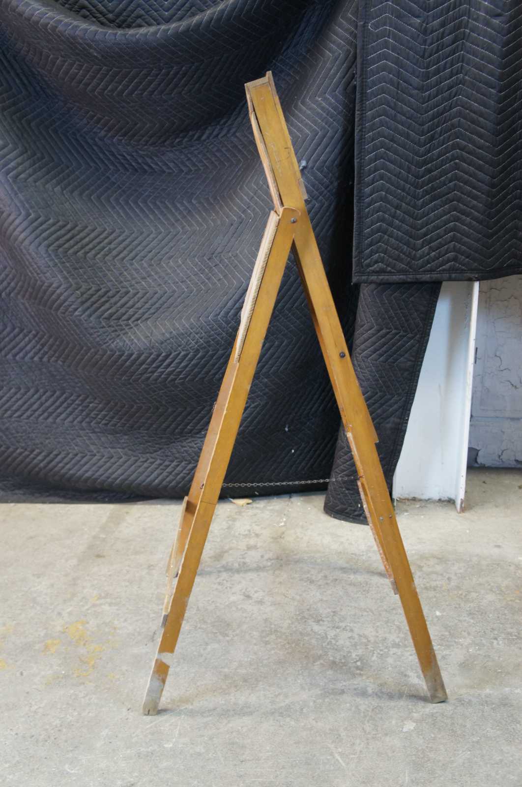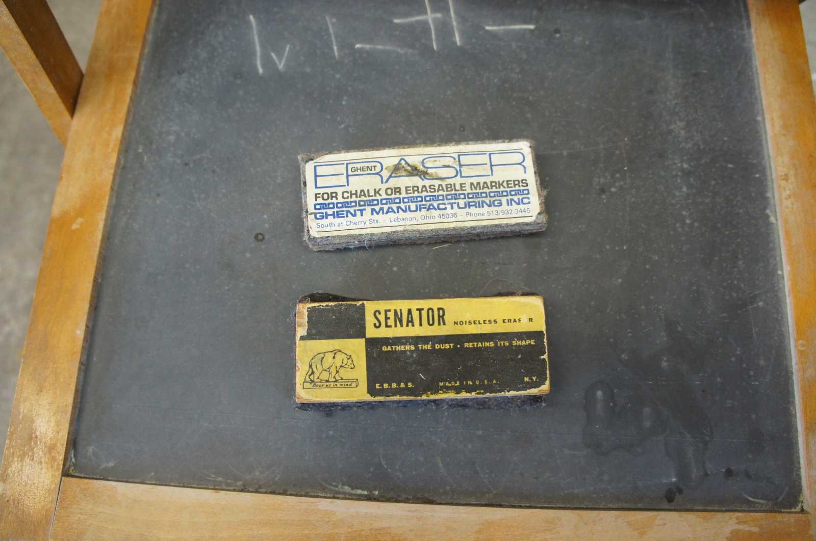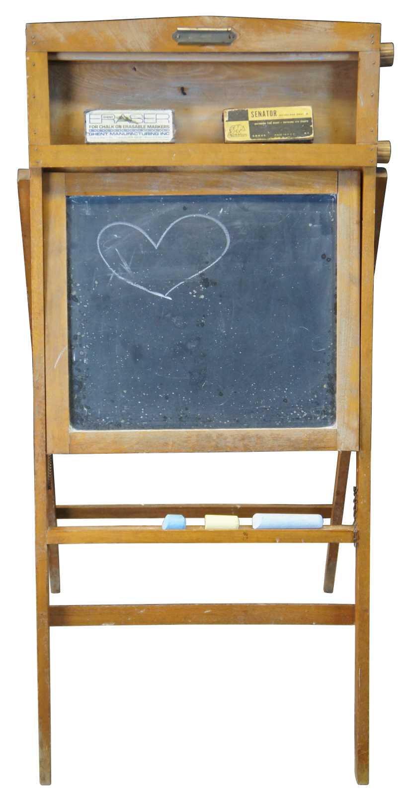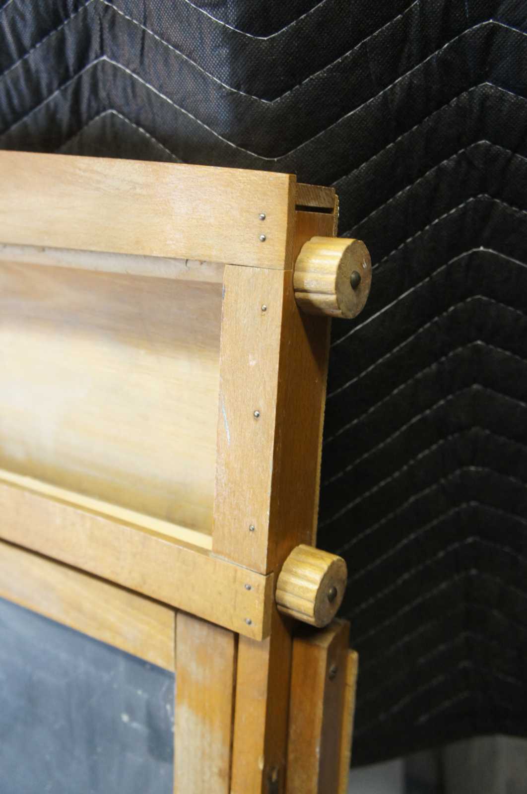 Circa 1940s National School Slate Company Chalkboard. Made from oak with a two sided fold out board allowing for use in the upright or tabletop position. Includes chalk and erasers. The upper portion is meant for a paper scroll that can be advanced or rewound by hand for additional drawing.