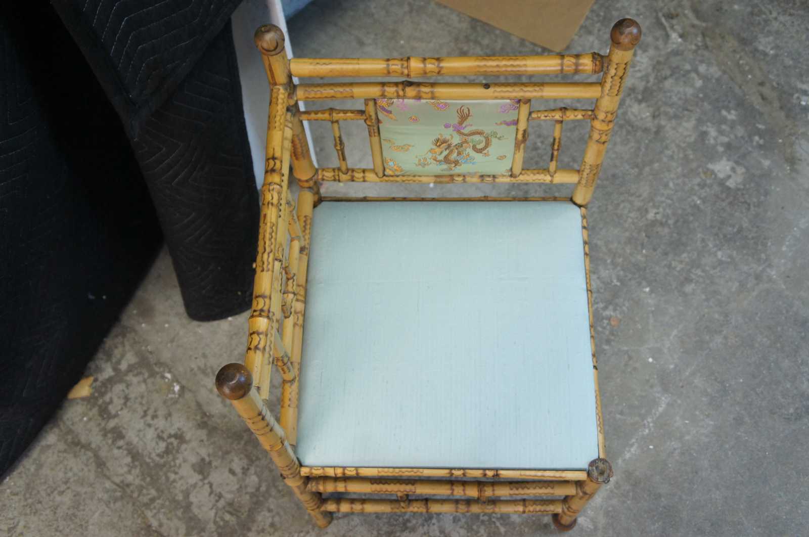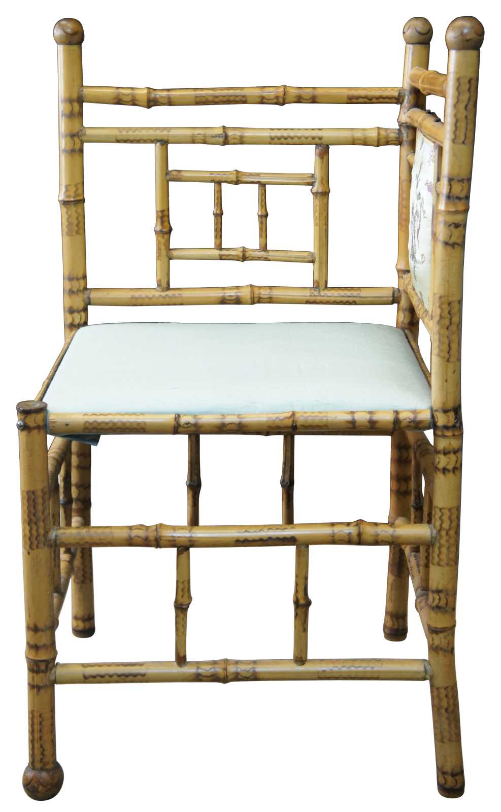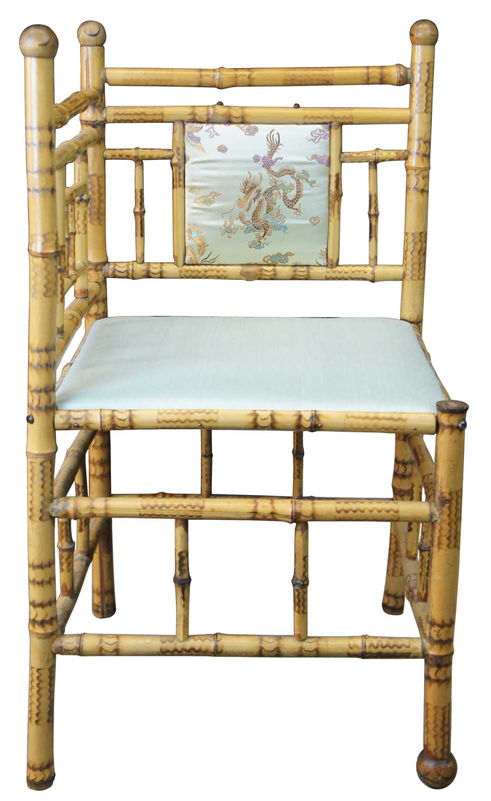 Scorched bamboo Victorian corner chair, circa 1900s. Features silk upholstery with a dragon scene along the seat back. The geometric frame is neatly accented by ball finials.