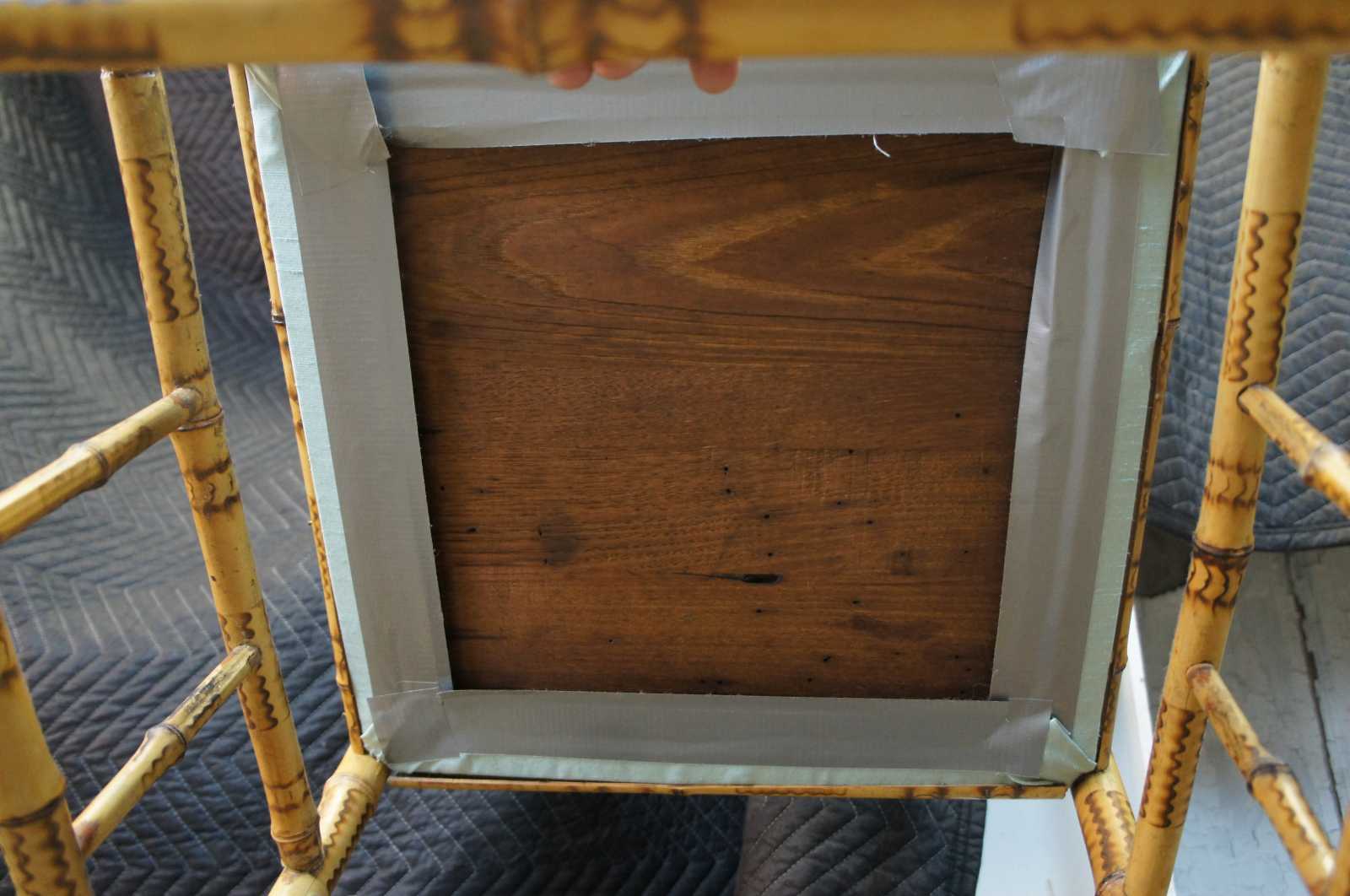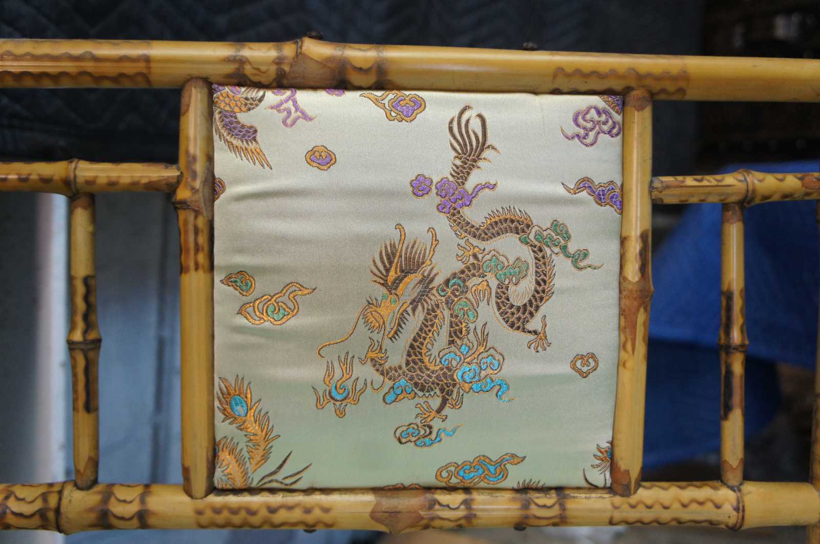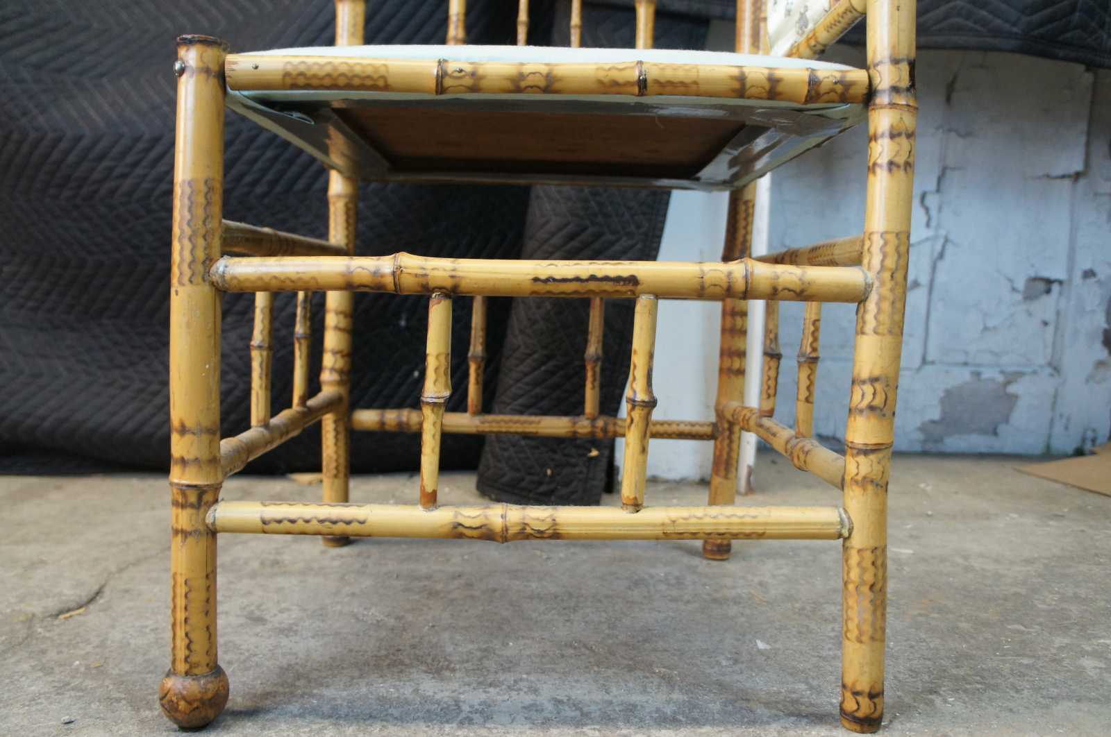 Scorched bamboo Victorian corner chair, circa 1900s. Features silk upholstery with a dragon scene along the seat back. The geometric frame is neatly accented by ball finials.