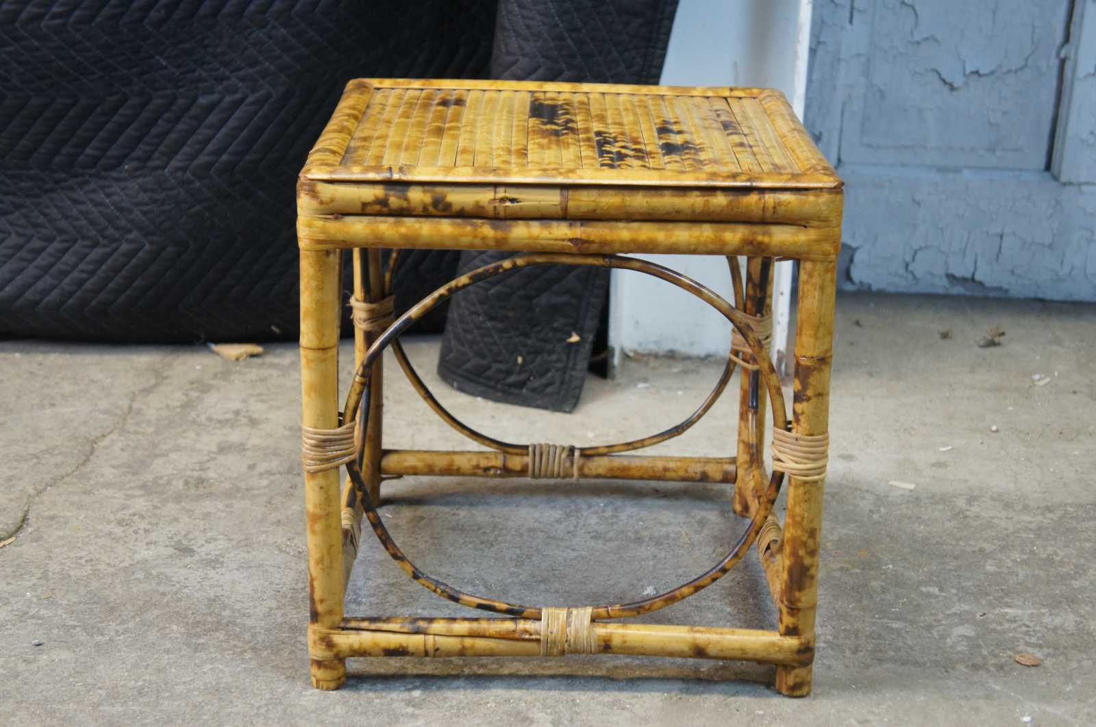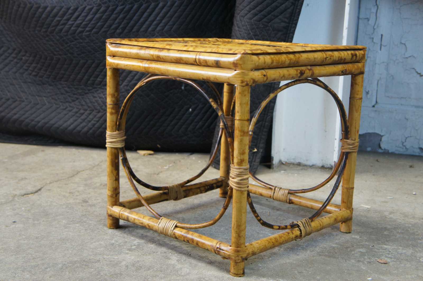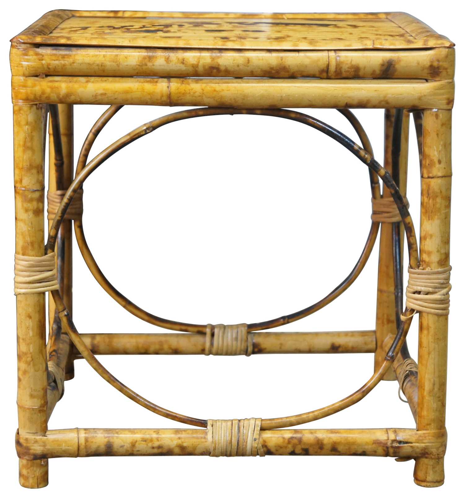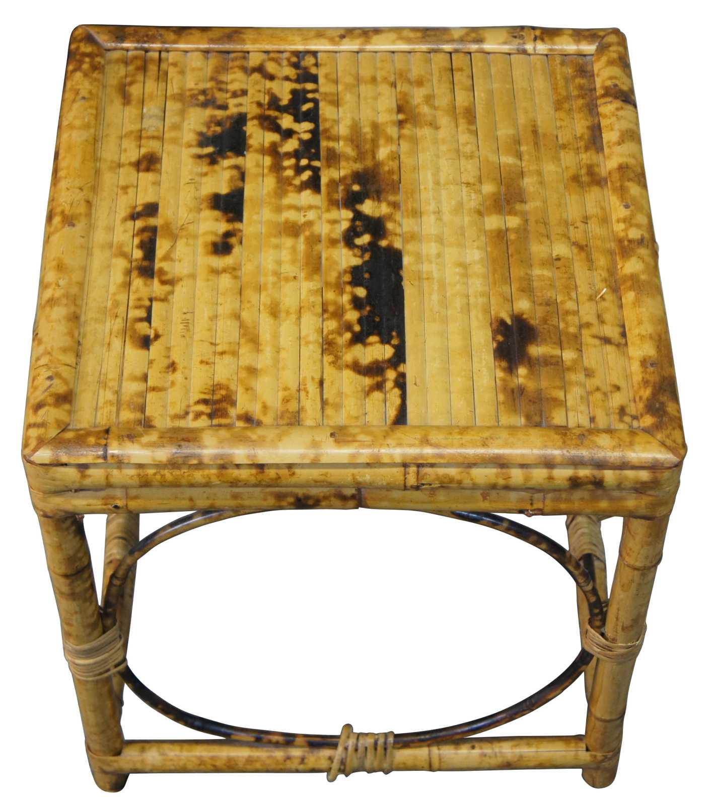 Circa 1970s scorched bamboo side table or plant stand. A square form with geometrically placed circles attached with rattan.