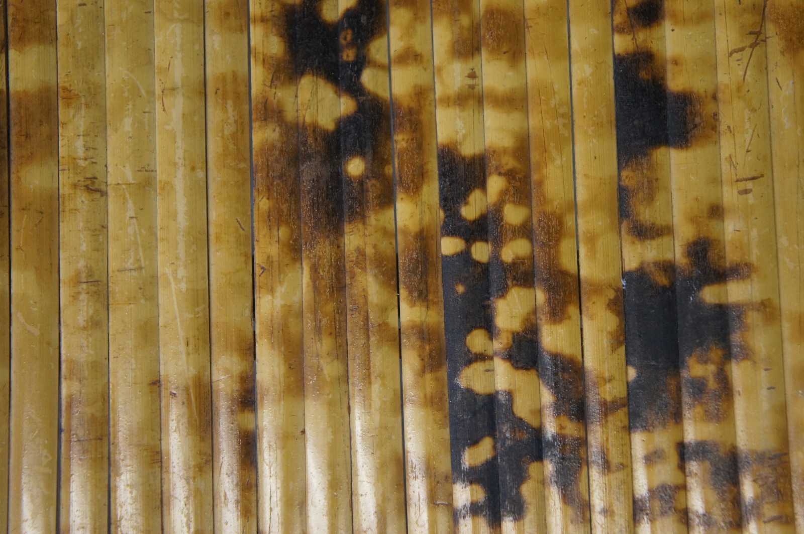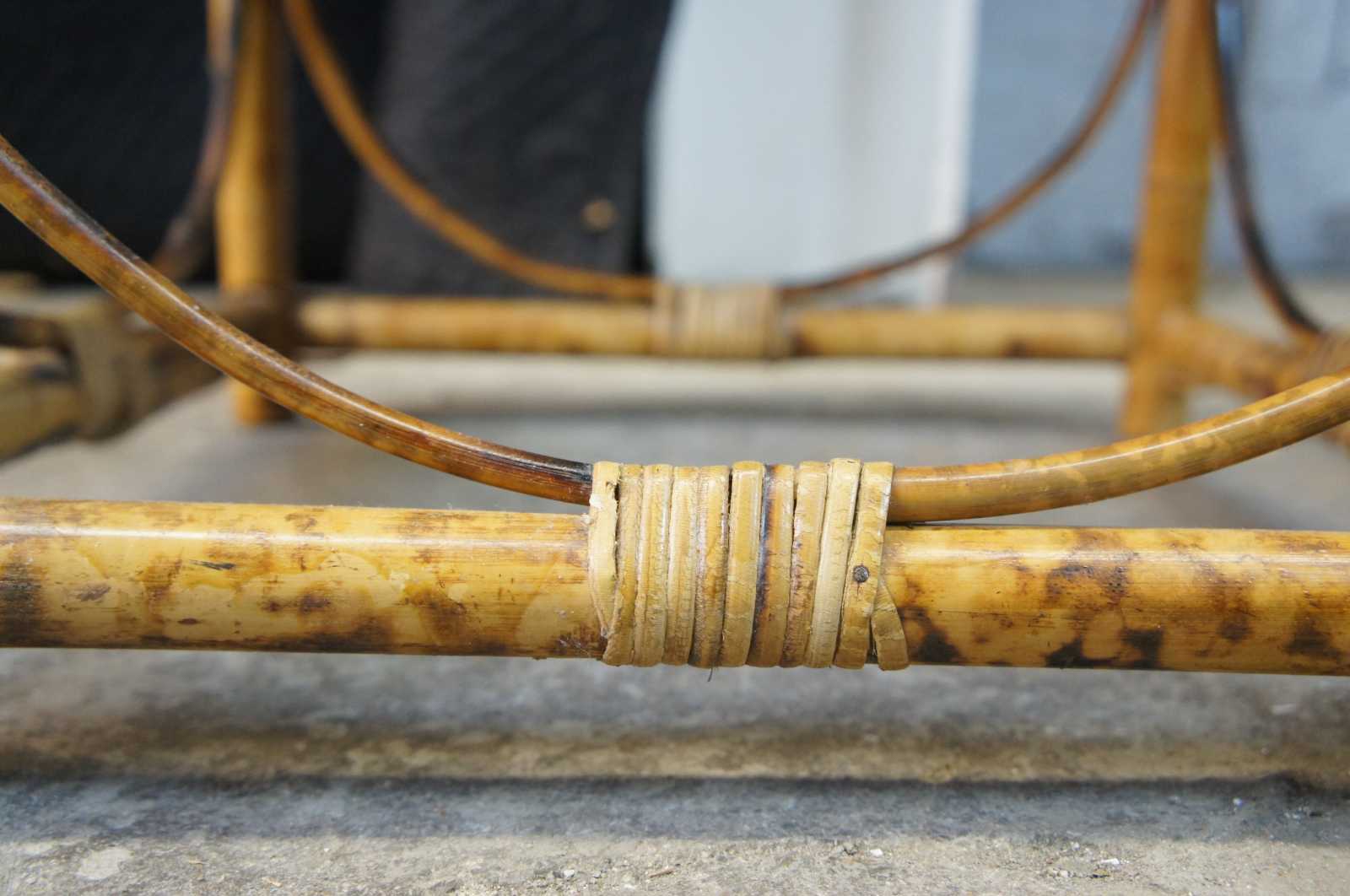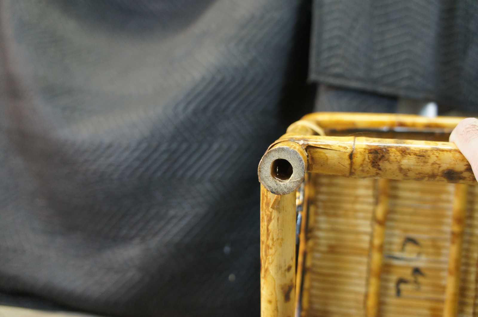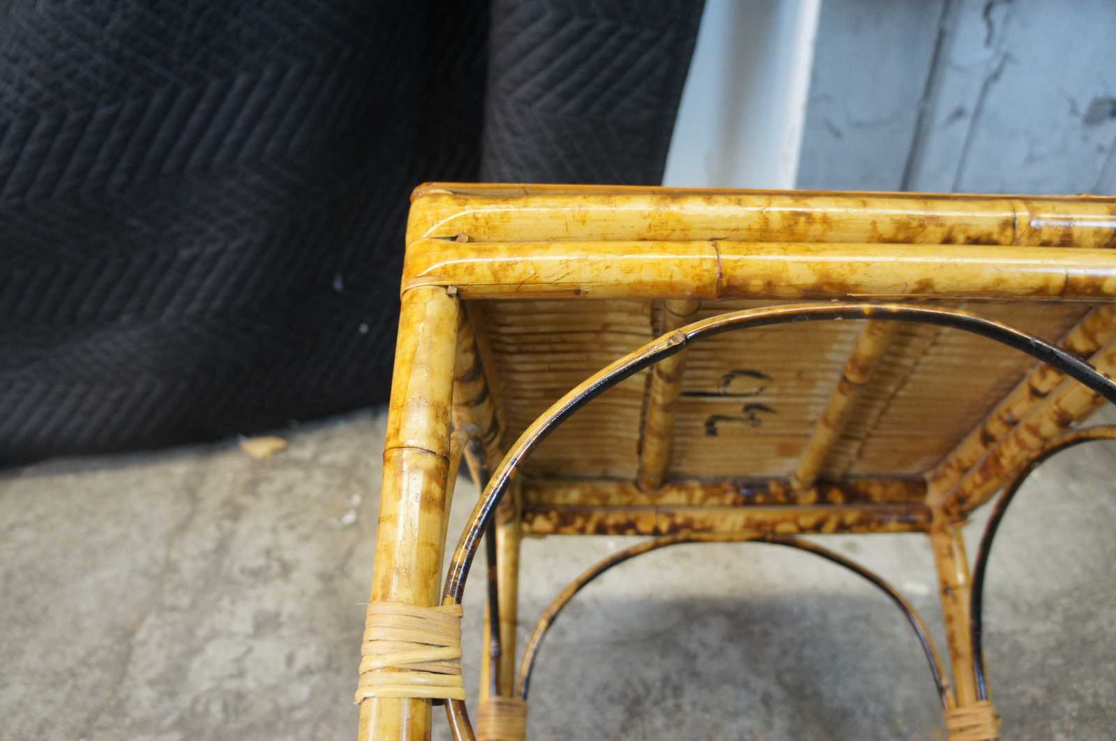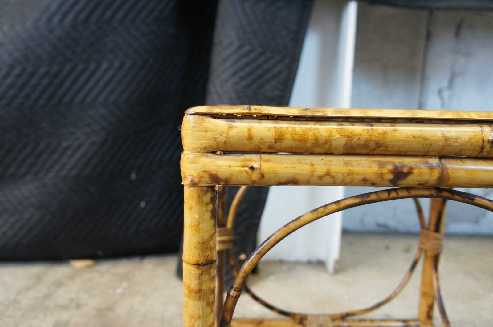 Circa 1970s scorched bamboo side table or plant stand. A square form with geometrically placed circles attached with rattan.