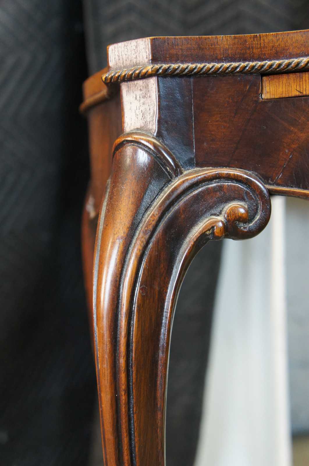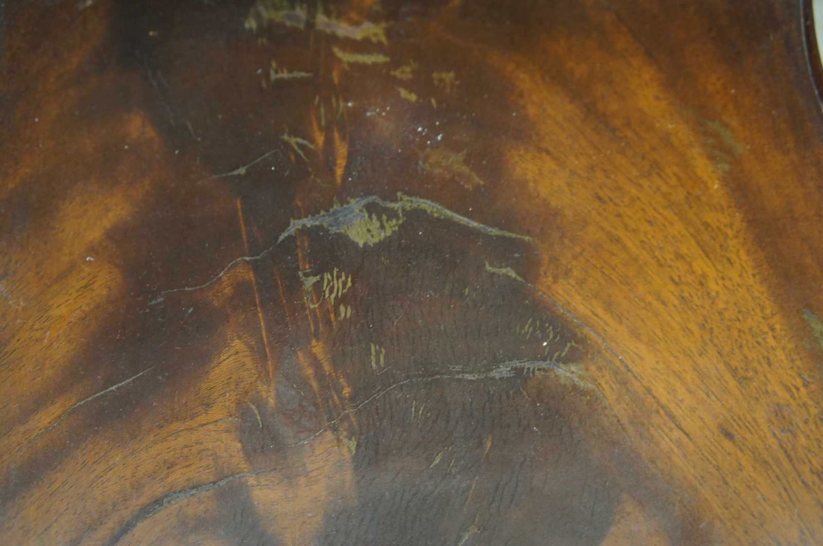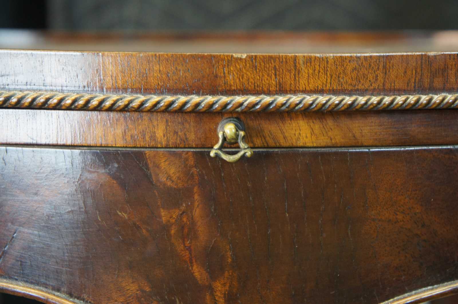 Circa 1940s mahogany pedestal or tray table. A neat mix of English and French Styling. Features flame mahogany top and apron over long cabriole legs leading to scrolled peg feet. Includes a rope twisted trim and inset top.