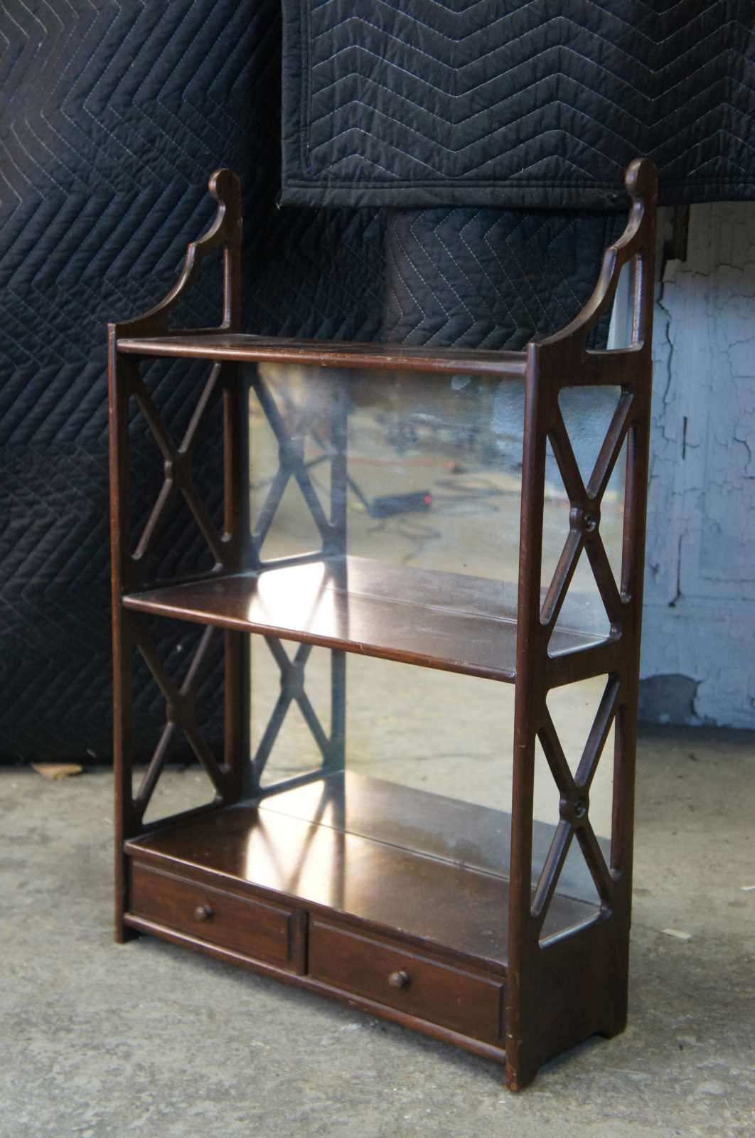 Vintage georgian style wall shelf, circa 1960s. Features open x paneling along the sides and two drawers for storage.