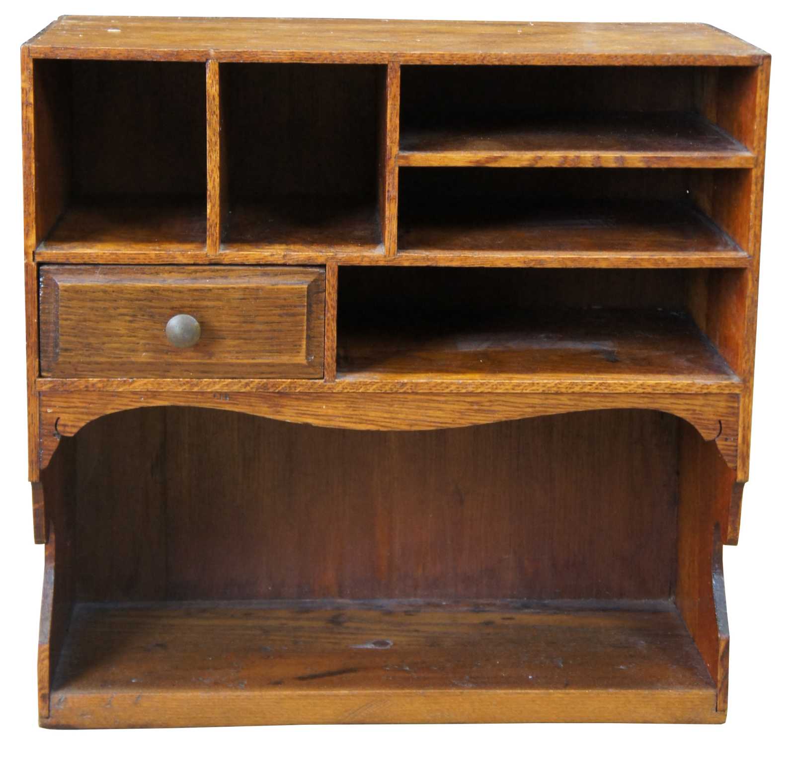 Antique oak desktop or hanging organizer. Includes 5 cubbies and a drawer for storage over a large lower shelf.