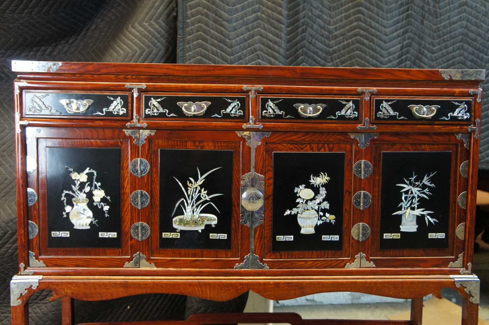 An exquisite chinese chest or cabinet on stand. A rectangular form made from elm with vibrant mother of pearl inlay set within black cabinet and drawer fronts. Neatly accented with silvertone hardware. The cabinet features four upper drawers and lower cabinet with lock Lower cabinet opens to a central space that shows a glimpse of two hidden drawers. Each drawer is revealed when the cabinet doors are slid towards the middle. The cabinet is supported by a ming style base.