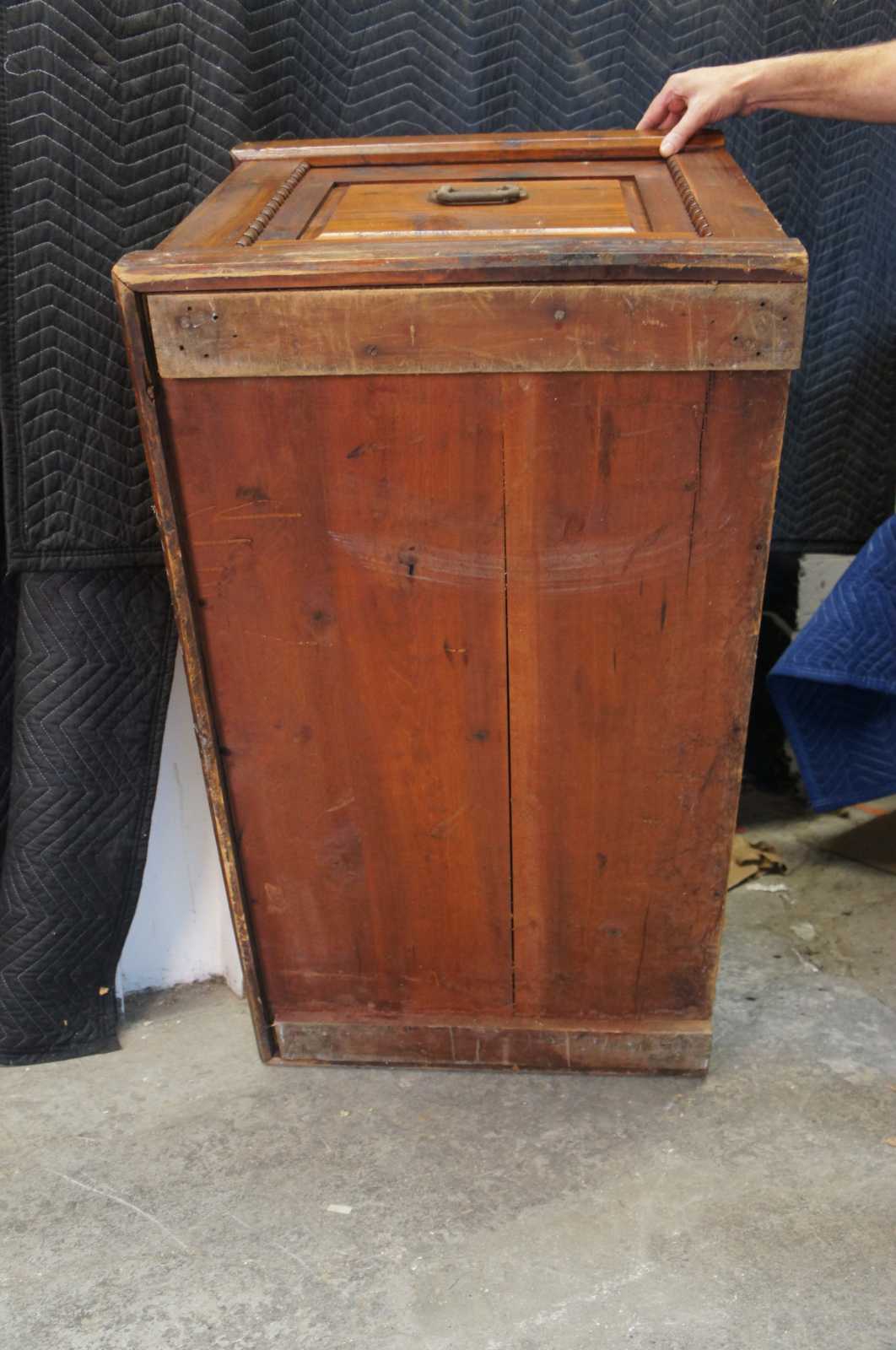Good Antique Condition; wear and distressing commensurate with age. Missing original straps that kept the top open as well as lock