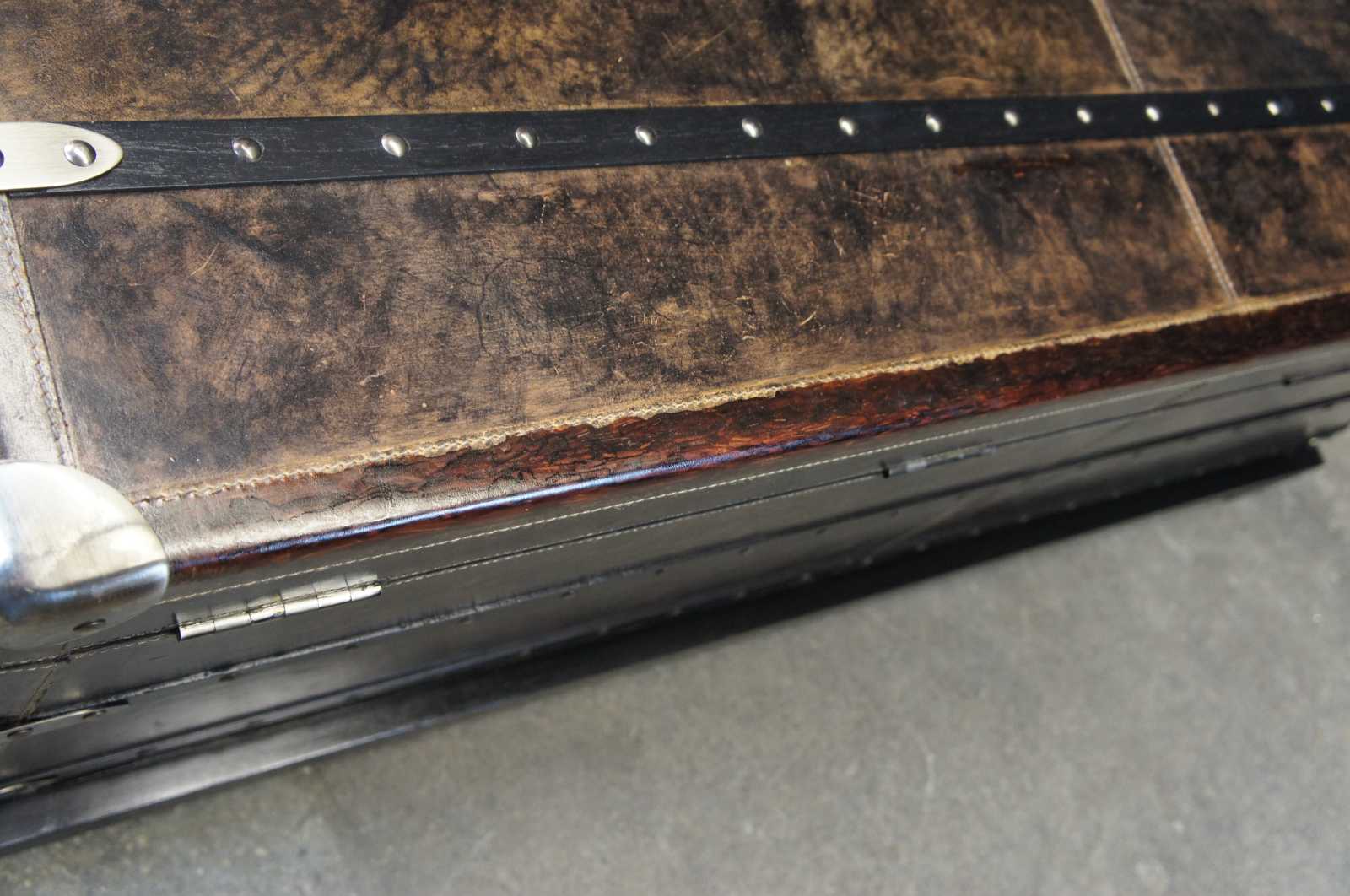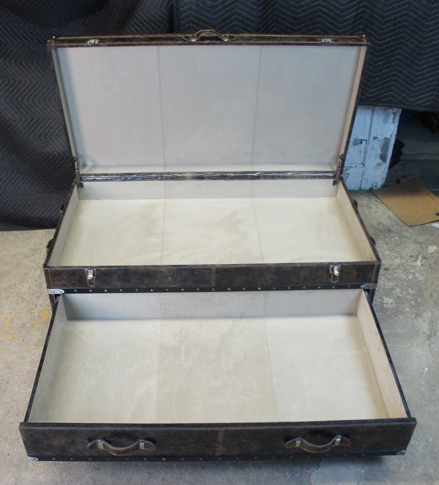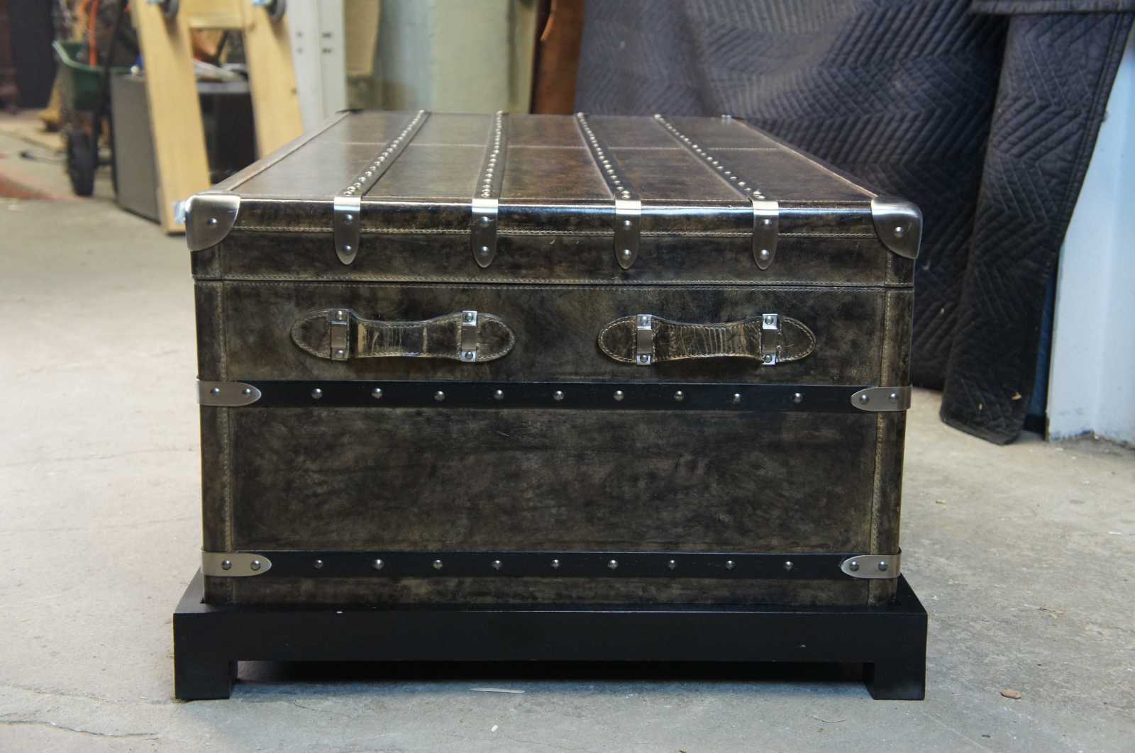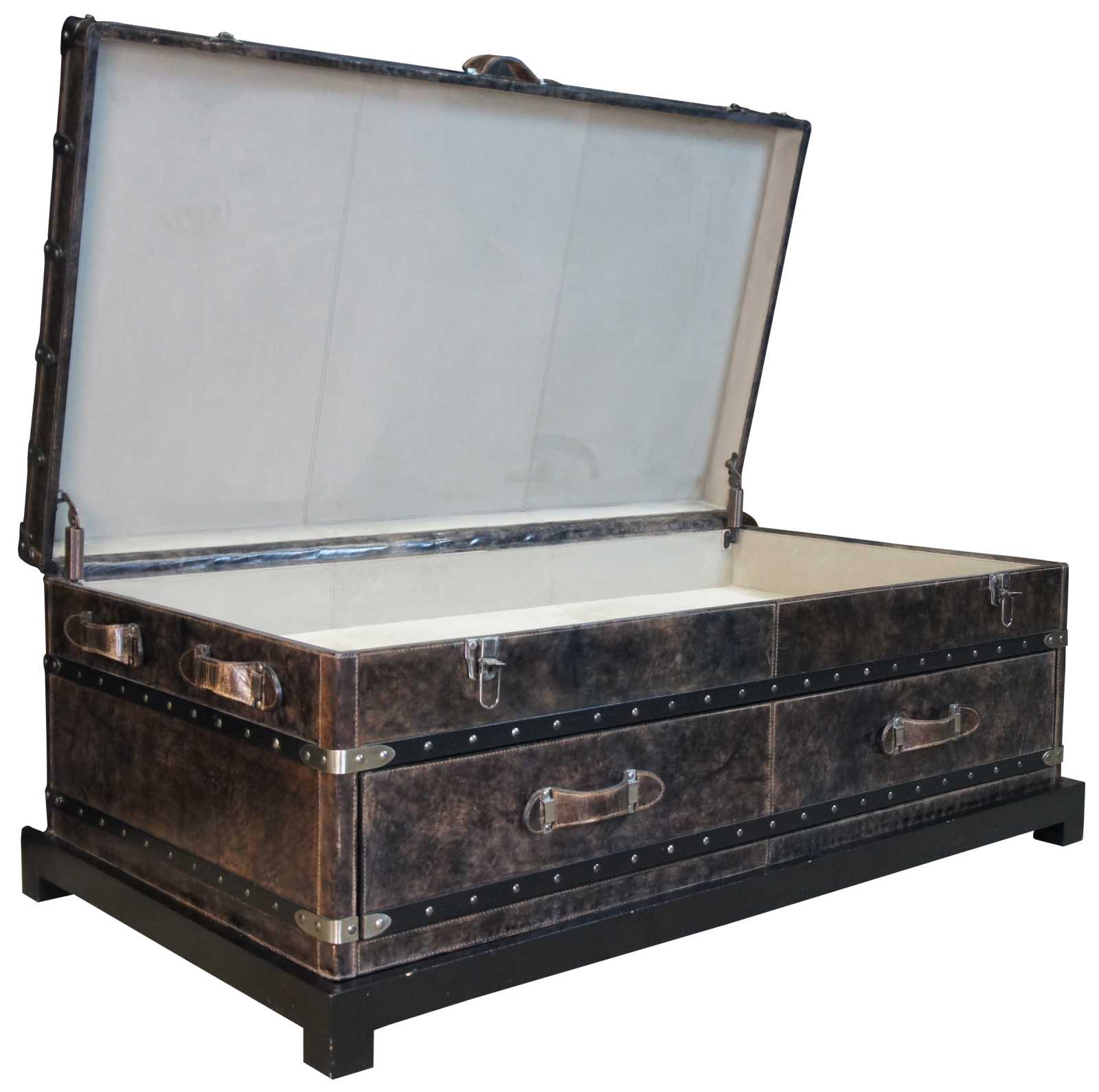 The Arhaus Martin coffee table is a stunning modern rendition of Victorian era steamer trunks. Beautiful brown leather with nickel riveted wooden trim. Includes one over sized drawer and a top compartment for accessory storage. Rests upon a removable black base. MSRP $2600