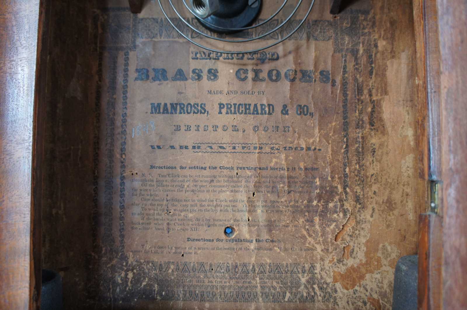 Manross, Prichard & Co, circa 1841-43. Elisha Manross bought a shop from Joseph Ives and was making wooden clock parts for Chauncy Boardman as early as 1813. Years later, he made clocks with a man named Wilcox c.1840. A partnership with Prichard came next, but was short lived as he bought out his partners August 17th 1843. Sold out to EN Welch sometime after 1850. They used a type 19.212 movement of their own manufacture.