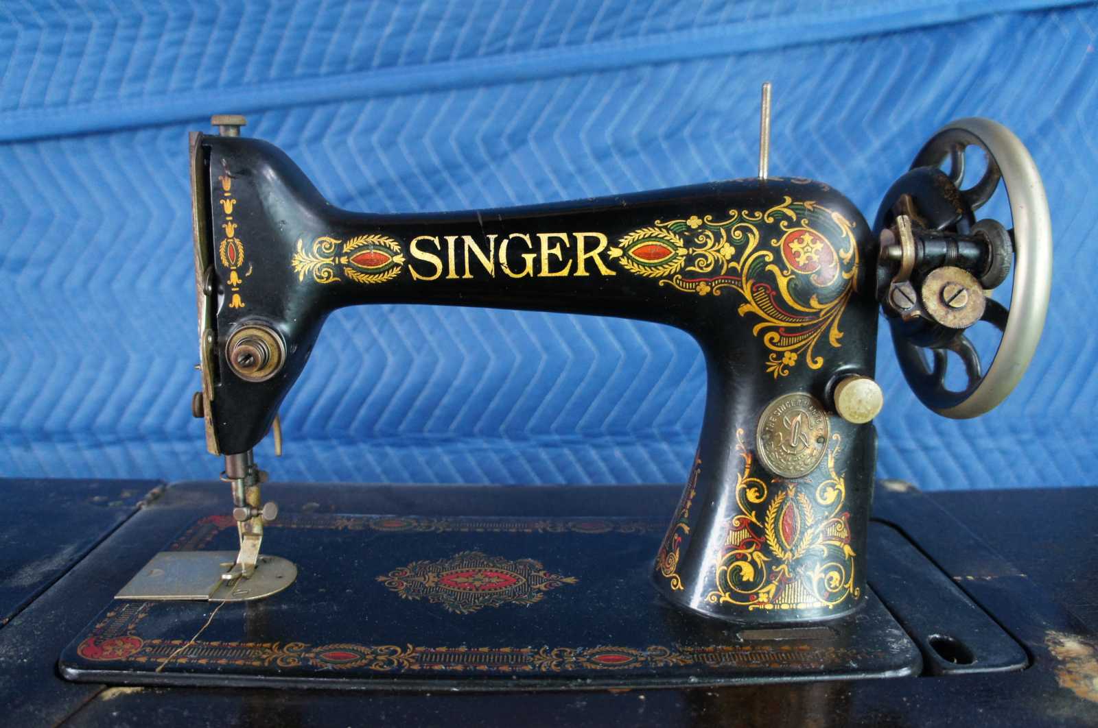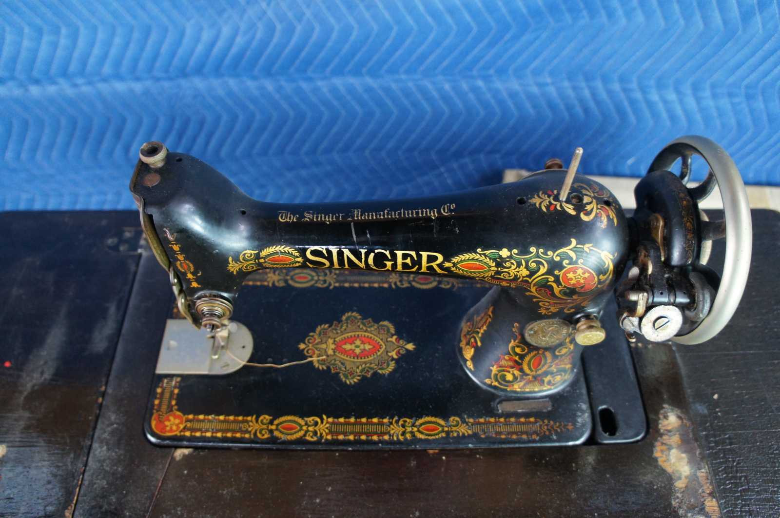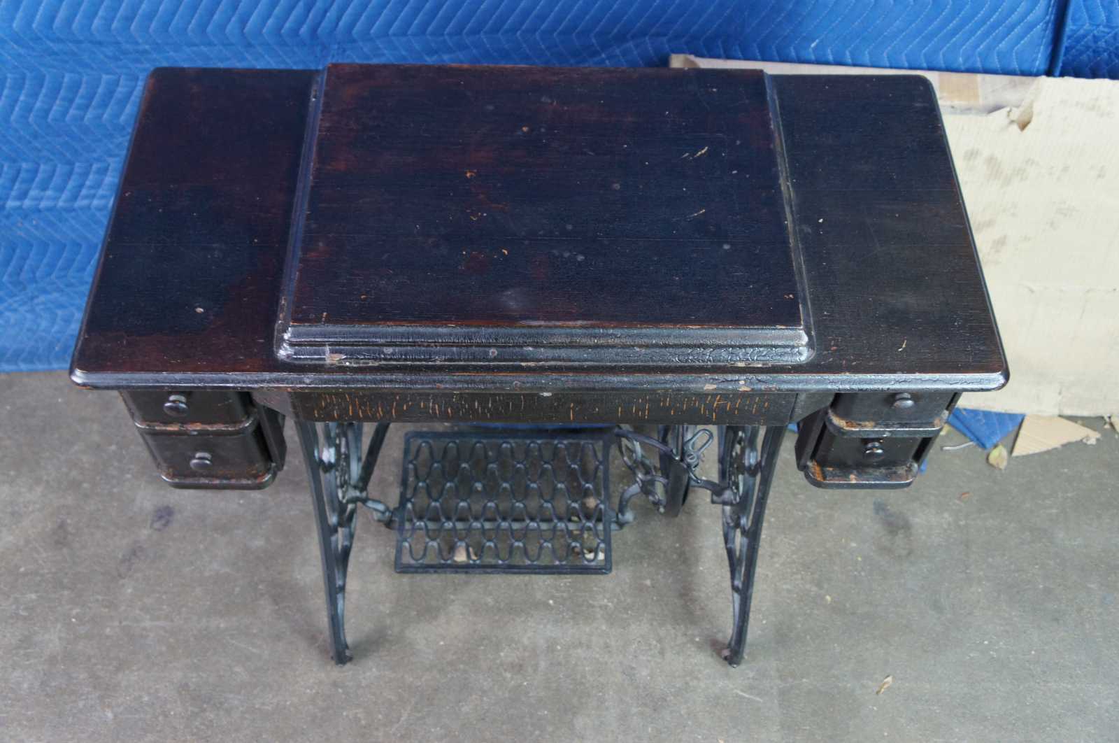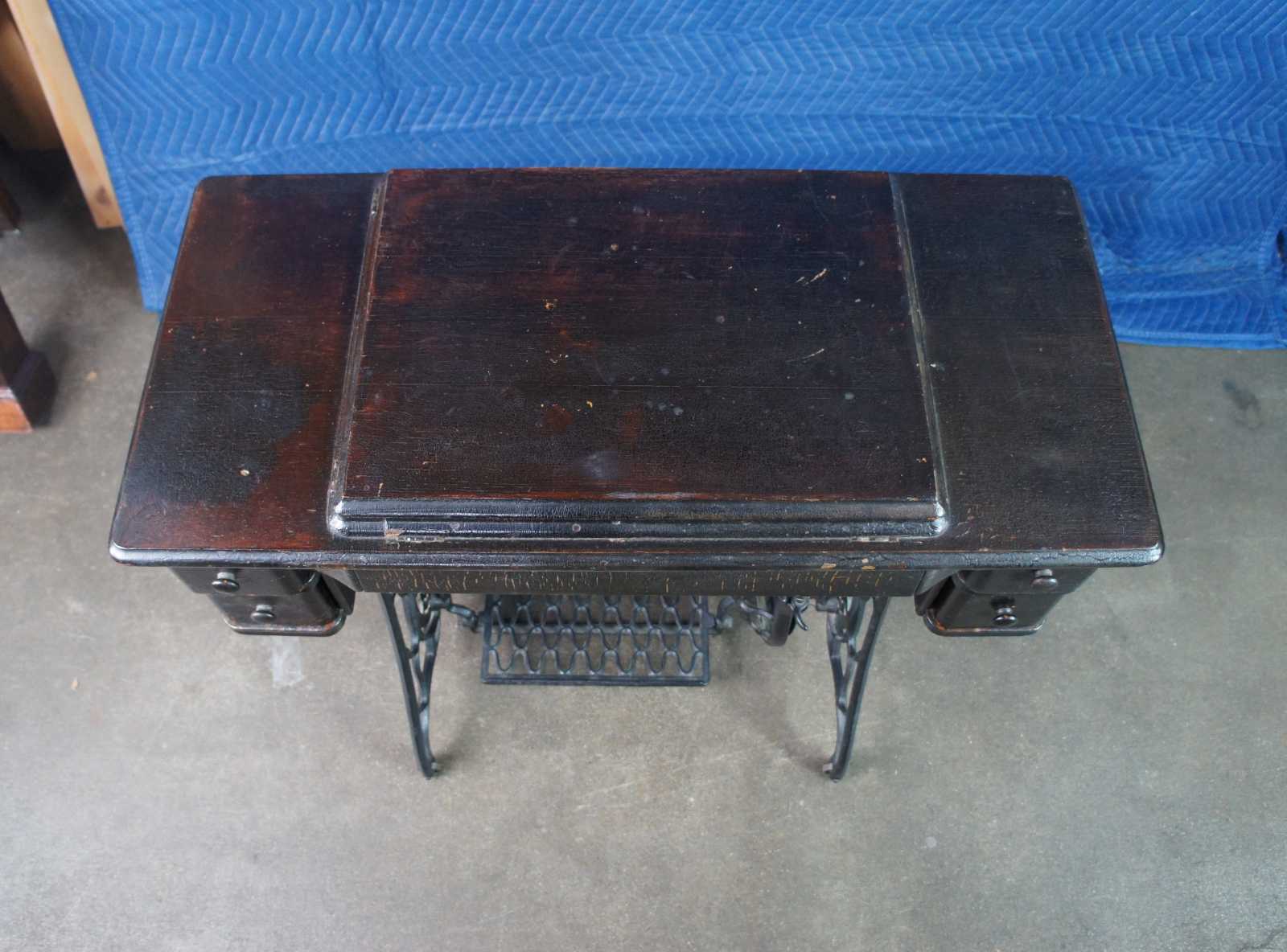 Antique 1919 Singer Red Eye treadle sewing machine and cast iron and wood case / cabinet / work table, model 66, serial #G6611194.