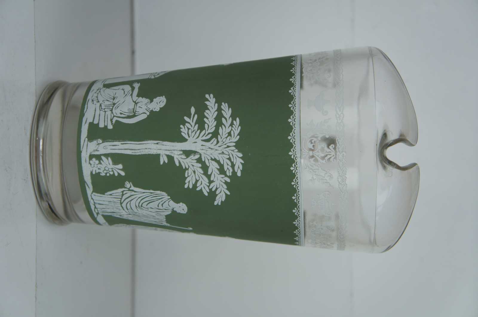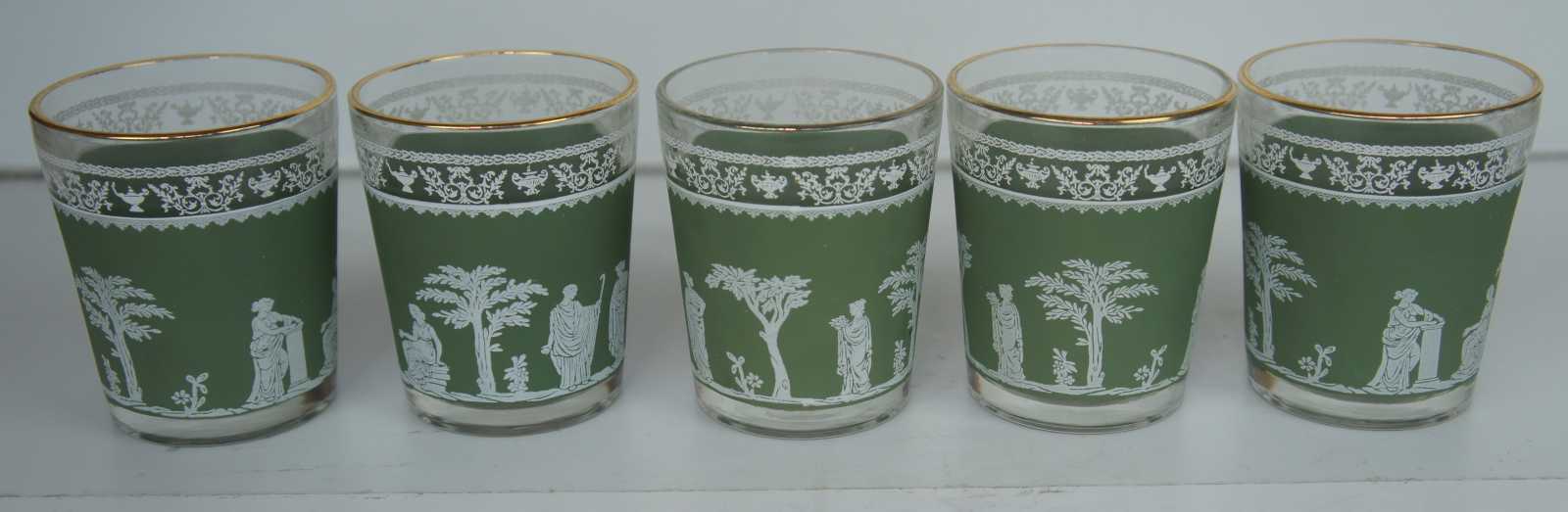 Lot of 32 pieces of Jeanettee Wedgwood, circa mid 20th century. A great cocktail set or addition to current barware. Green and white with grecian or hellenic pattern.