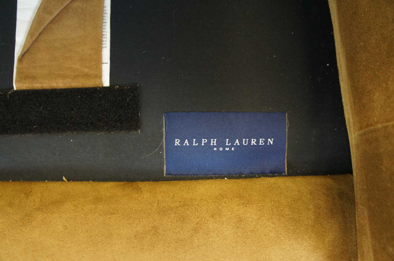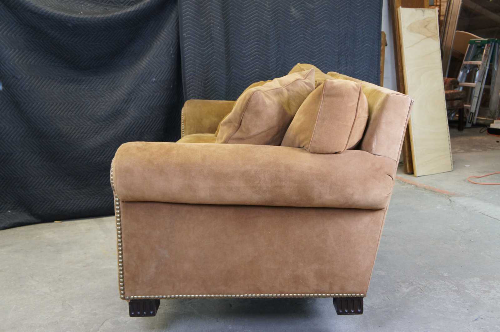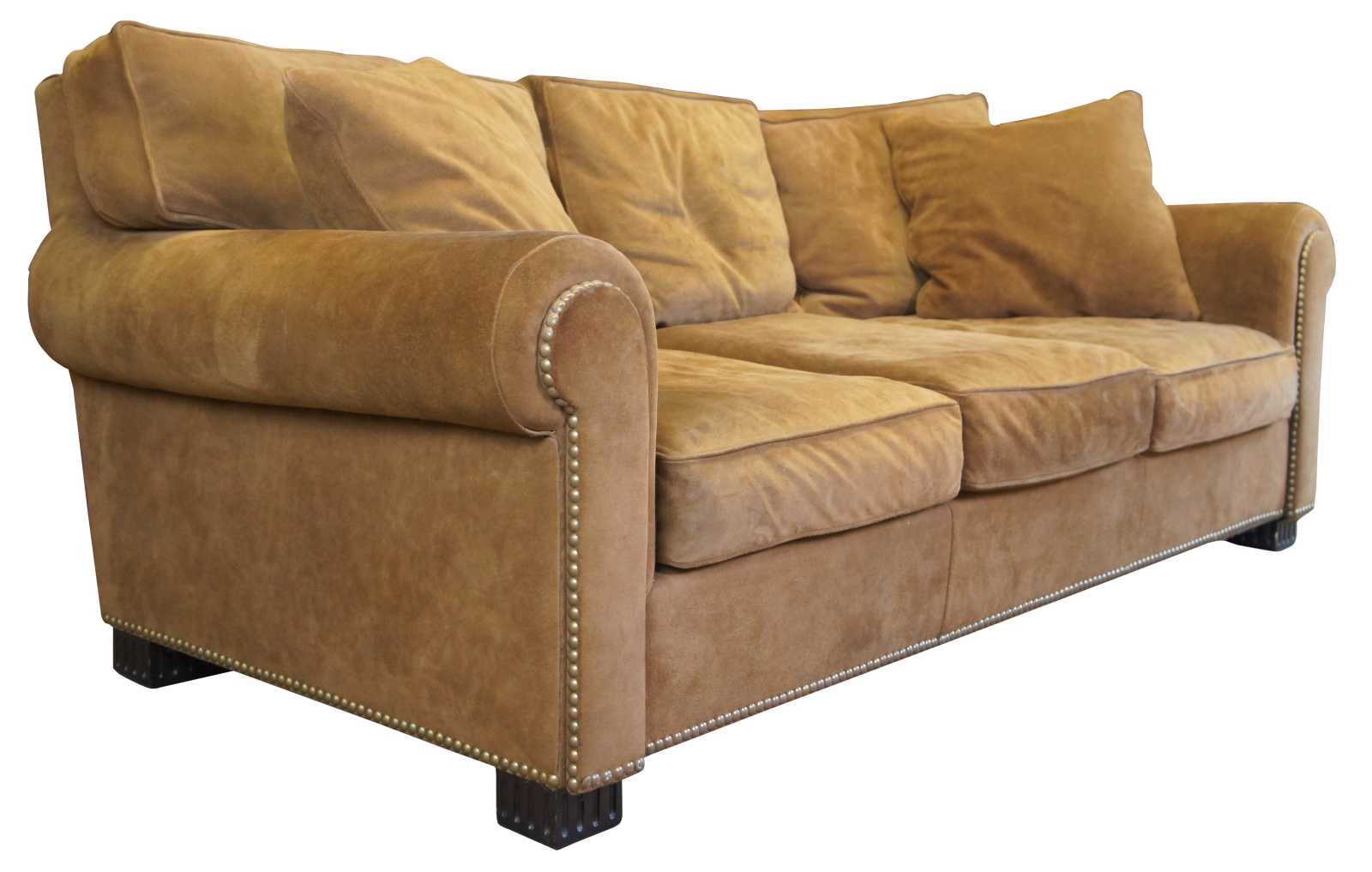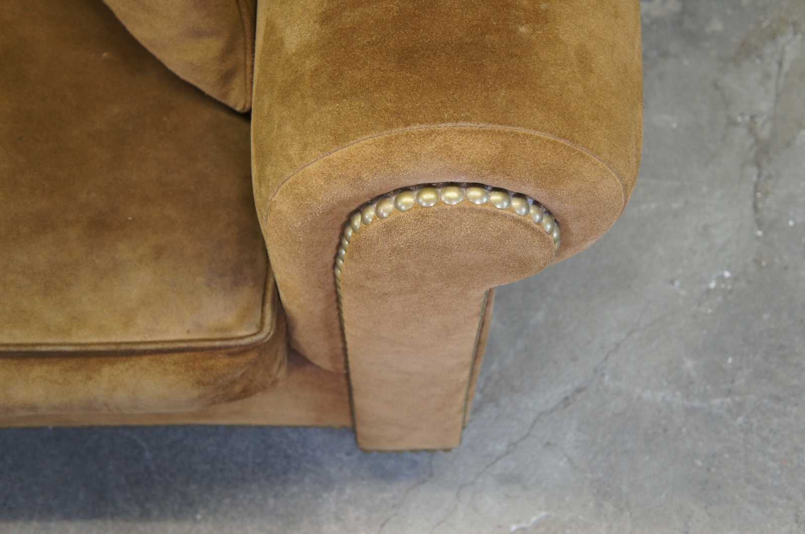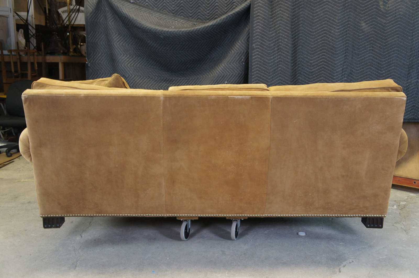 Pair of two vintage 2008 Ralph Lauren Henredon Jamaica Salon three seat sofas. Inspired by elegant island living, the Jamaica salon sofa provides plush, comfortable seating with a small-scale profile. Resting on low reeded block feet with gentle roll arms, the soft contours are expertly upholstered by hand and accented with classic nailhead trim. Finished in light brown / tan / camel suede. LR650 - 10 - 08008671. MSRP $15,815/each