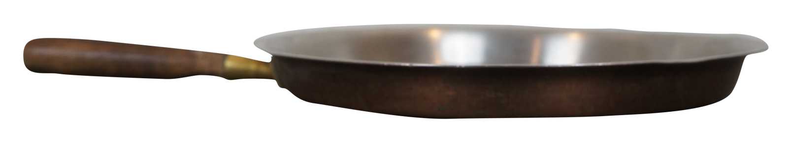 Vintage French copper skilled / crepe / frying pan featuring tin lining with wood handle.