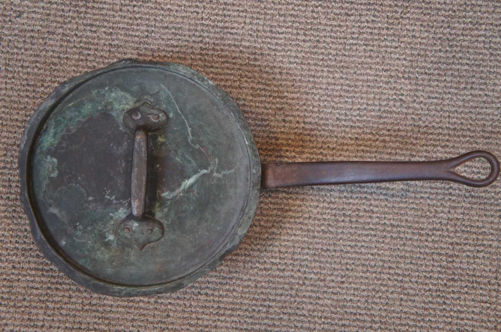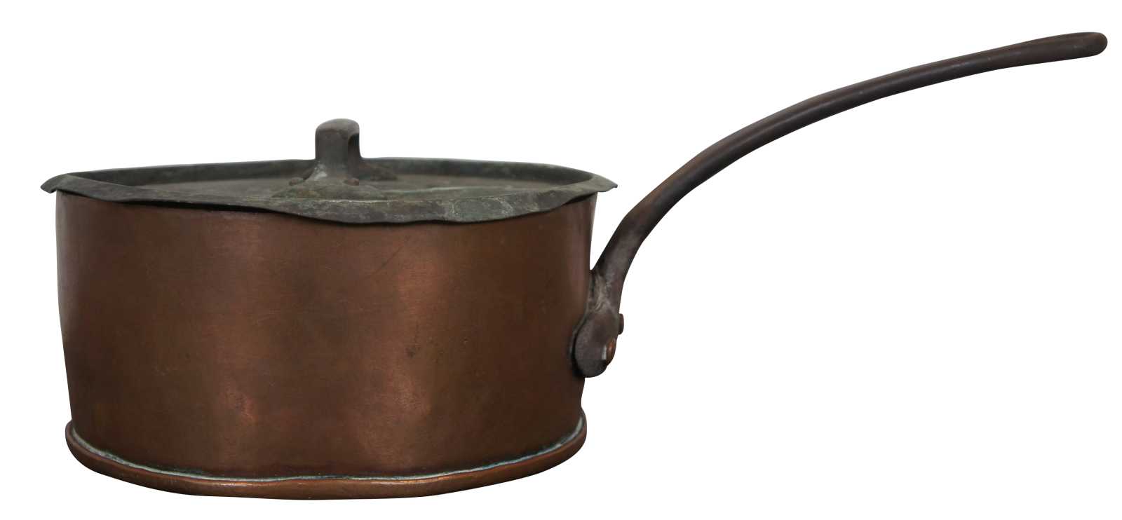 Antique French copper cook pot or saute pan featuring cast iron handle and lid.