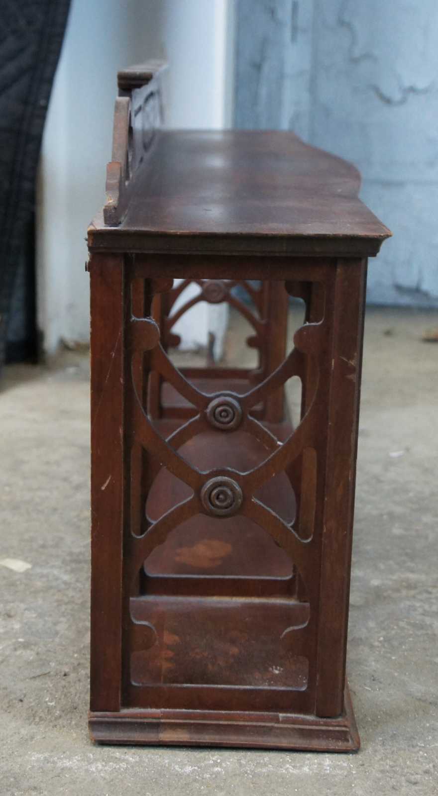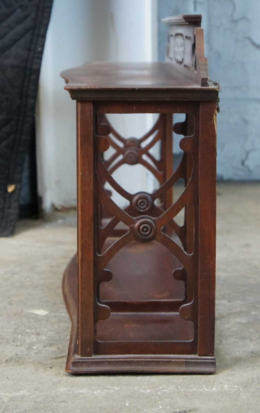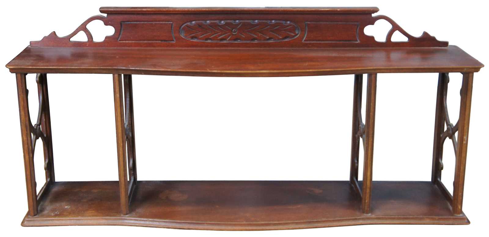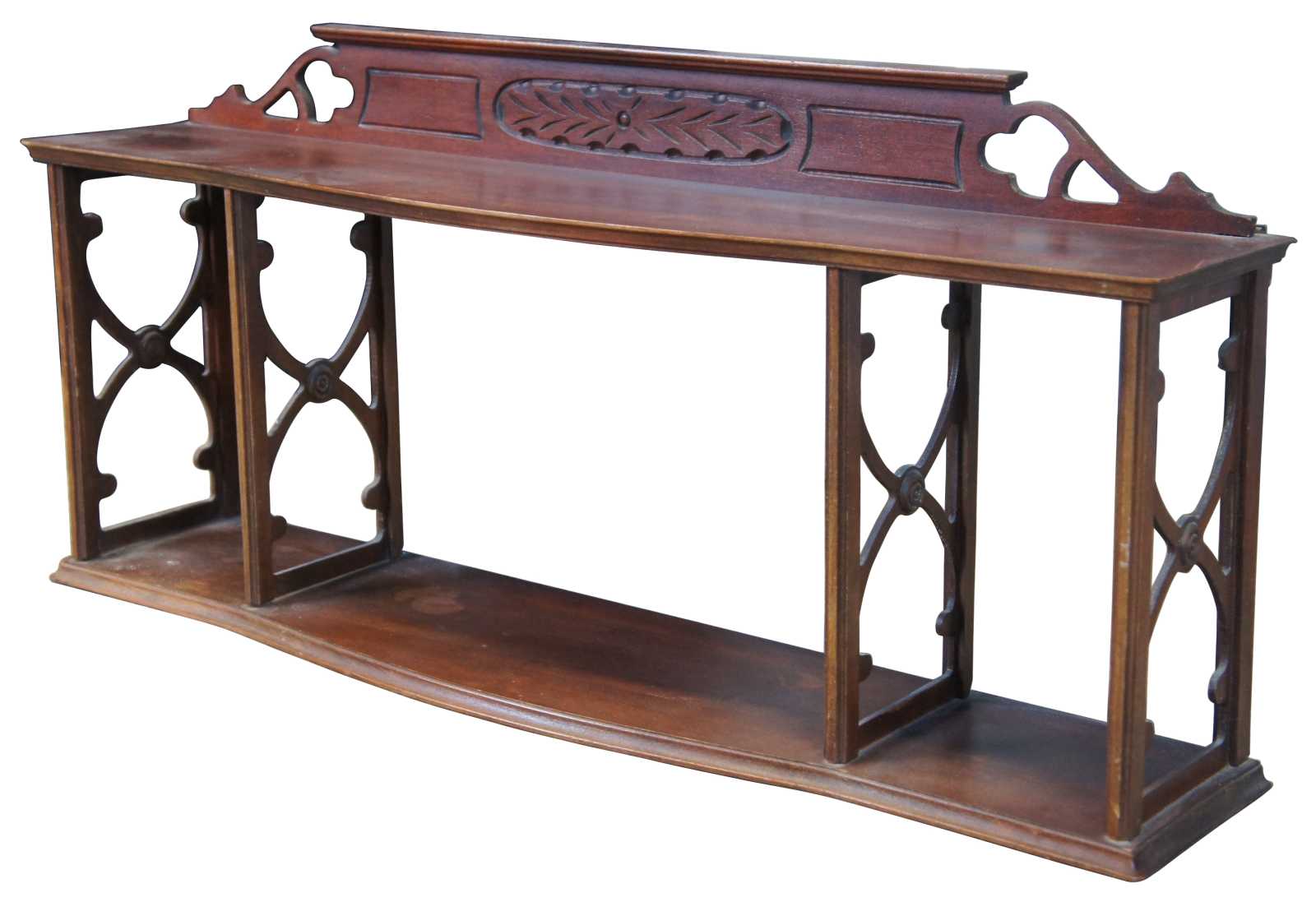 Mid 20th century serpentine wall hanging shelf. Made from mahogany with an open frame featuring x shaped fretwork and pierced backsplash. Includes button shaped medallions and a carved backsplash.