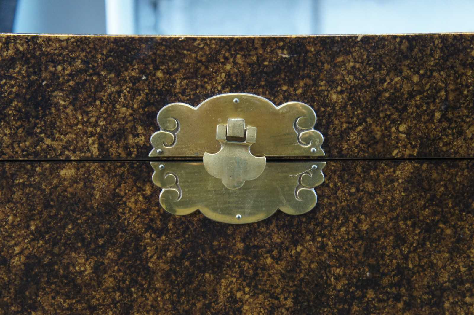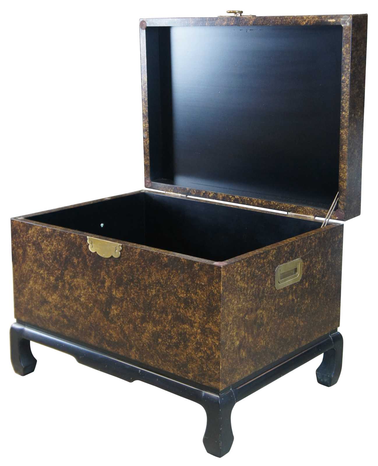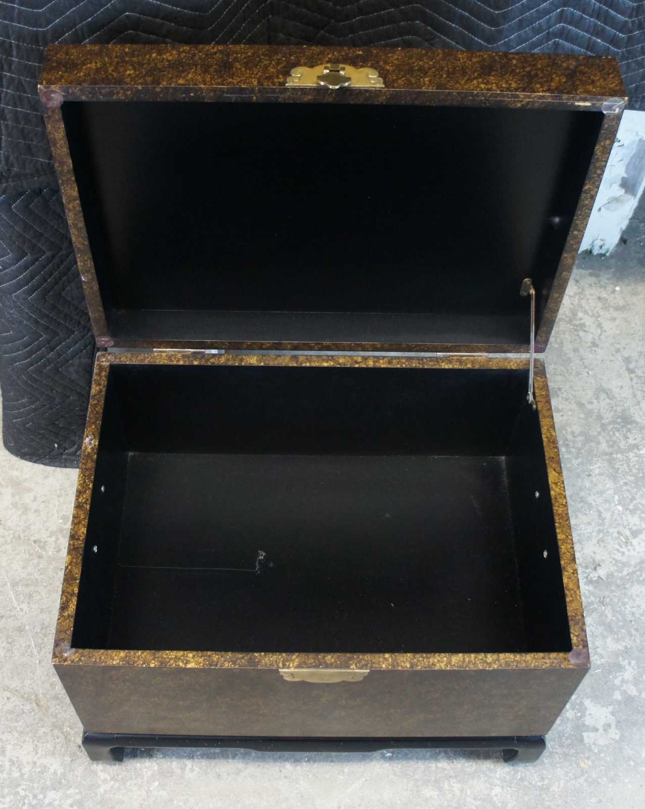 Late 20 the century Chinese trunk on stand. Made from hardwood with a mottled gold finish and black lacquer Ming style base. Includes brass hardware with recessed brass handles along each side. Box is mounted to base.