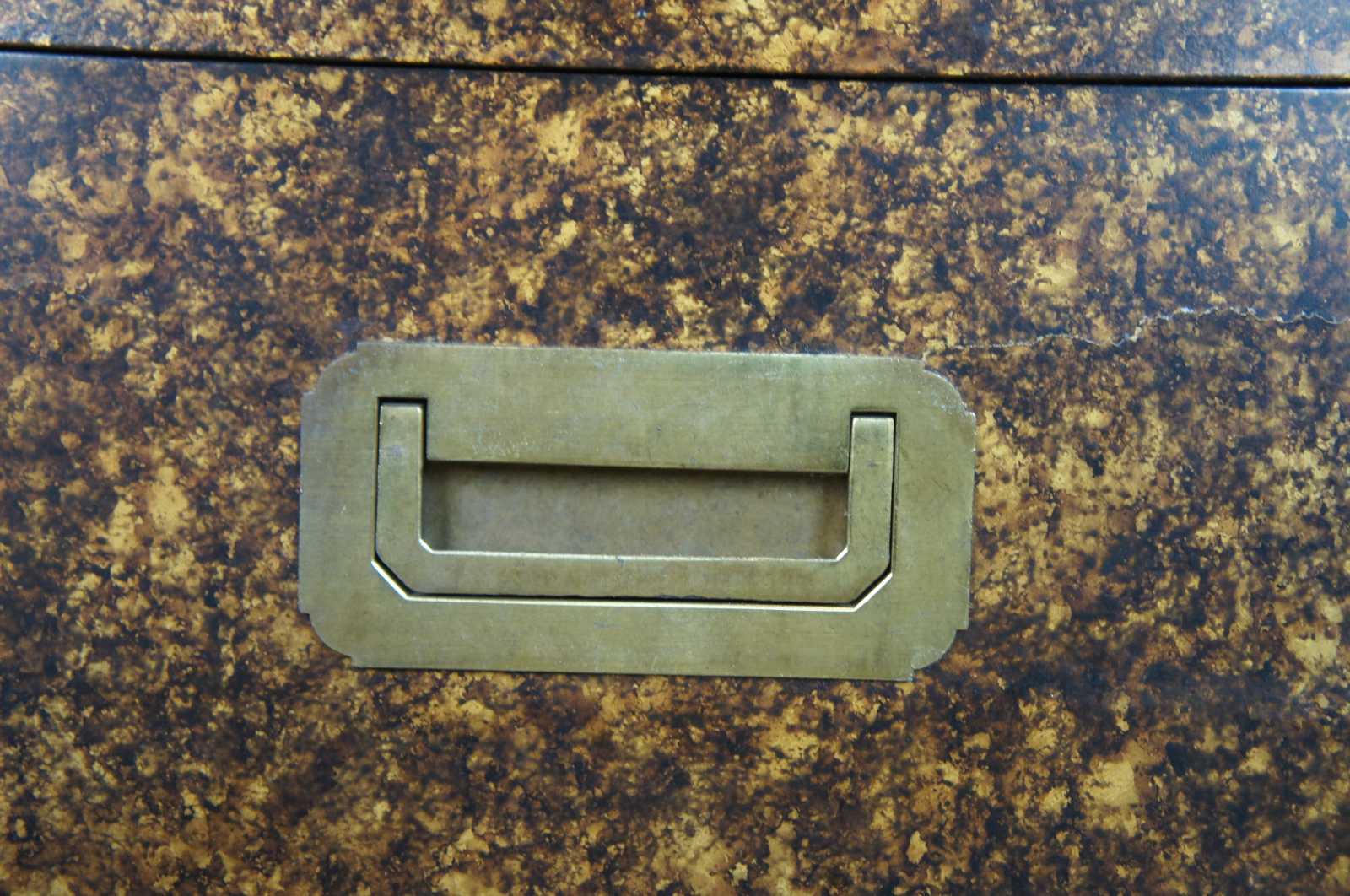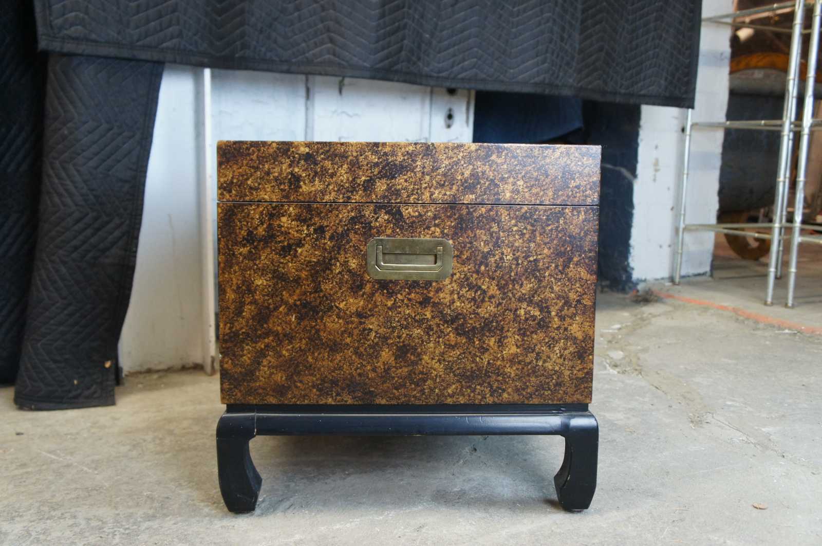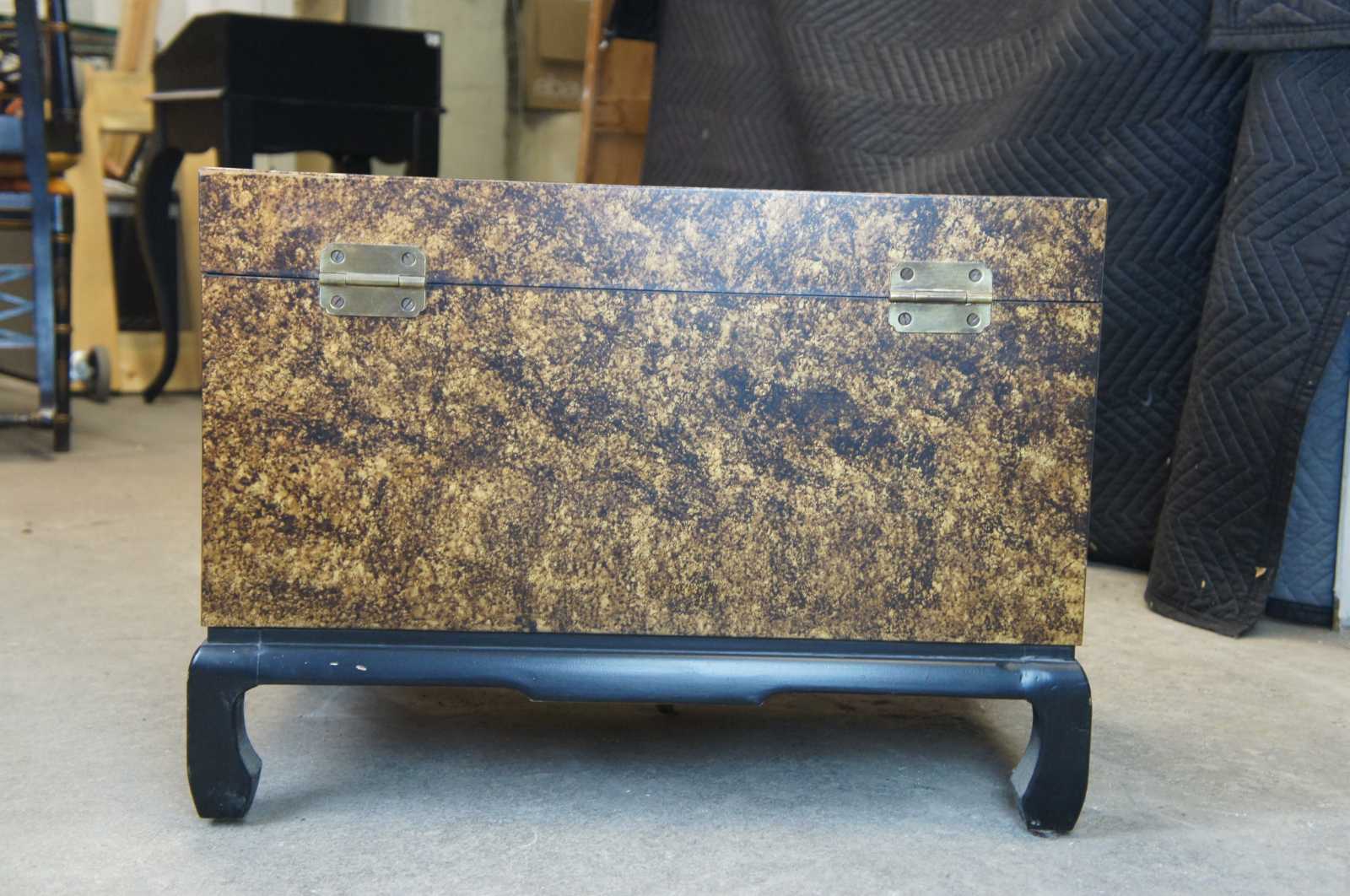 Late 20 the century Chinese trunk on stand. Made from hardwood with a mottled gold finish and black lacquer Ming style base. Includes brass hardware with recessed brass handles along each side. Box is mounted to base.