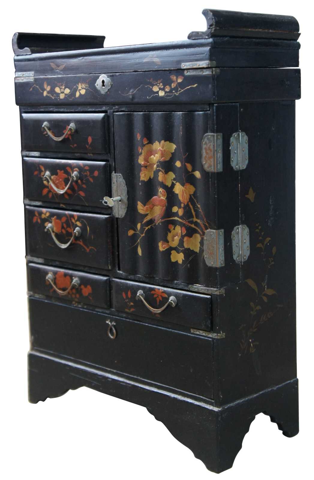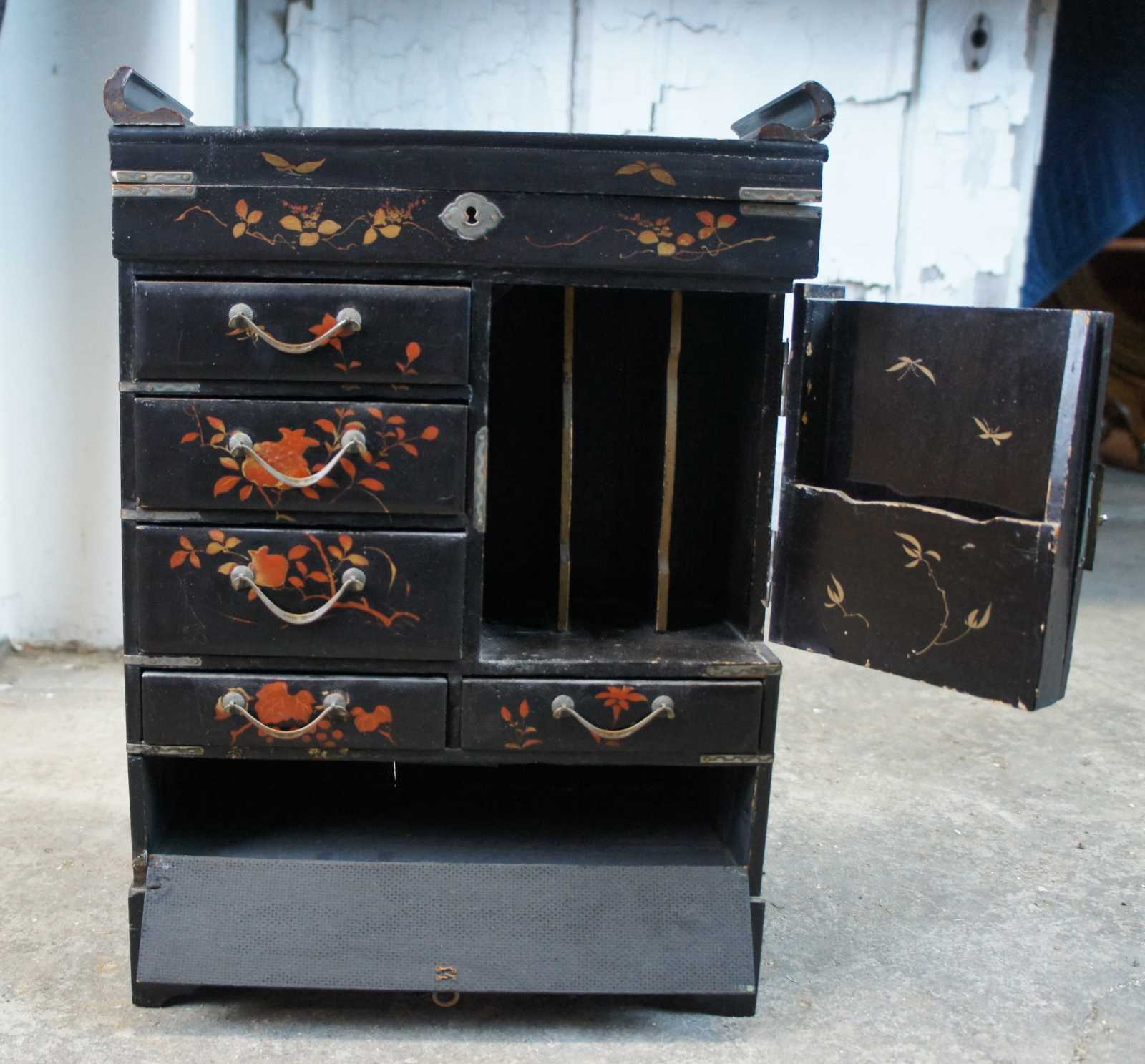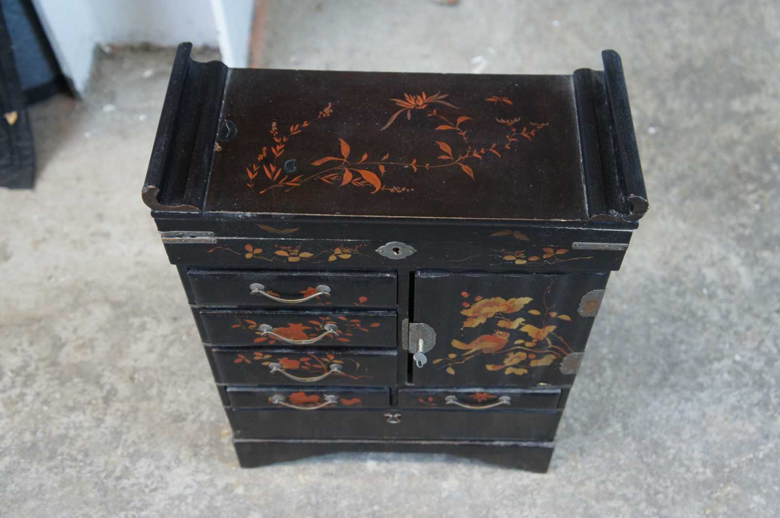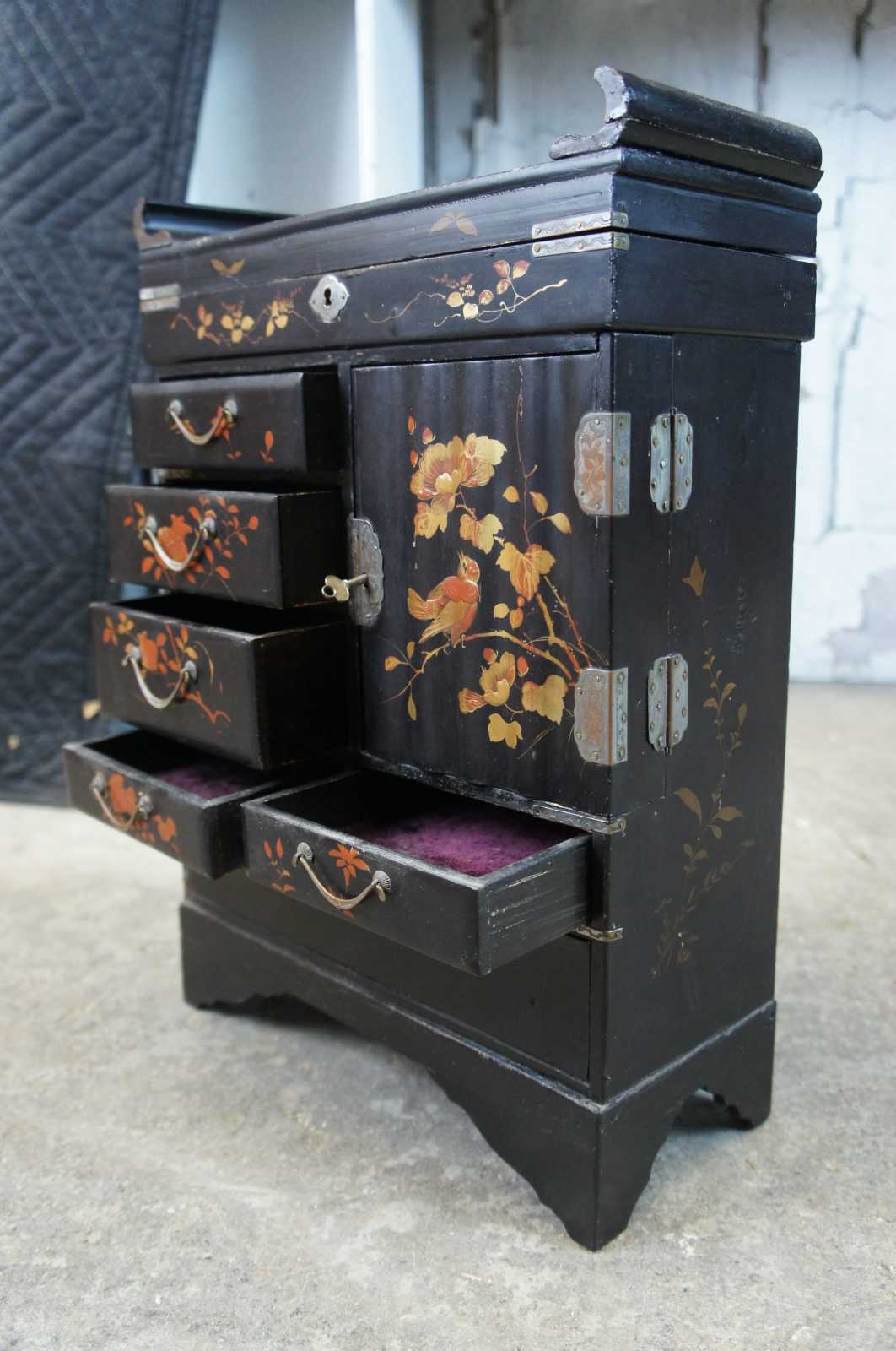 Antique Japanese Meiji Period vanity box in the form of a miniature armoire / chifferobe or Tallboy dresser, circa late 19th century. A rectangular form made from wood with black lacquer finish. Hand painted in red and gold featuring a foliate and bird design. Includes 5 drawers, cabinet with interior dividers, trapdoor below and upper sectioned compartment. The chest is supported by bracket feet and comes with the original key. The perfect organizer for curiosities, rings, necklaces and other jewelry.