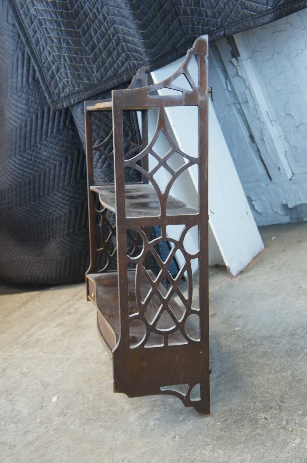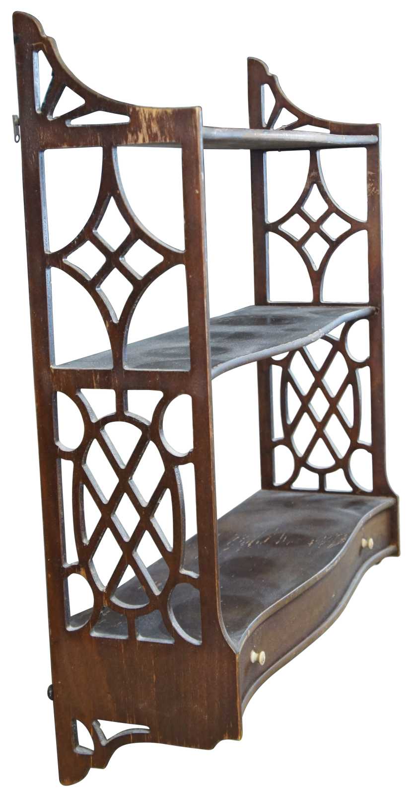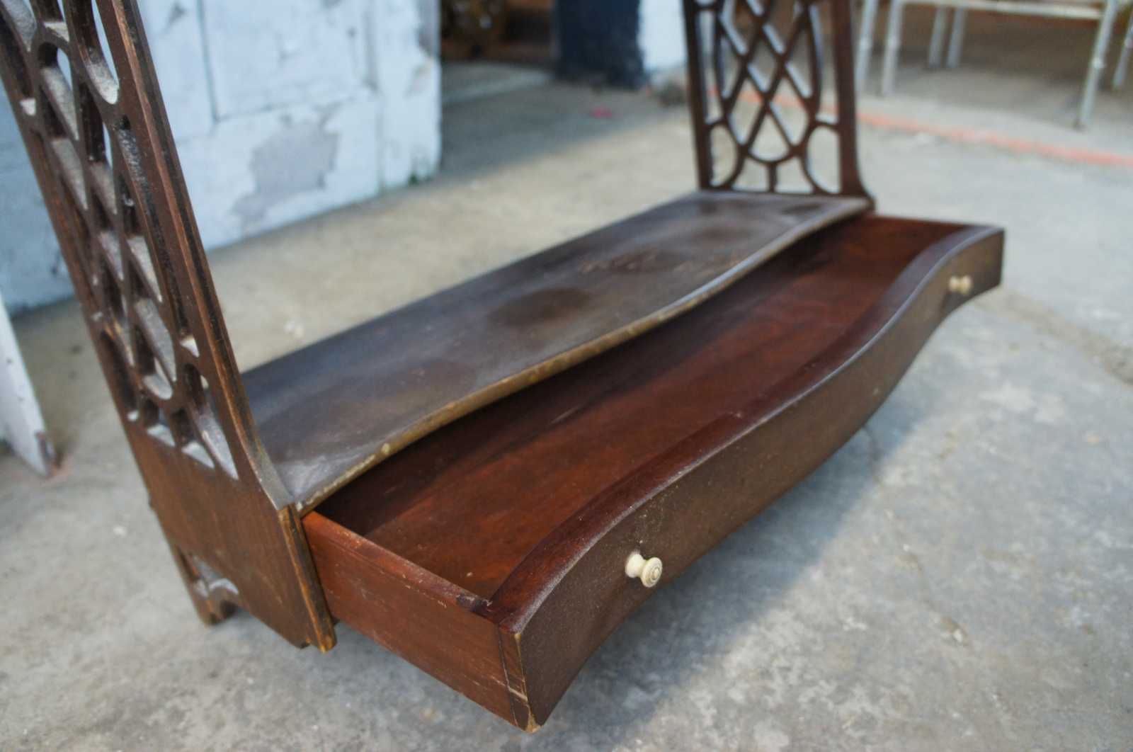 Mid 20th century Chippendale style Lewis Butler wall shelf, #131. A serpentine form made from mahogany with fretwork siding and lower drawer.
