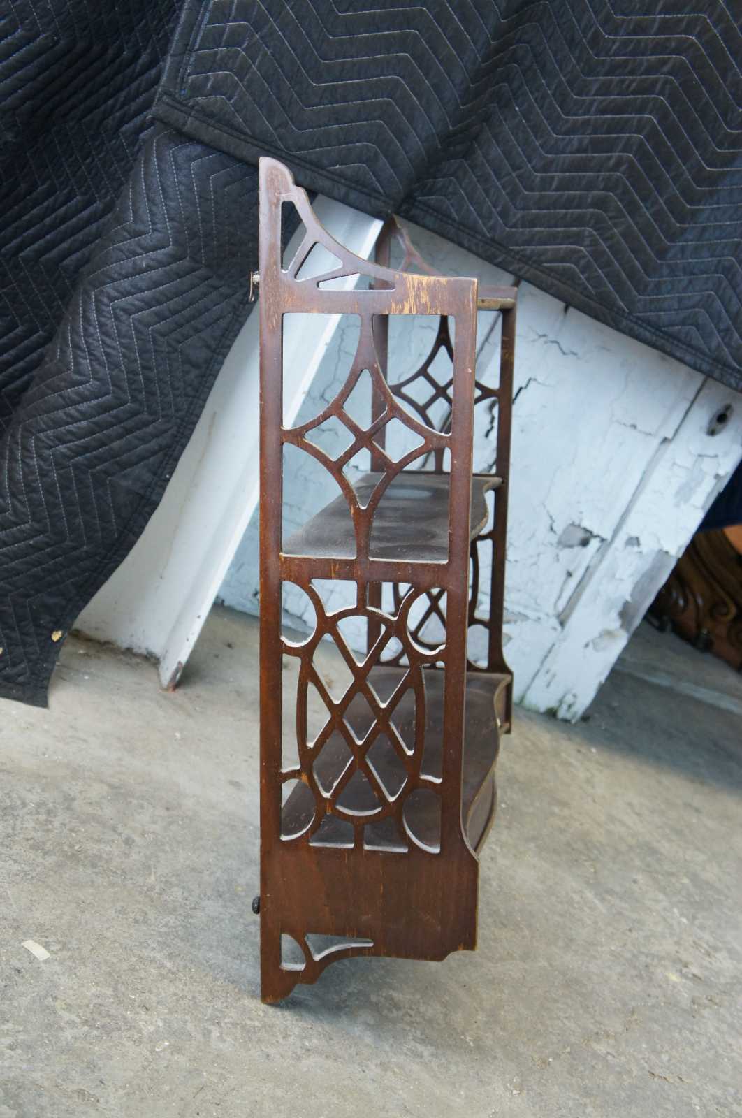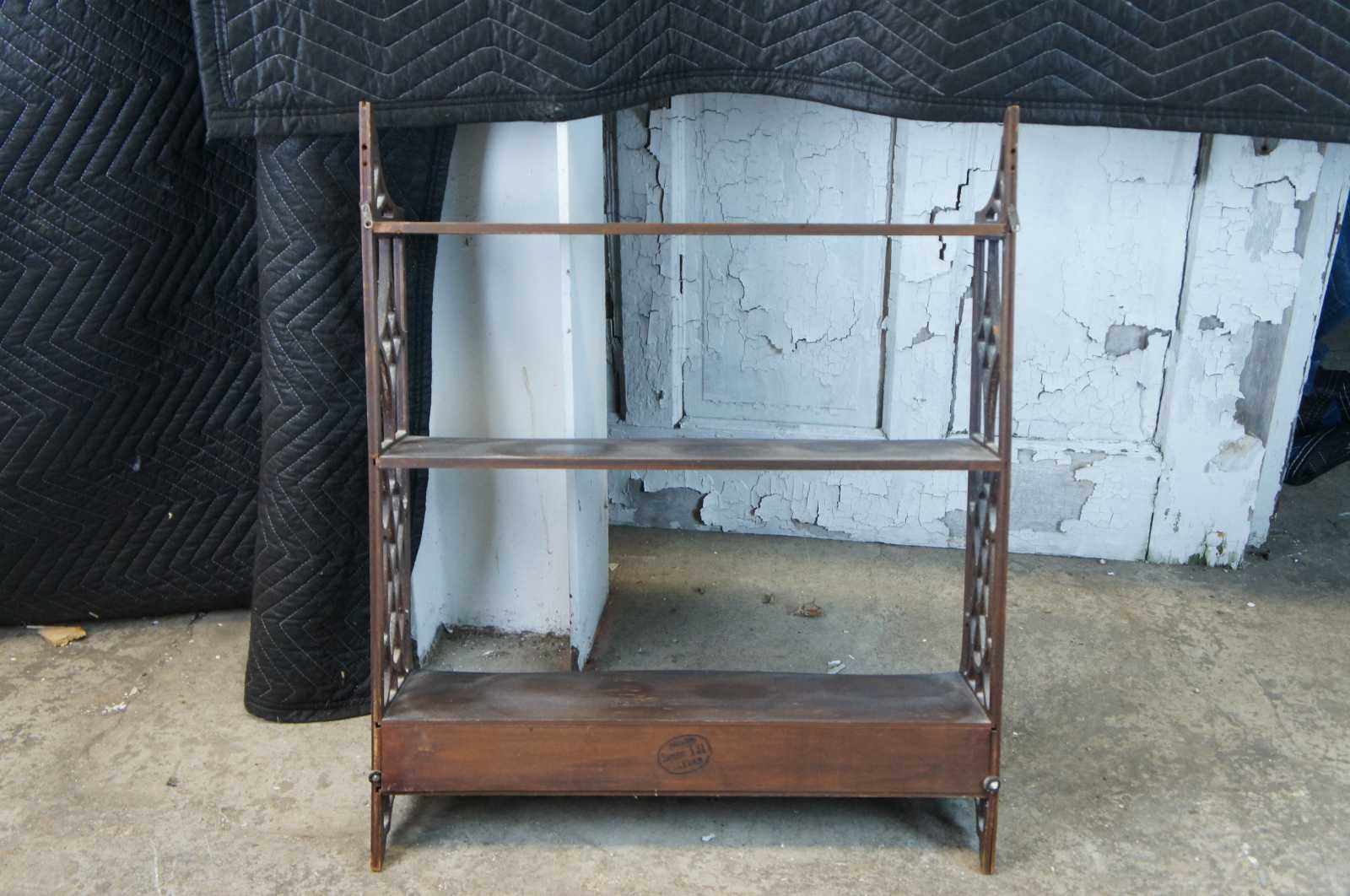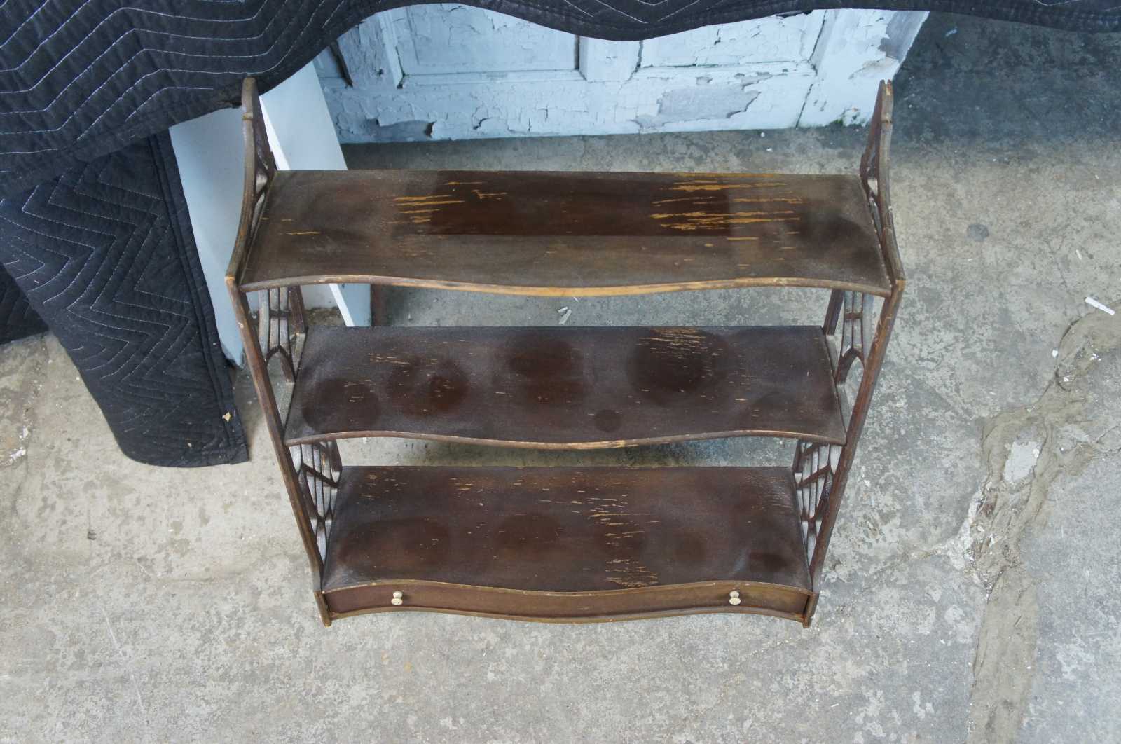 Mid 20th century Chippendale style Lewis Butler wall shelf, #131. A serpentine form made from mahogany with fretwork siding and lower drawer.