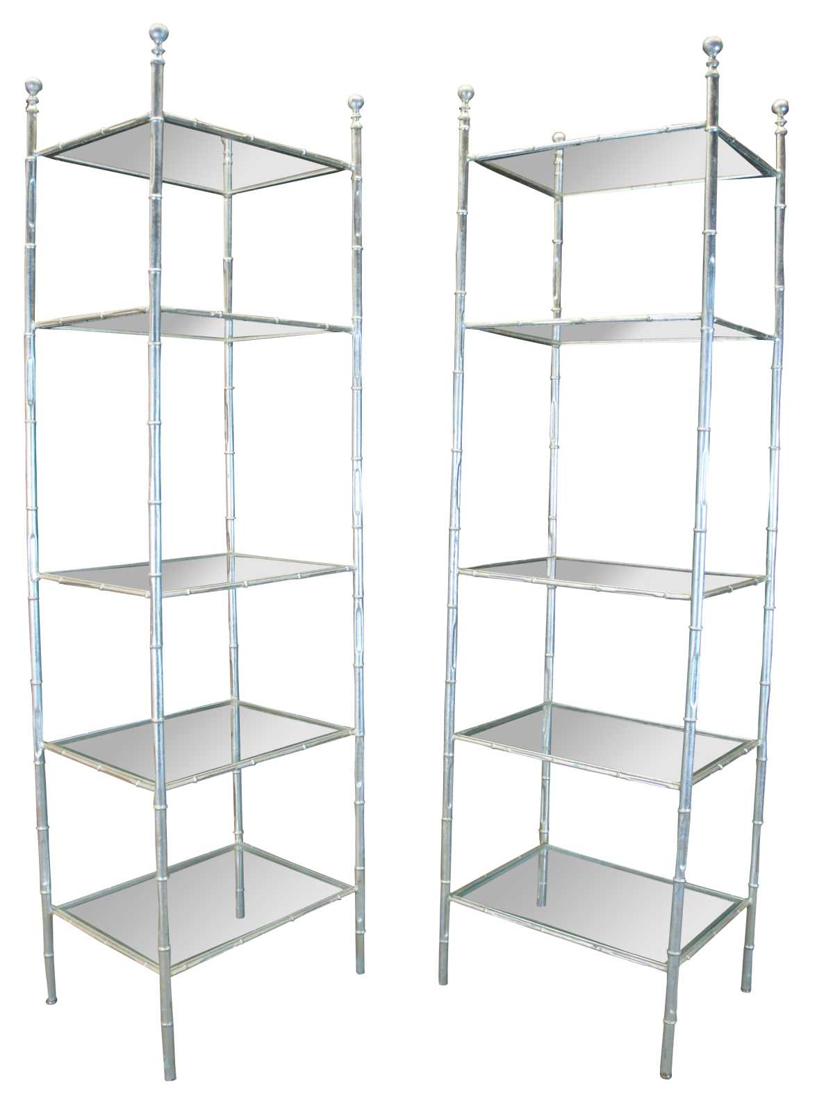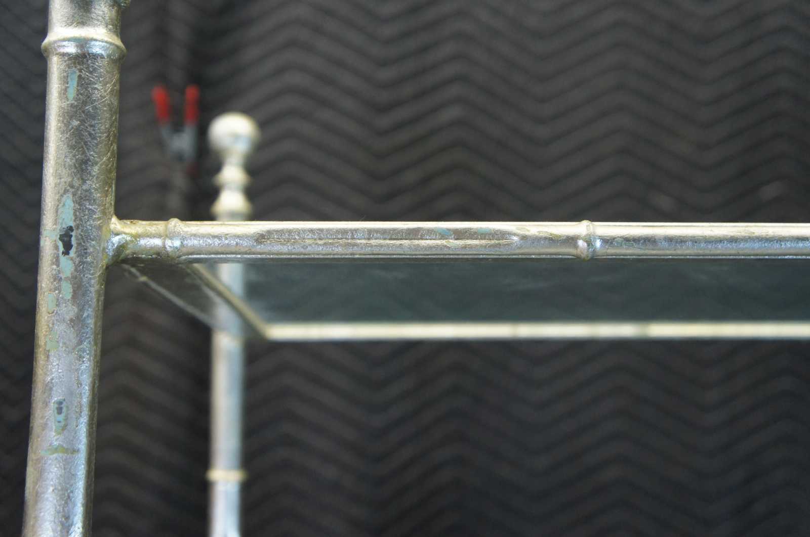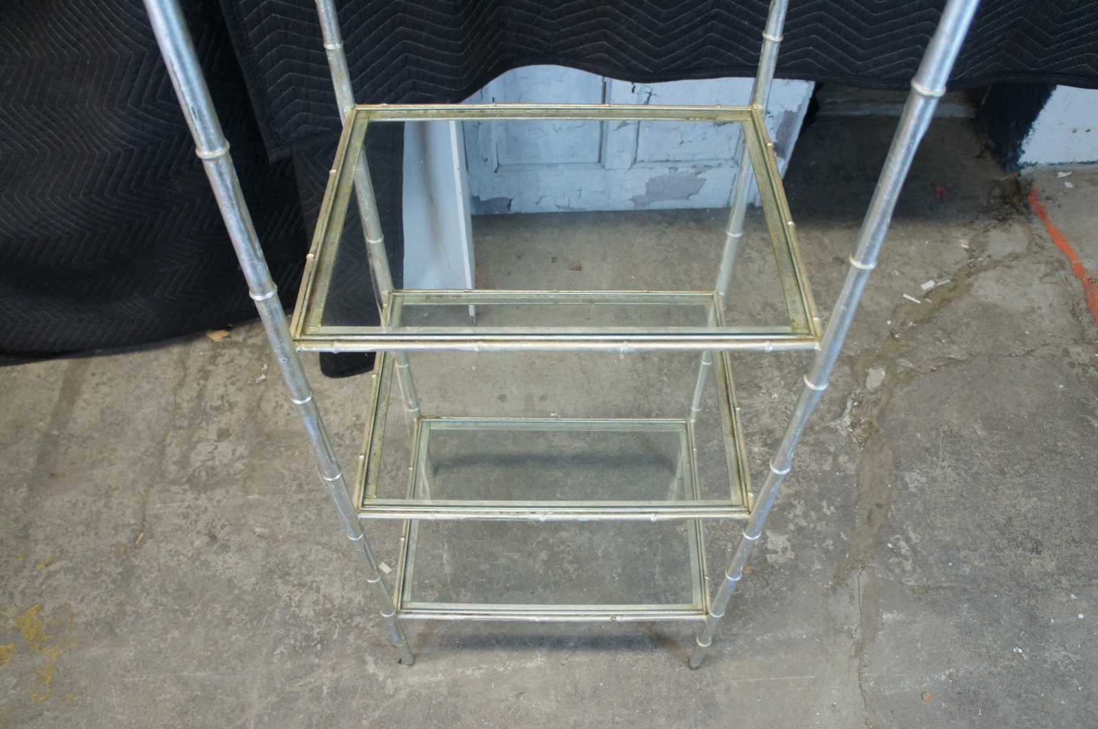 2 Vintage silver leaf metal etagere in faux bamboo modern design with glass shelves and ball finials.
