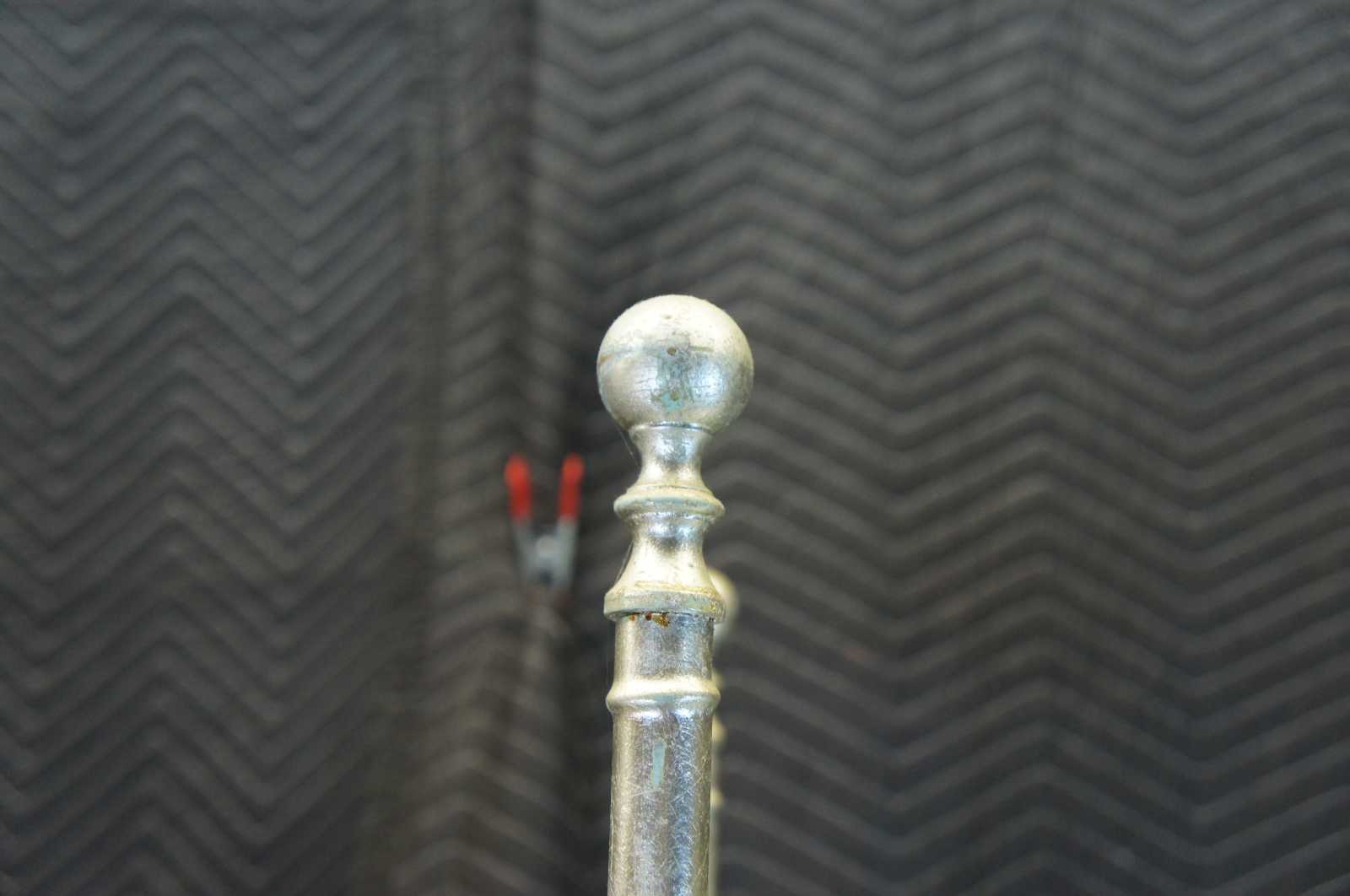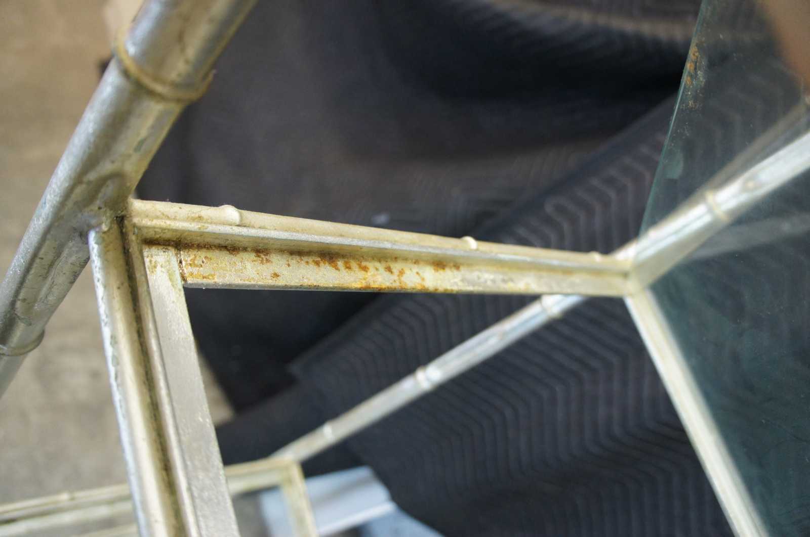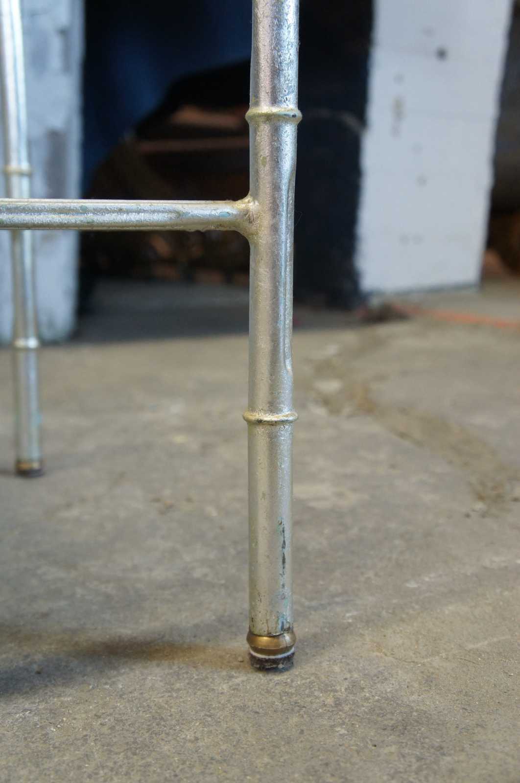 2 Vintage silver leaf metal etagere in faux bamboo modern design with glass shelves and ball finials.