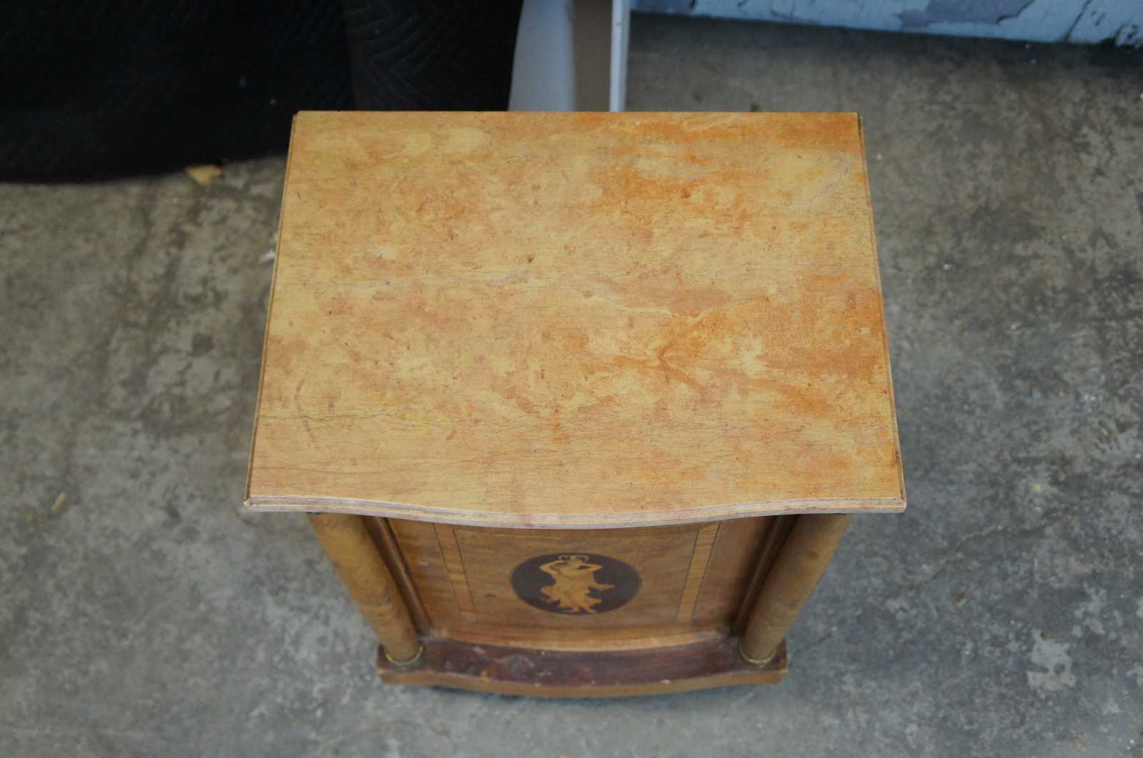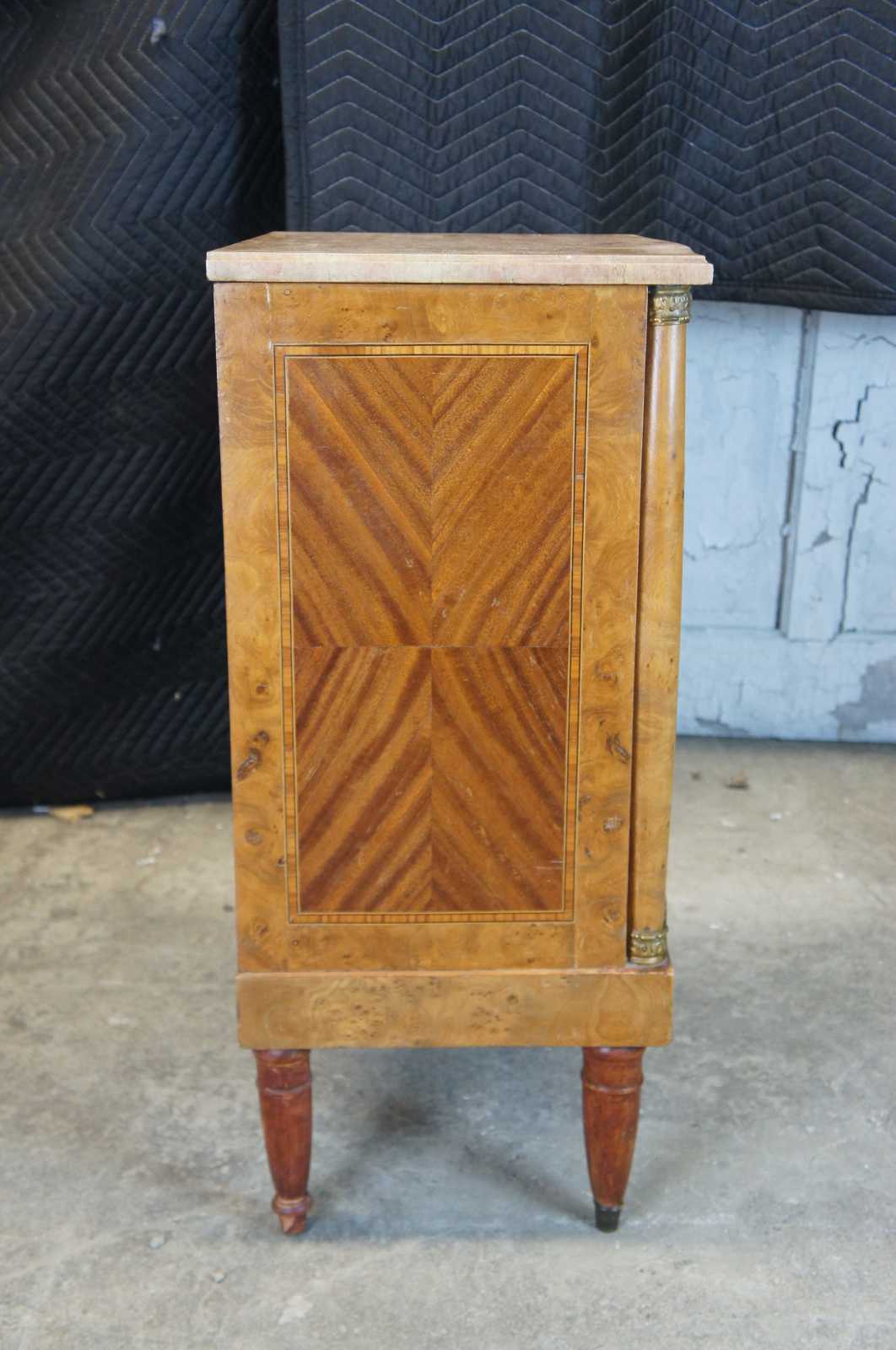 A beautiful Italian Neoclassical nightstand or chevet table from the last quarter of the 19th century. Rectangular in form with slight bowfront and graceful brass capped columns along the front. Made from walnut and olive ash burl with banding, figural inlay and marble top. The central cameo inlay features a Grecian woman holding an amphora or wine jug on her shoulders.