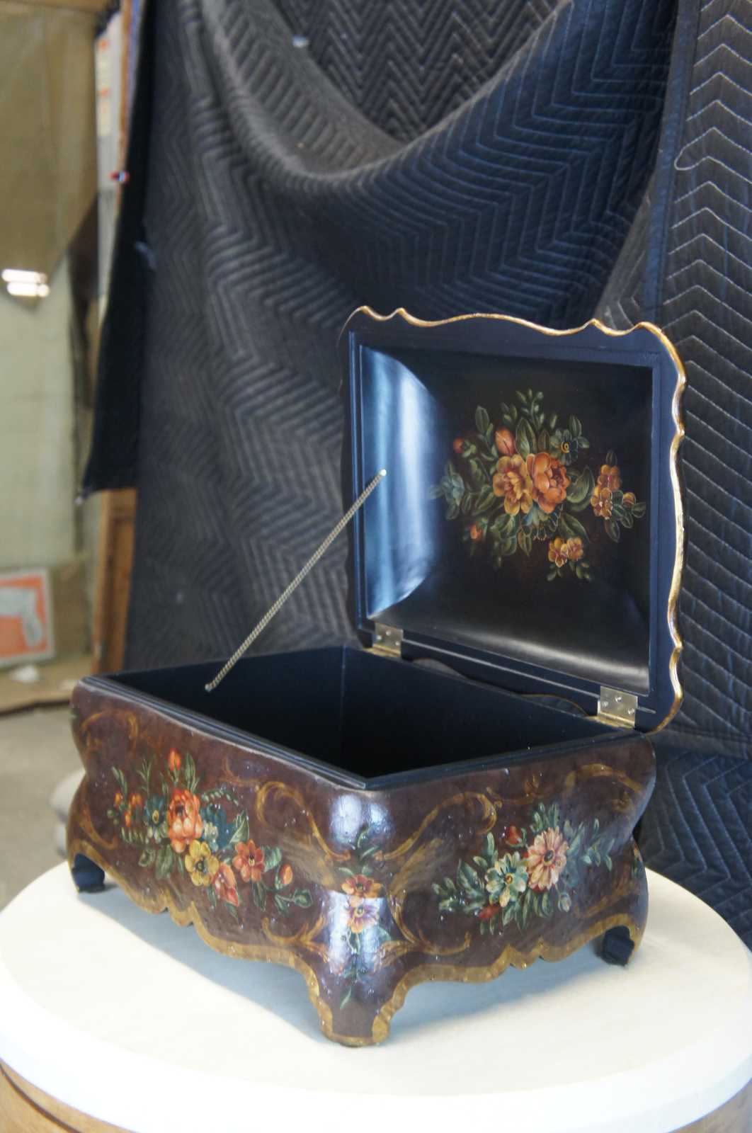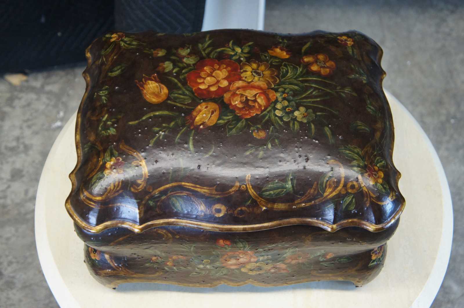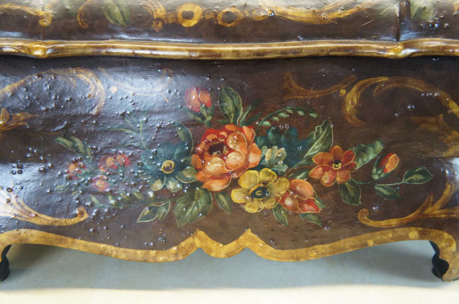 Italian or Baroque Revival chest. Great for decorative use or as a centerpiece or Jewelry Casket. Features a bombe form with hand pianted floral details. Brown with gold trim.