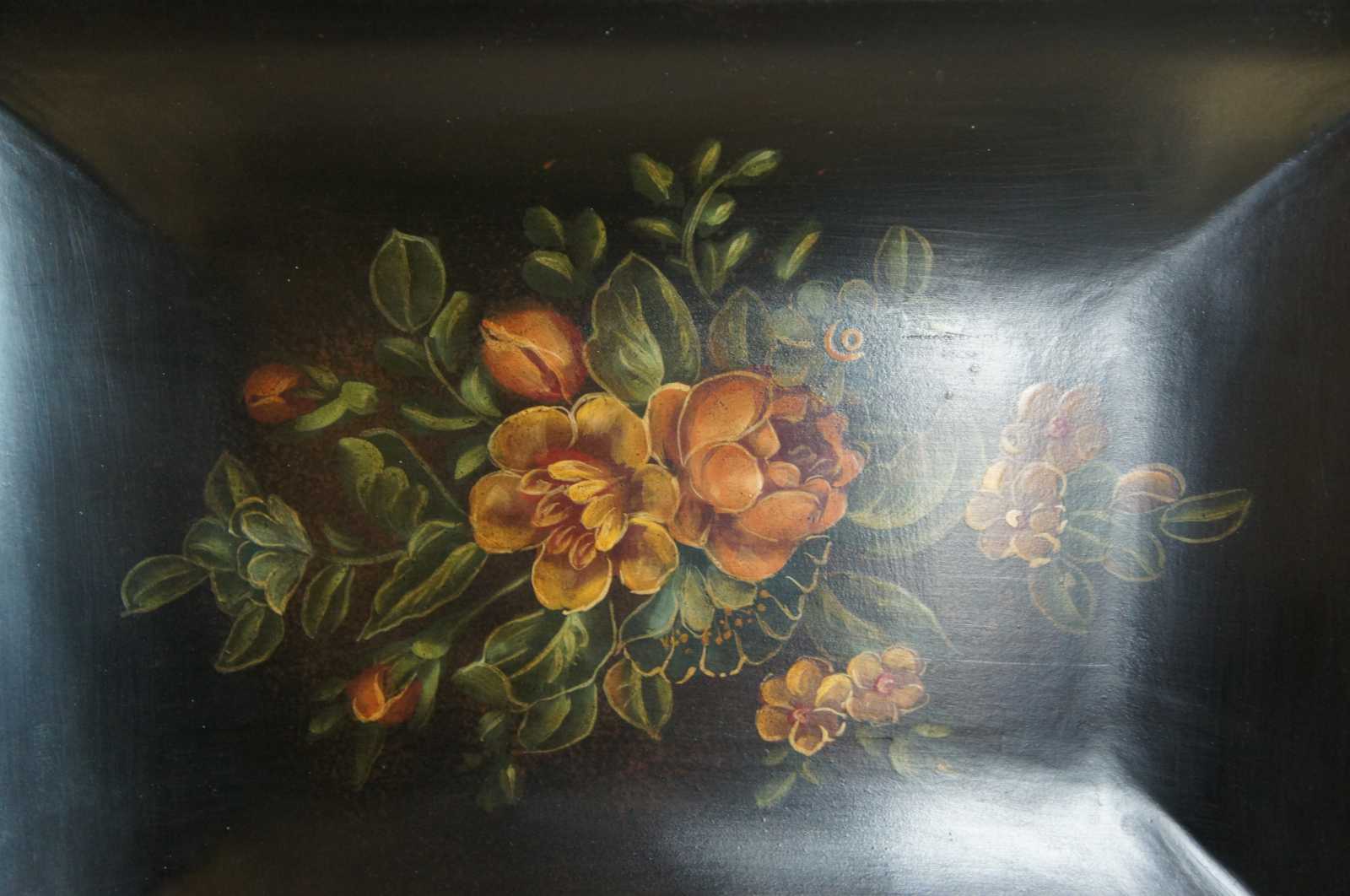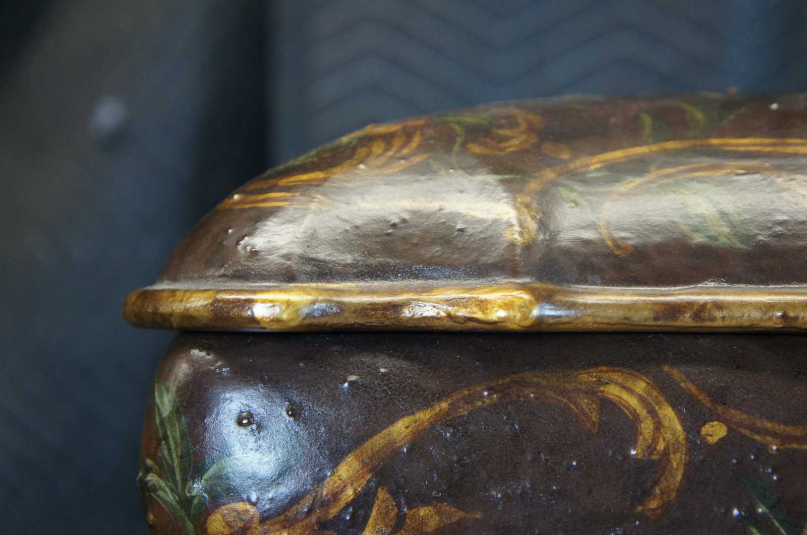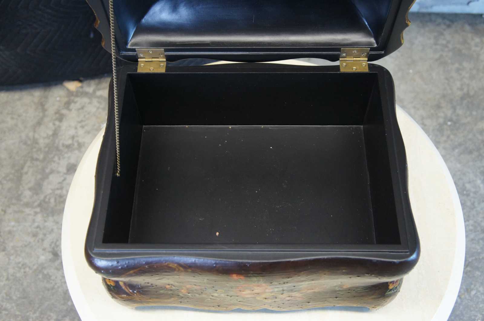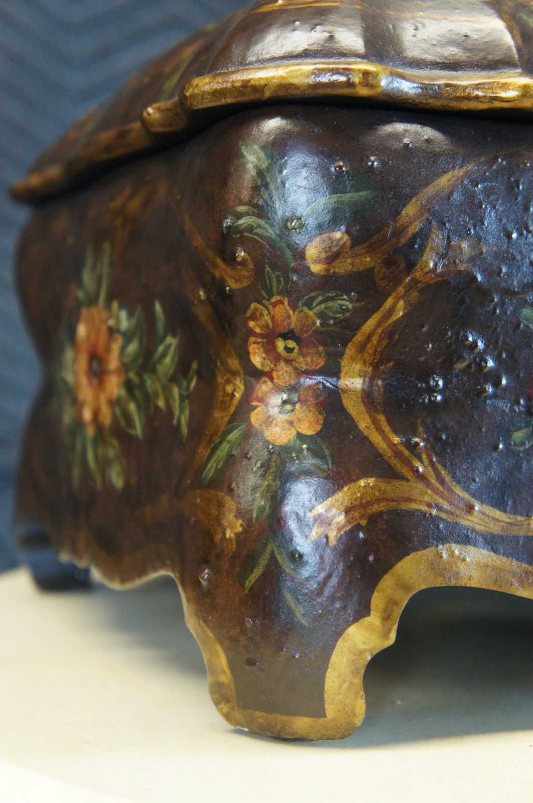 Italian or Baroque Revival chest. Great for decorative use or as a centerpiece or Jewelry Casket. Features a bombe form with hand pianted floral details. Brown with gold trim.