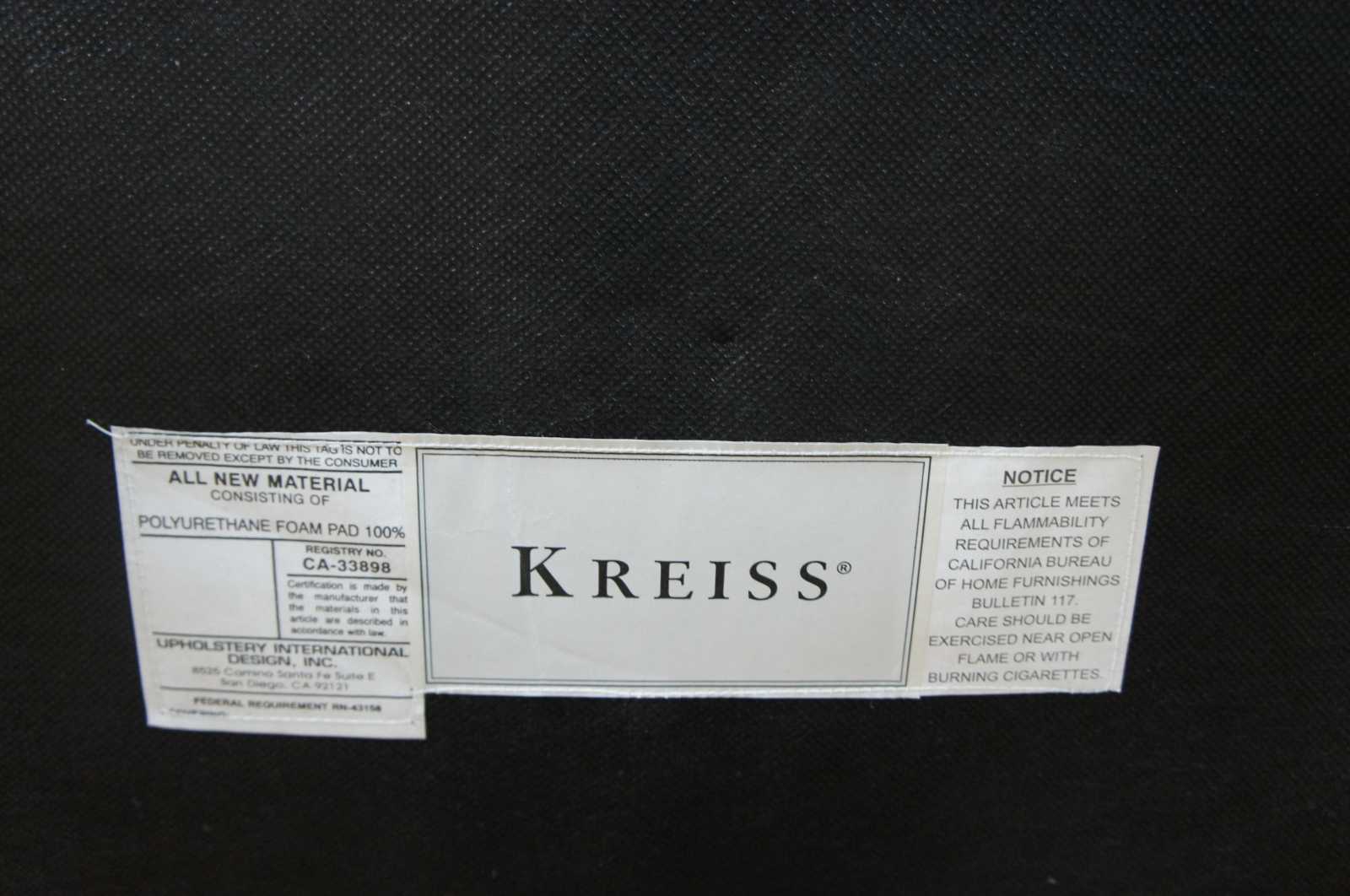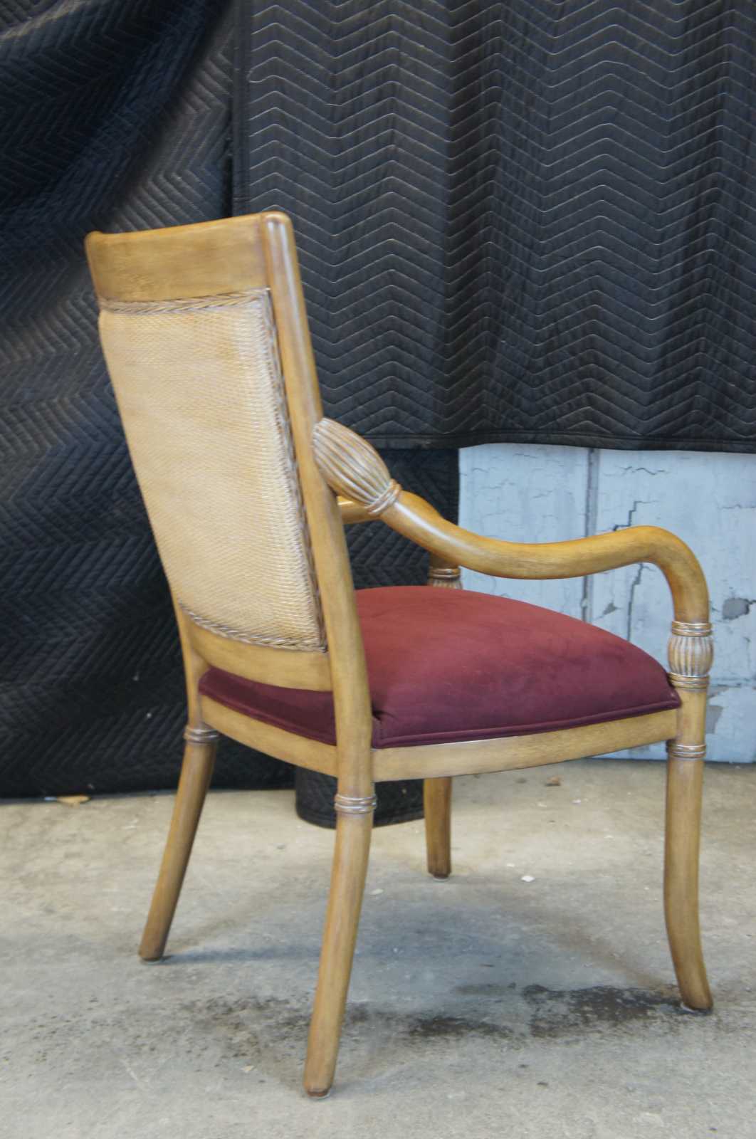 A beautiful pair of Kreiss Luxury Empire style arm chairs. Made from mahogany with a wicker inset backing and swooping arms with bulbous fluted turnings. Upholstered in maroon ultrasuede.