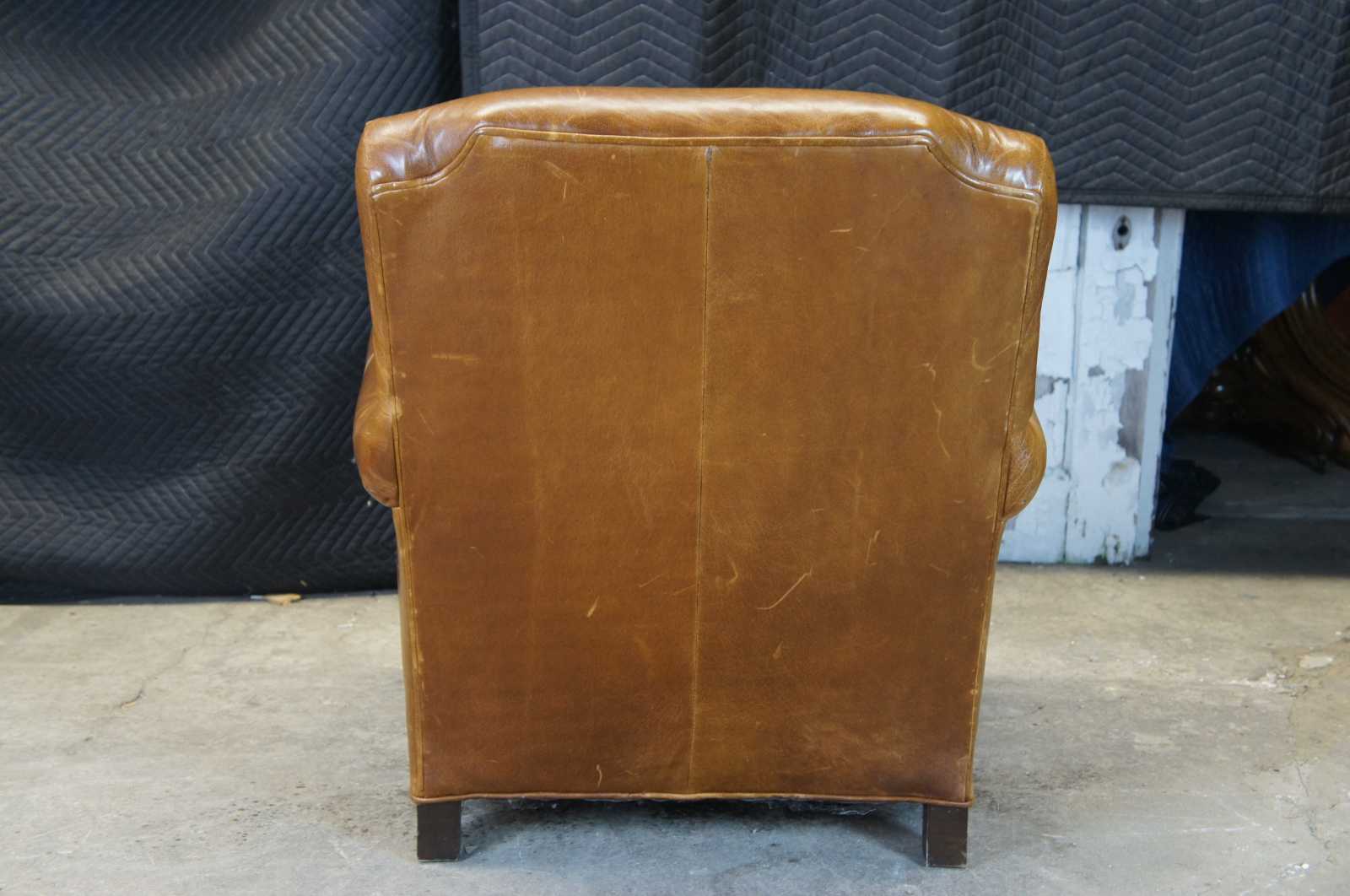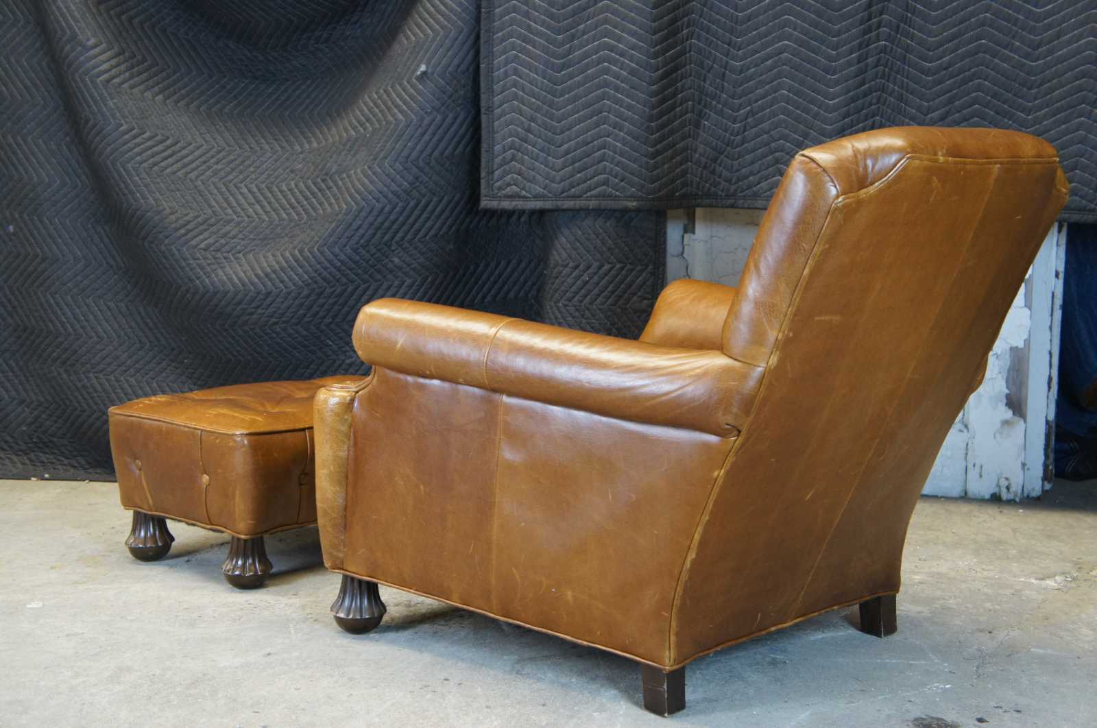 William Alan Inc brown leather club chair, circa 1999 Features a down cushion, rolled arms, tufted seat and ottoman and bun feet.