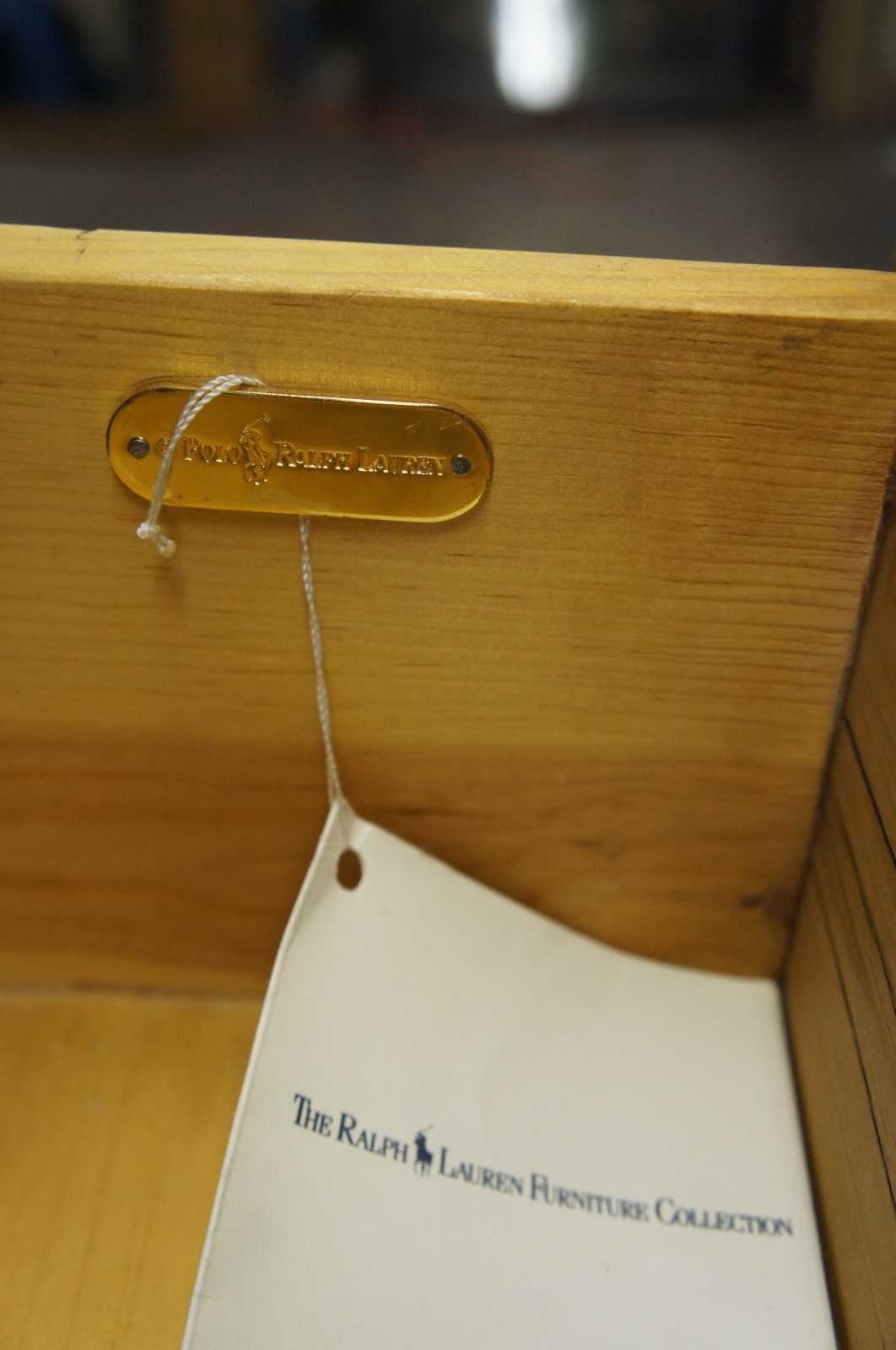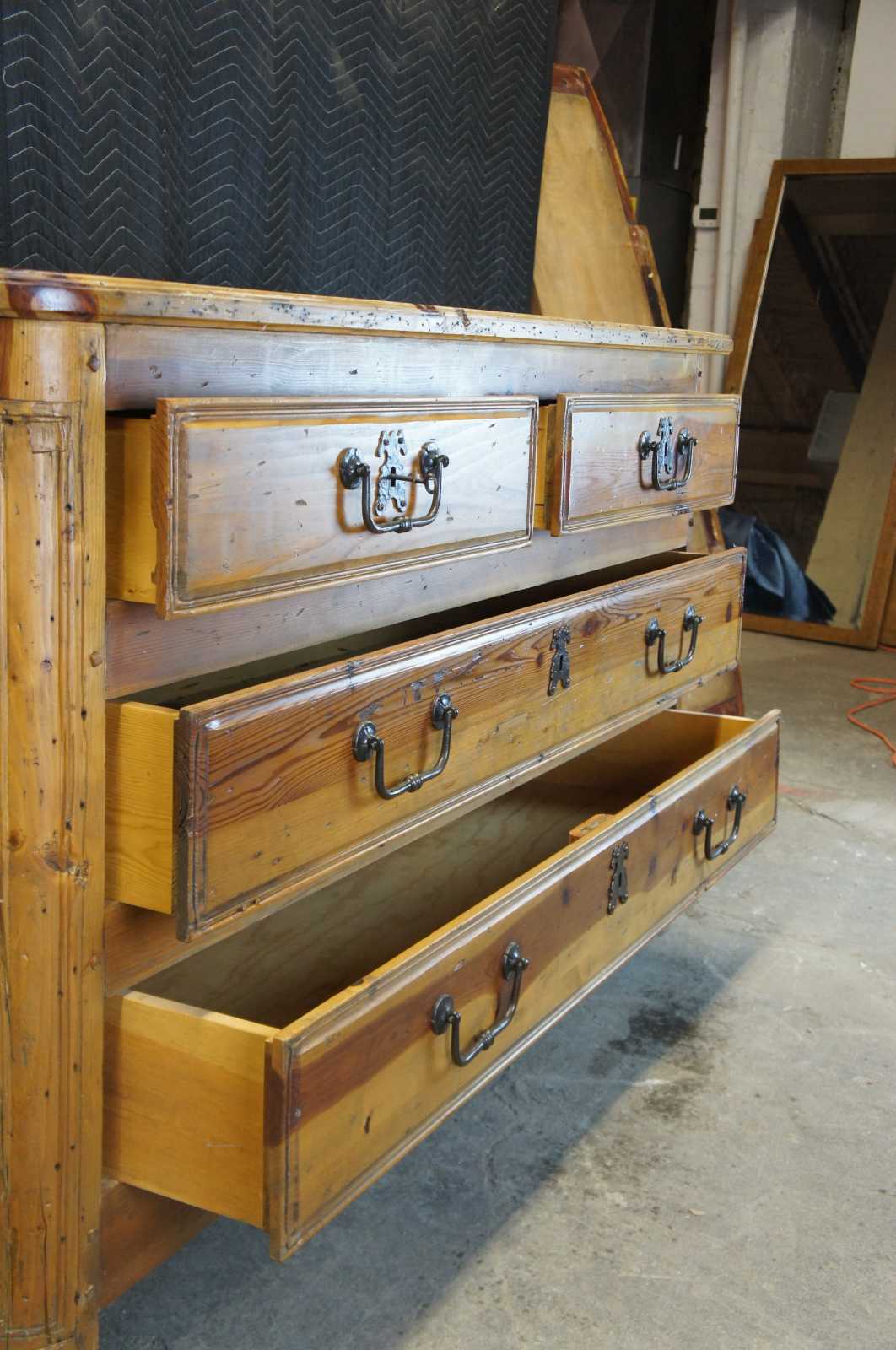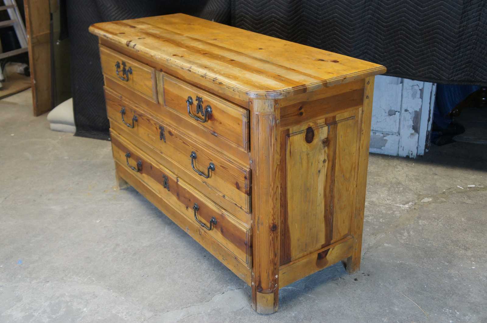 Ralph Lauren Estate Chest, circa 1990s. Made from naturally distressed solid rustic pine with an old world feel. An oversized stately rectangular form with a 2 over 2 drawer design. Each drawer is dovetailed and features classic colonial bale drawer pulls with matching escutcheon plates and key. The chest has inset panels along each side and even includes faux mortise and tenon square plugs to give off that 18th century element. Its versatile size allows it be used as a buffet, server, sideboard, console, dresser or chest.