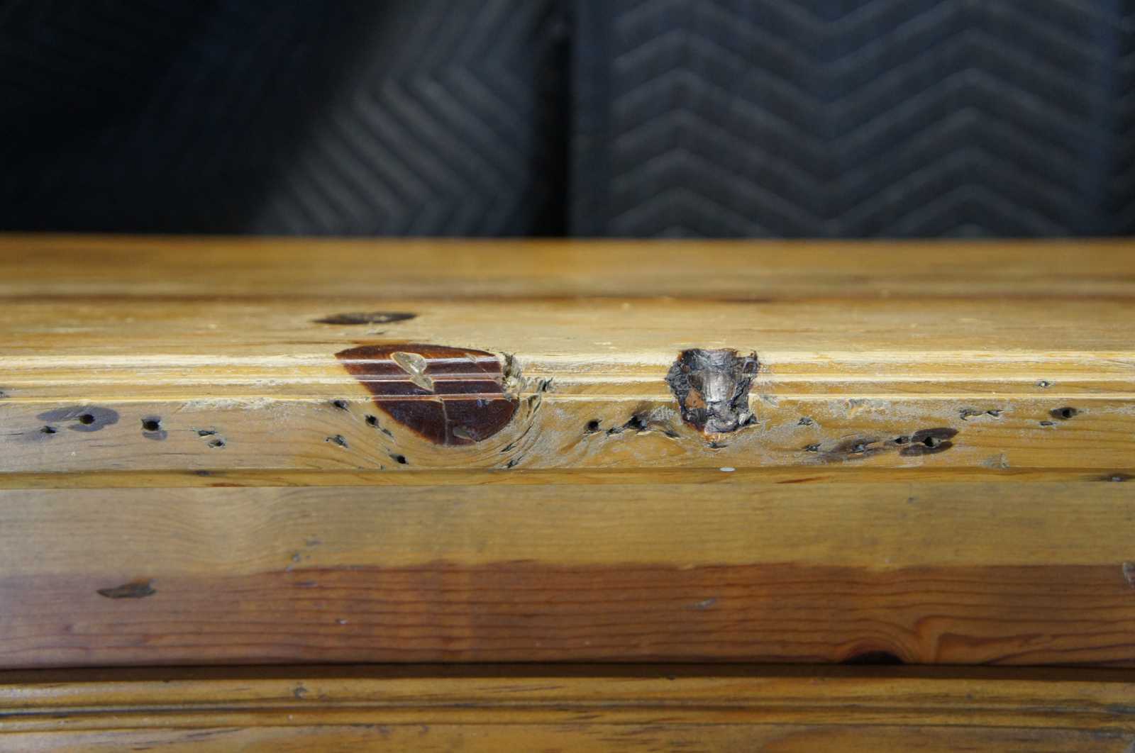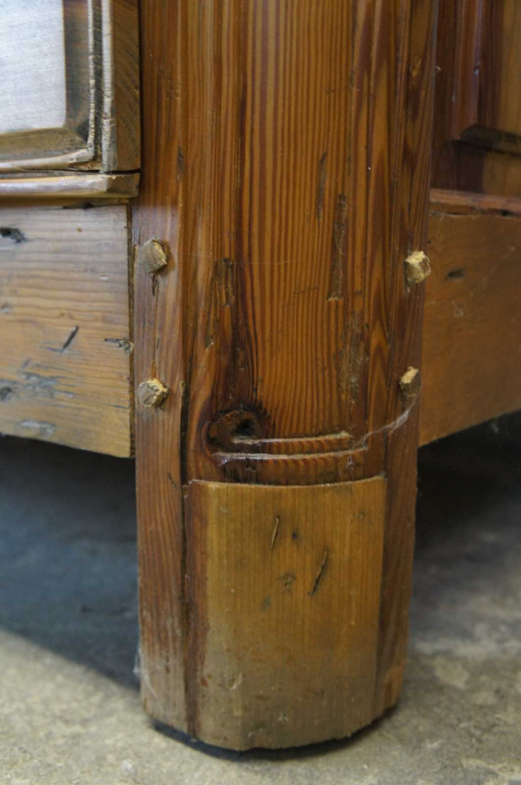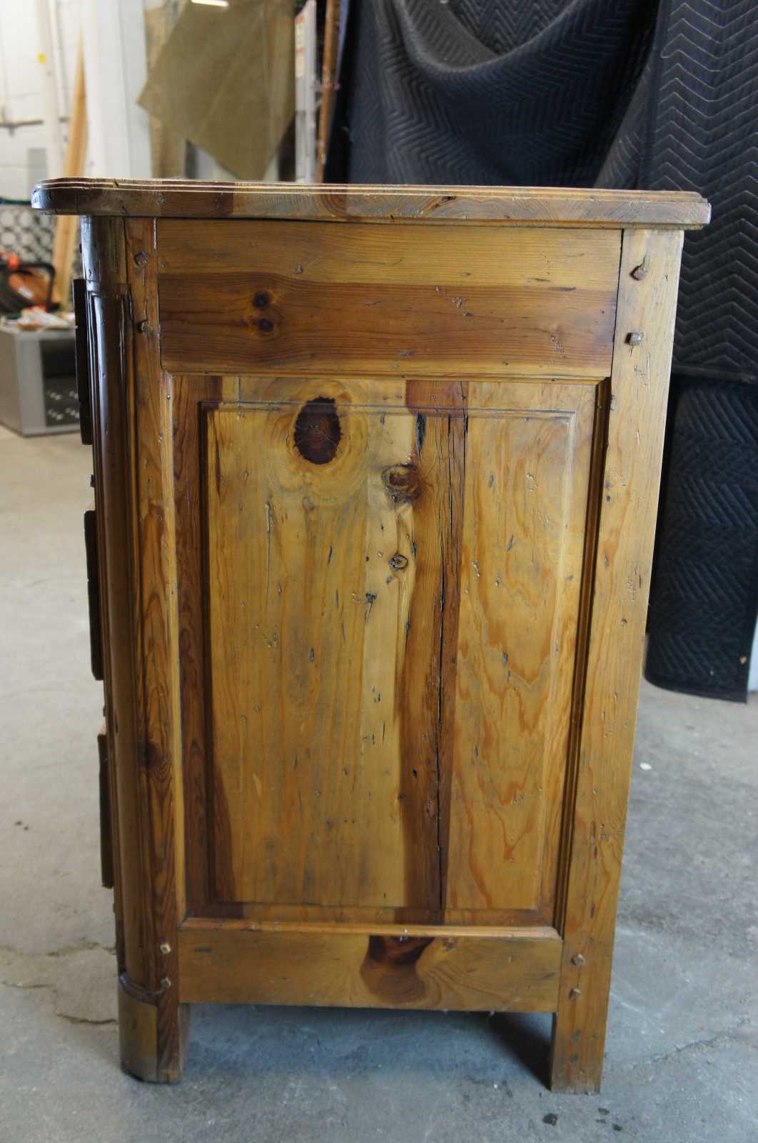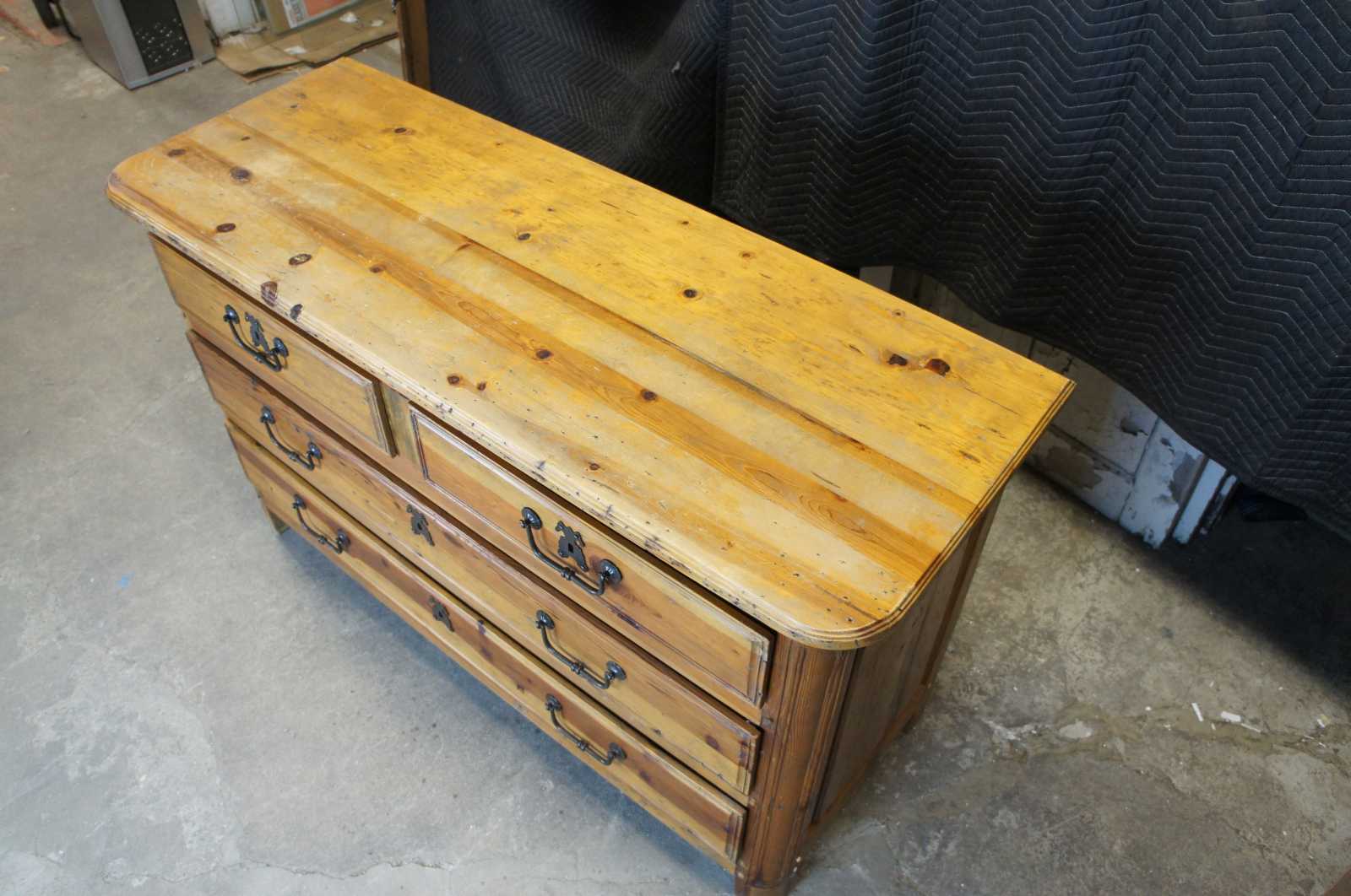 Ralph Lauren Estate Chest, circa 1990s. Made from naturally distressed solid rustic pine with an old world feel. An oversized stately rectangular form with a 2 over 2 drawer design. Each drawer is dovetailed and features classic colonial bale drawer pulls with matching escutcheon plates and key. The chest has inset panels along each side and even includes faux mortise and tenon square plugs to give off that 18th century element. Its versatile size allows it be used as a buffet, server, sideboard, console, dresser or chest.