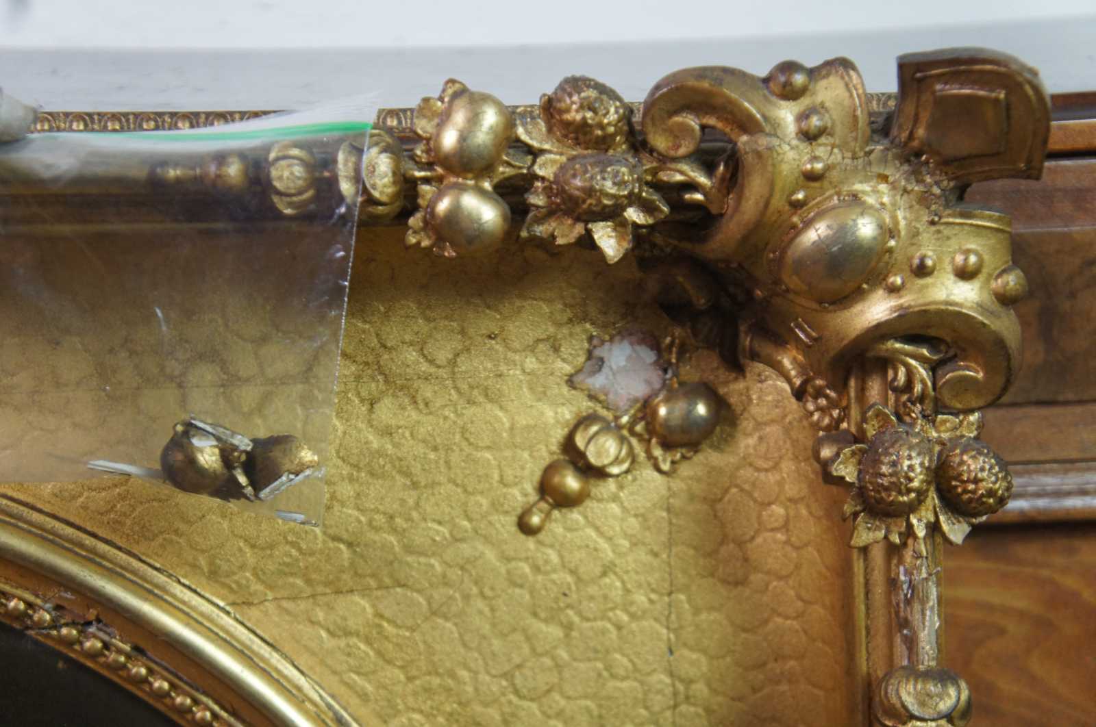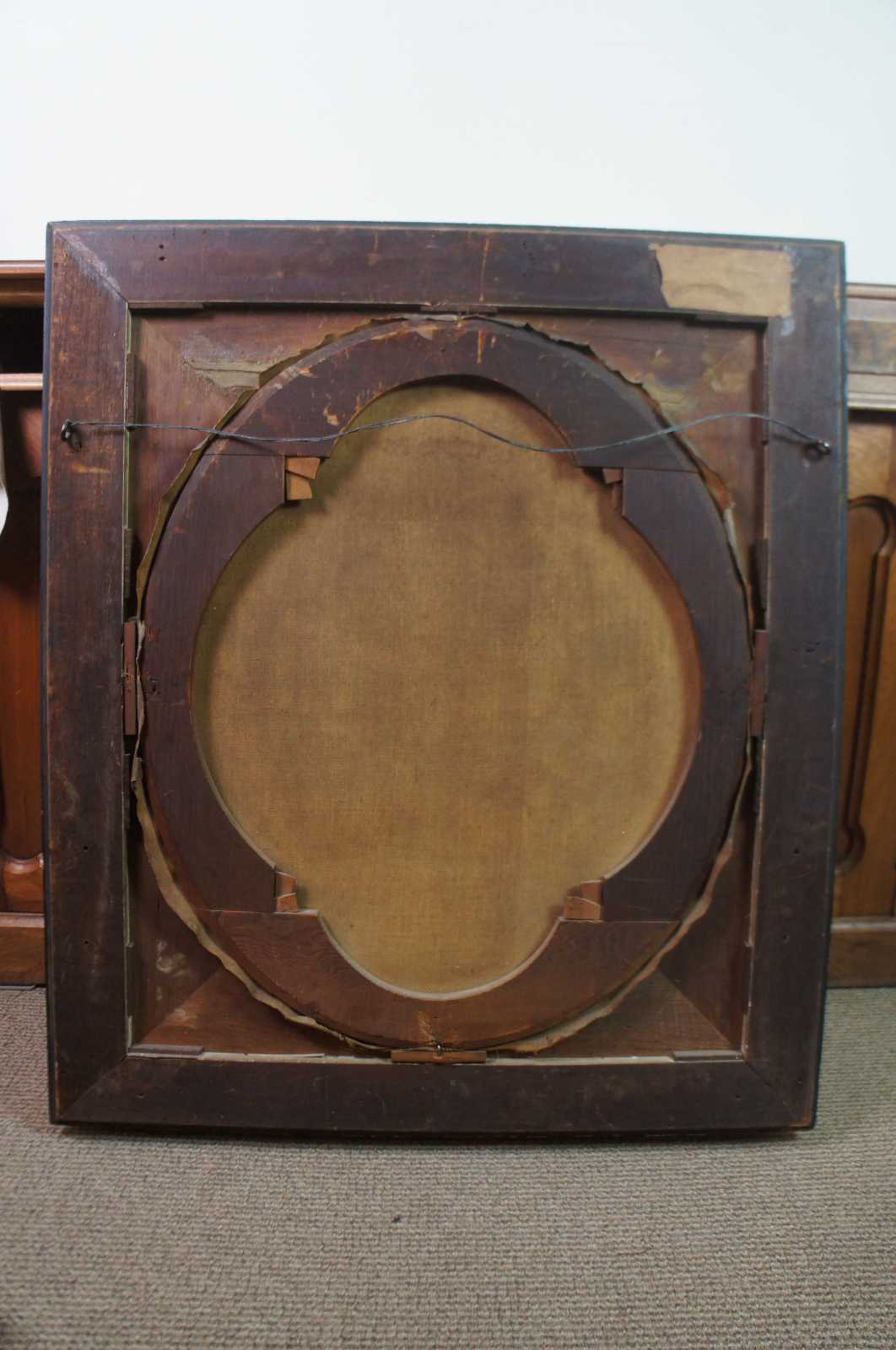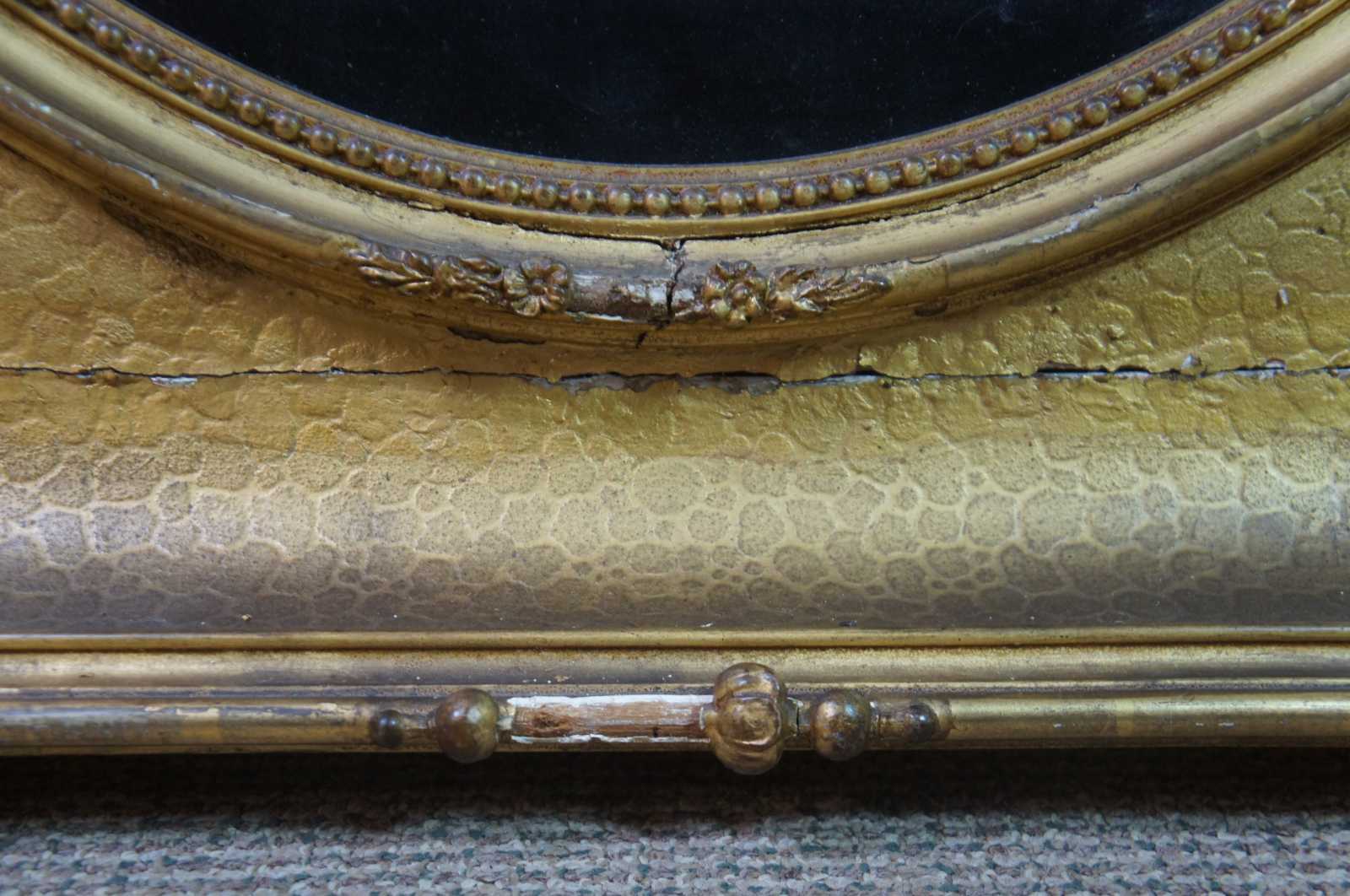 Good antique condition, wear and distressing commensurate with age and use, cracking/ chipping / finish loss to frame, missing trim, distressing / indent to canvas.