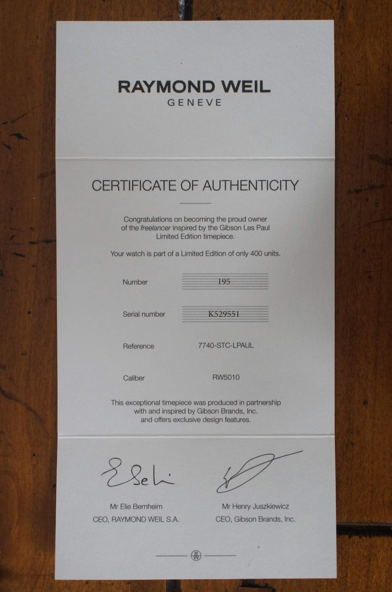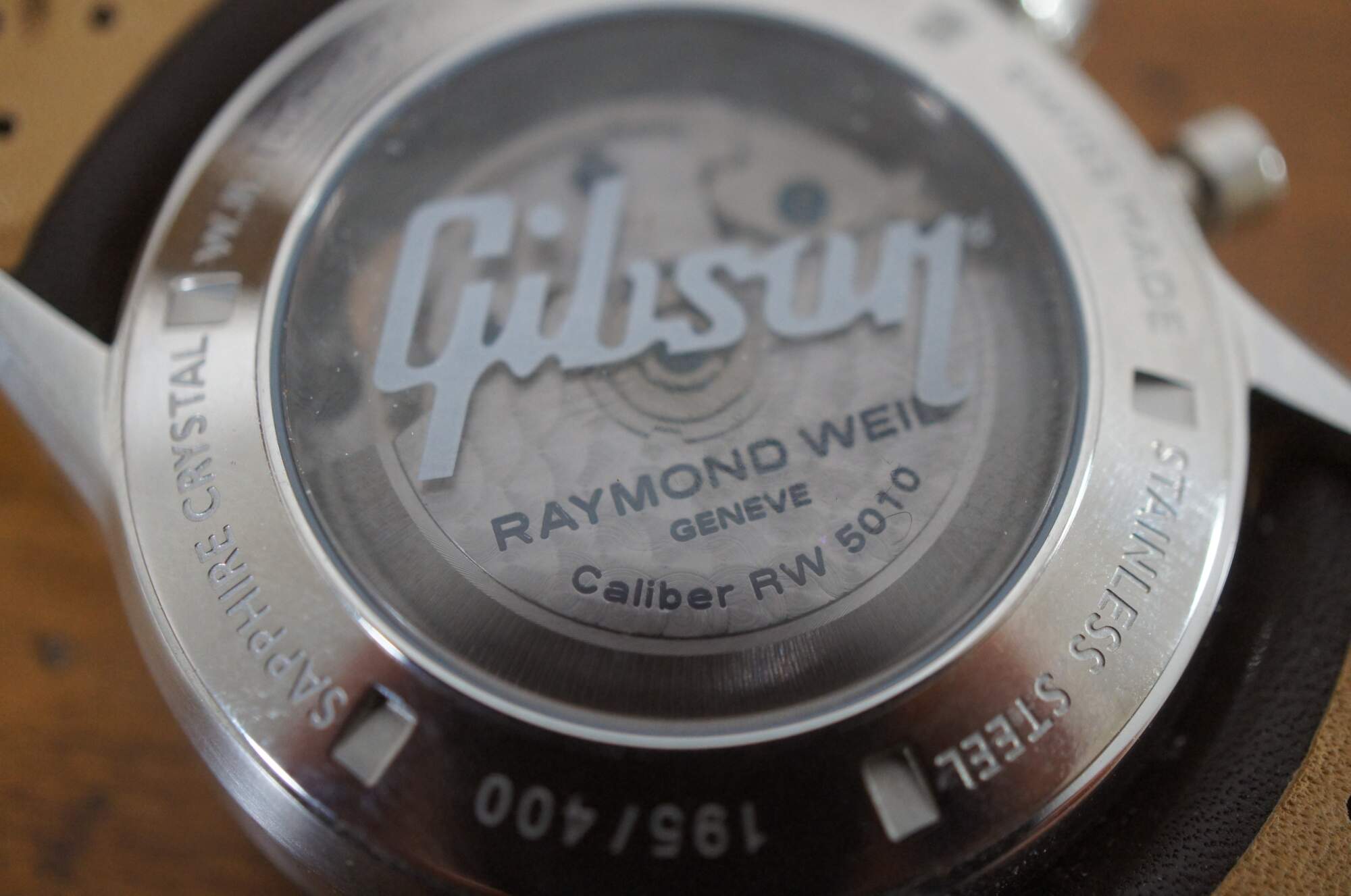 Raymond Weil Gibson Les Paul Limited edition Freelancer timepiece, number 195/400, serial number K529551; includes original packaging, store receipt, and certificate of authenticity.