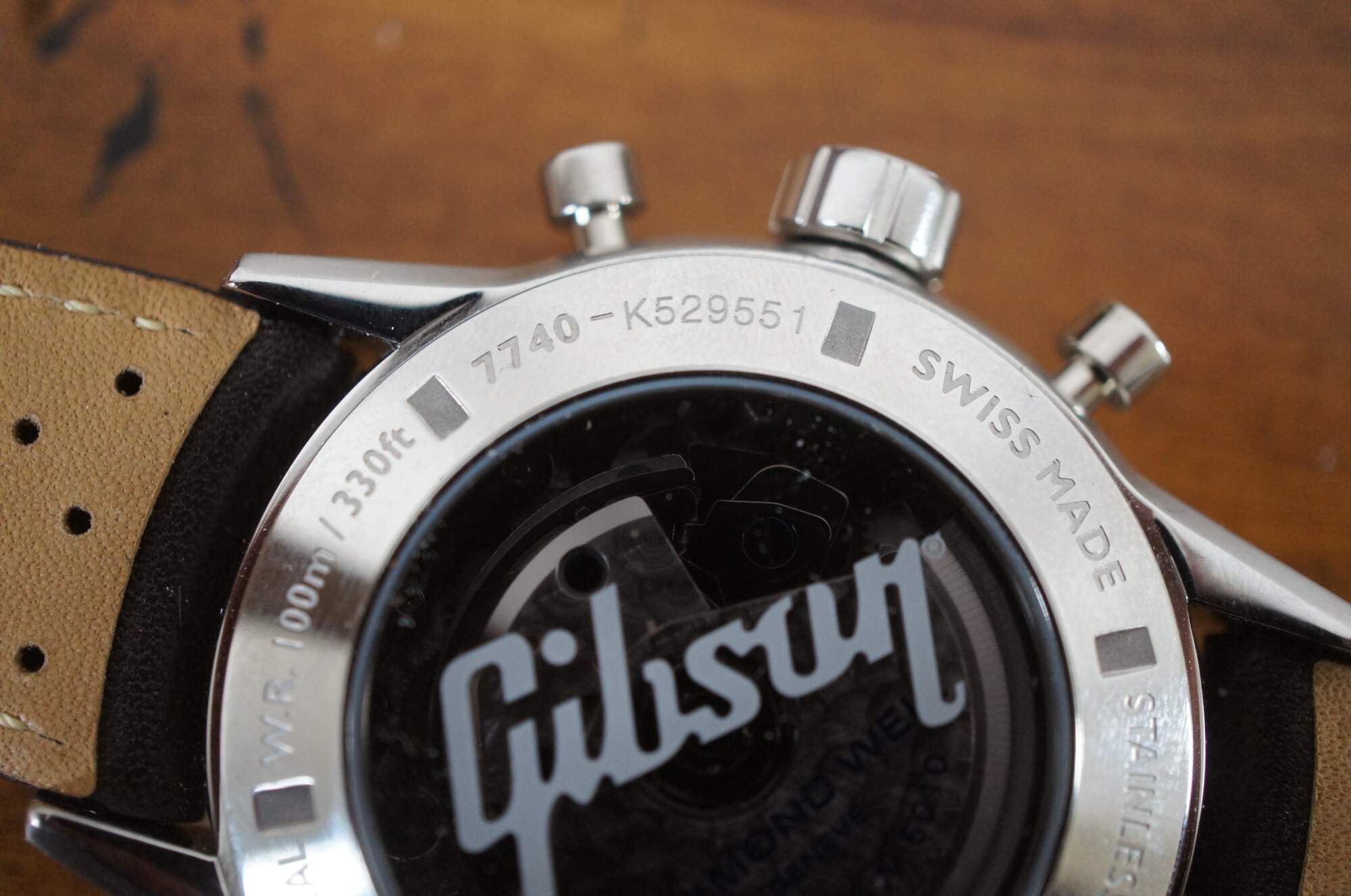 The chronograph, with a 30-minute counter at 3 o’clock and 12-hour counter at 6 o’clock, as well as the other timekeeping functions, are powered by the mechanical, self-winding Caliber RW5010 (based on the La Joux-Perret 8601), which is visible through a clear caseback adorned with another Gibson logo. The movement, which is the same used in the Nabucco model devoted to Gibson, has 27 jewels and a 46-hour power reserve when fully wound.