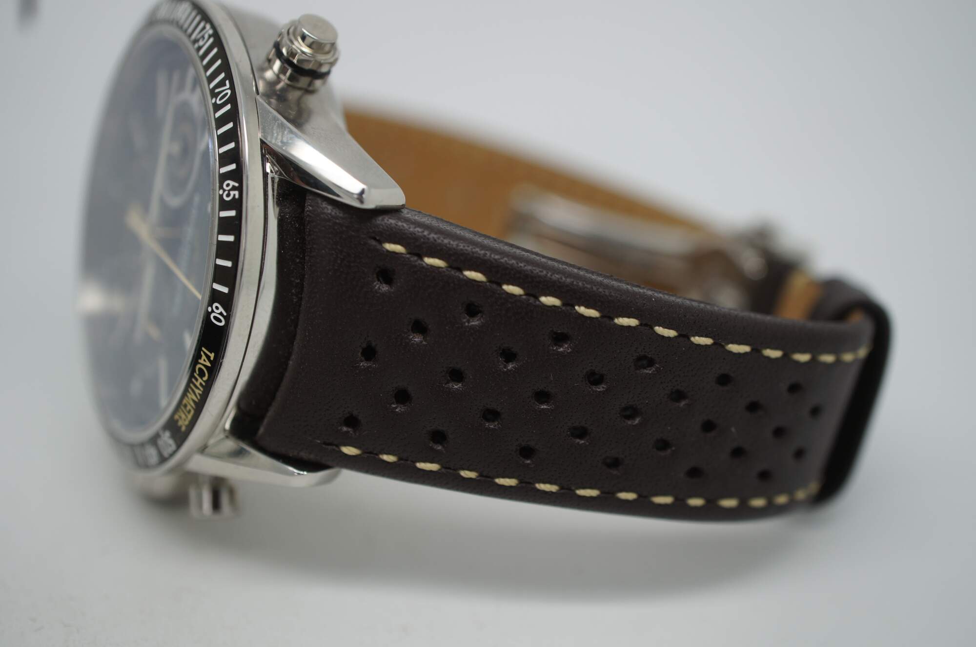 The dial features a circular guilloché motif representing the guitar’s six chords, while the applied hour markers are fret-shaped. The Gibson logo and a Les Paul signature appear at 12 o’clock, just above the Raymond Weil brand logo. The famous golden split-diamond inlay, a defining feature of the Gibson Les Paul, is represented at 4:30 next to the date window. Golden highlights are used in the chronograph counter, date window, and central chrono hand. Finally, the perforations in the golden-top-stitched calf leather strap are reminiscent of the sound holes in the body of a guitar.