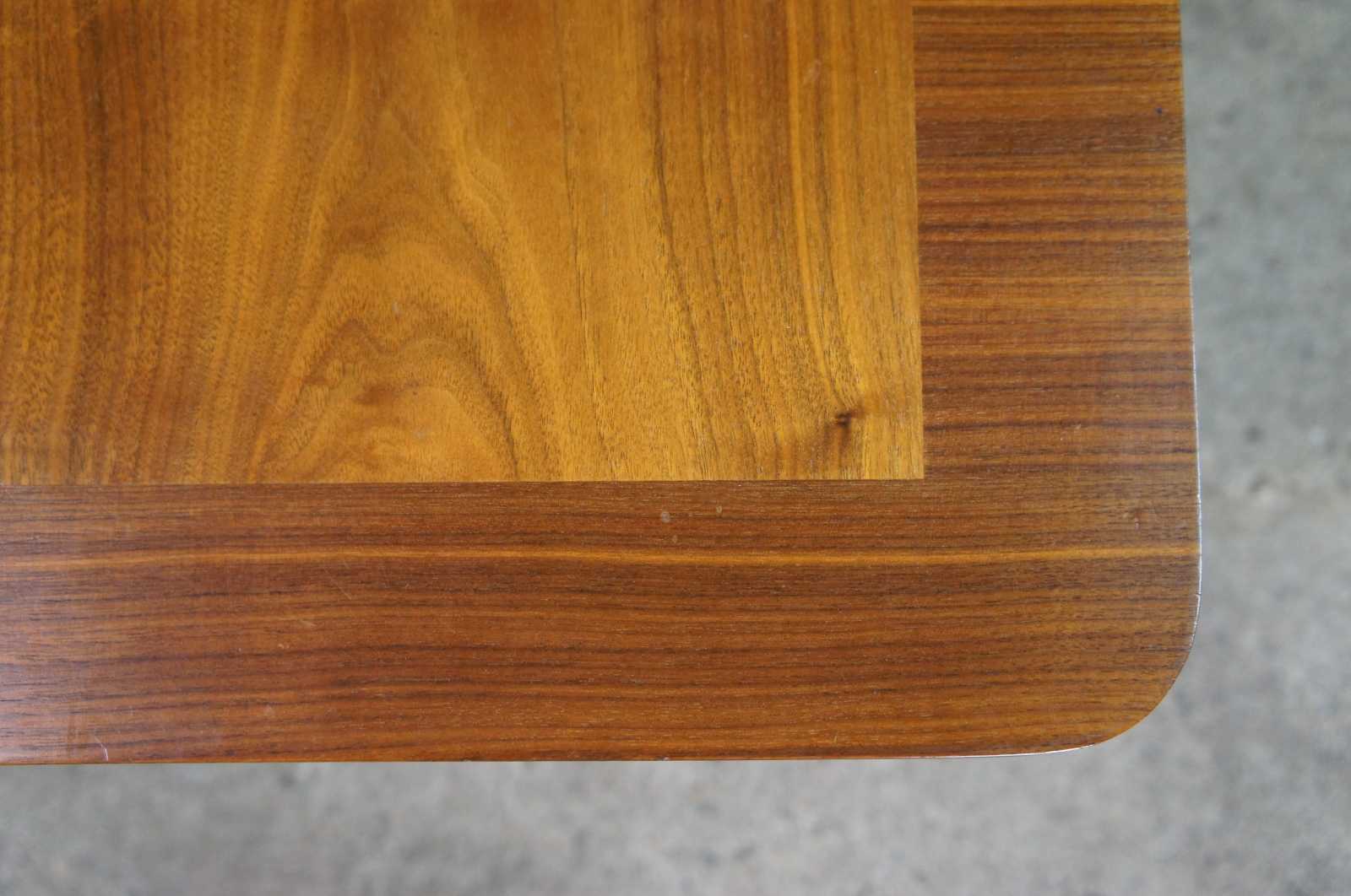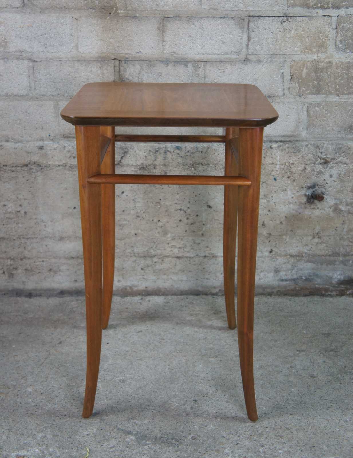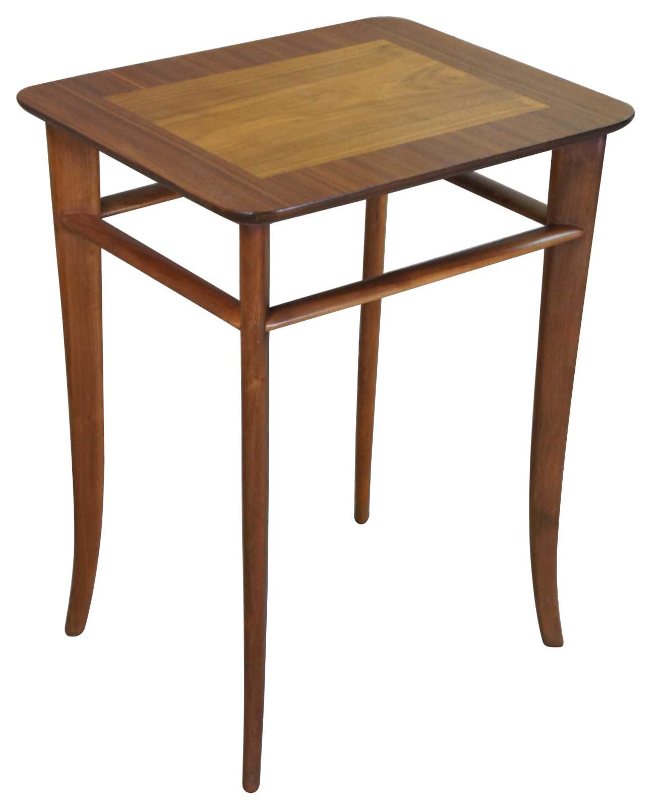 Mid century modern natural walnut side table by John Widdicomb of Grand Rapids. Made of walnut featuring Danish styling with banded top, rectangular form, and tapered flared legs.