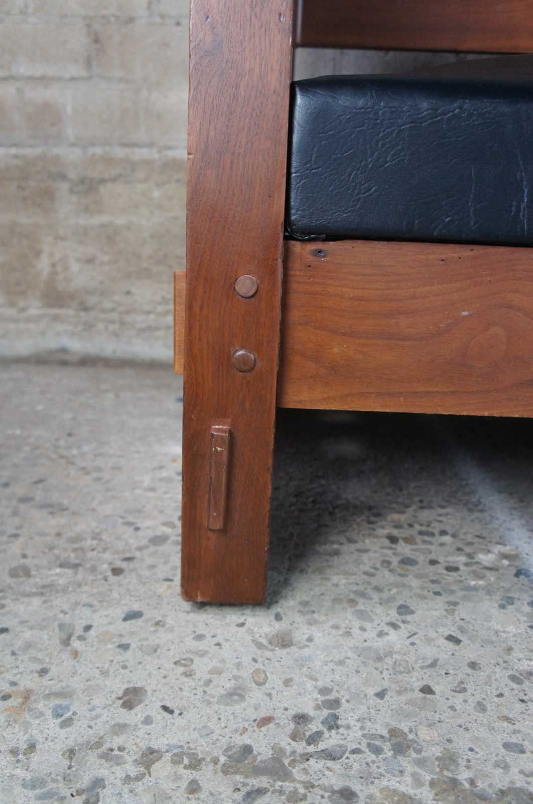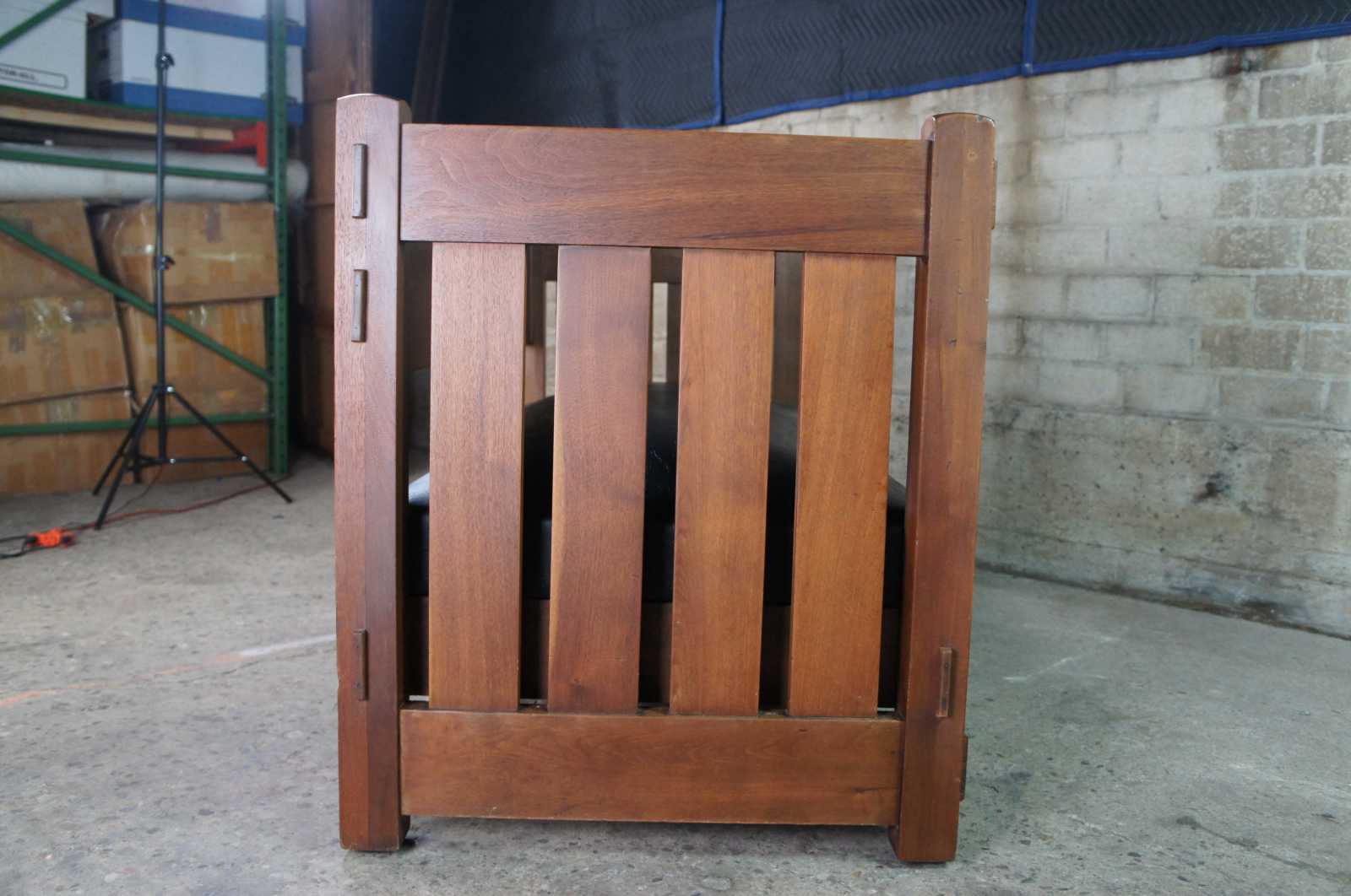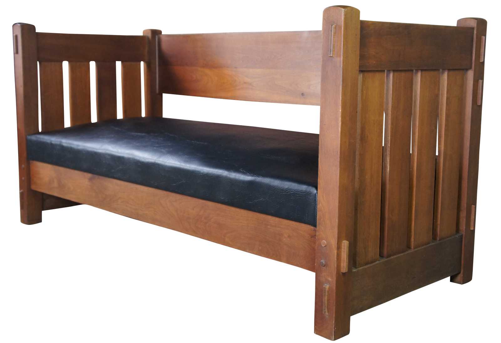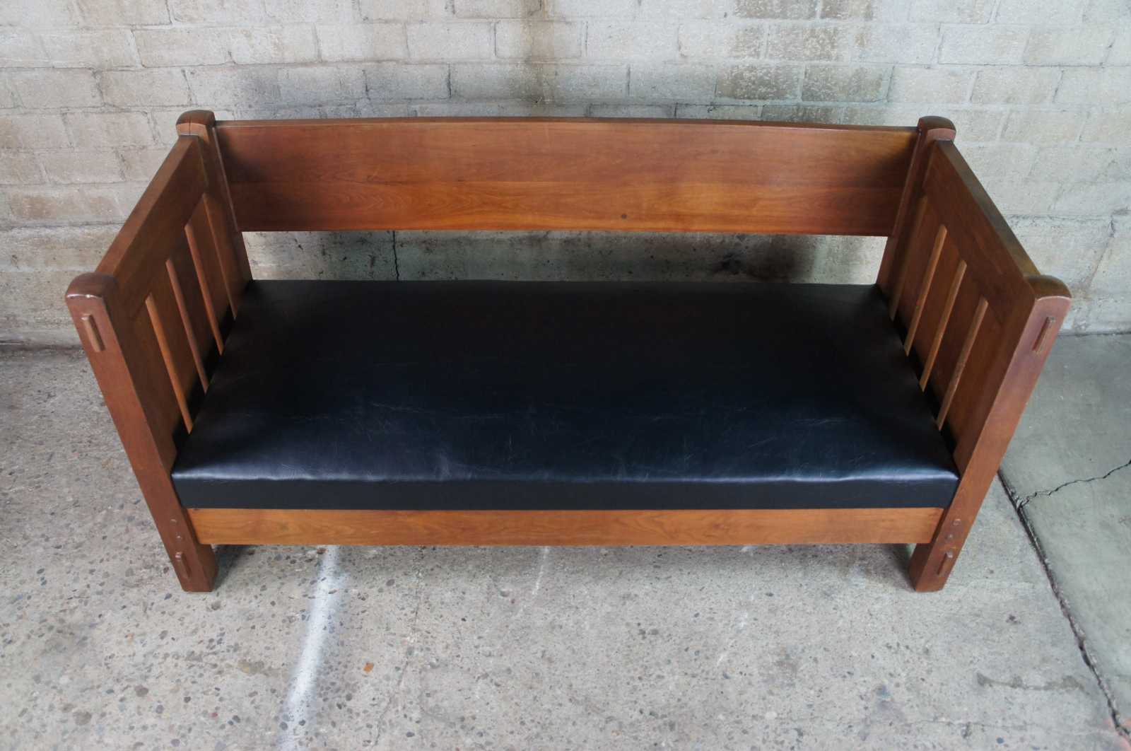 Antique Mission 1920s-1930s arts and crafts sofa or couch. Made of oak featuring rectangular form with traditional styling and vinyl bench seat.