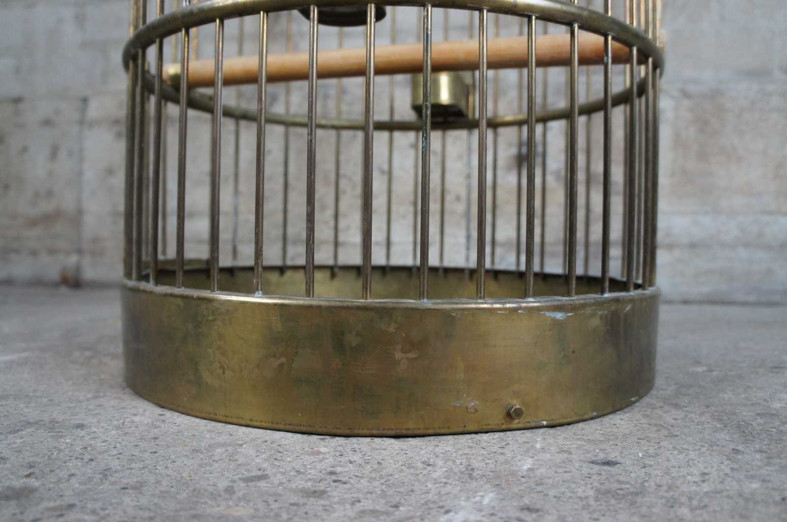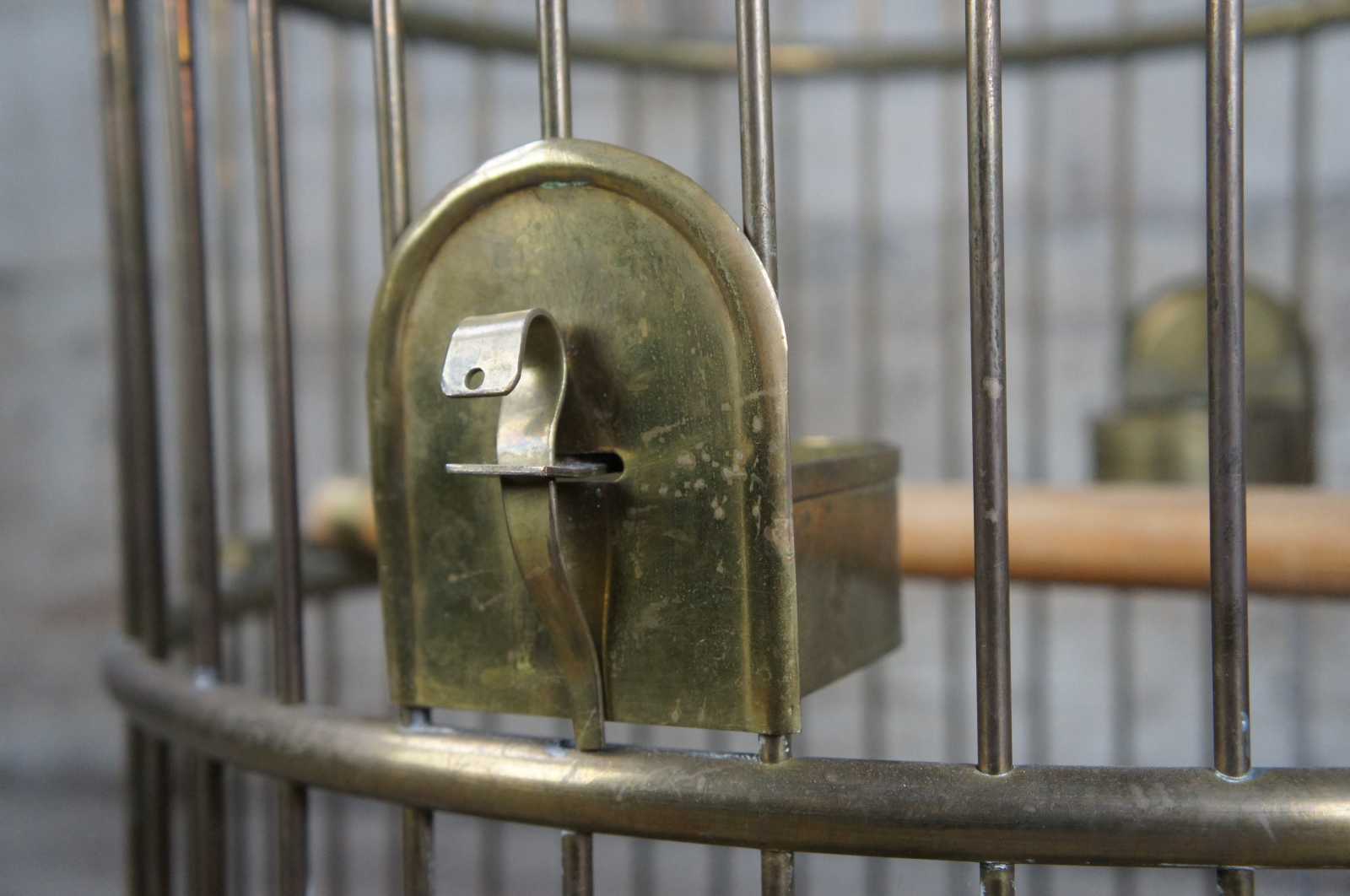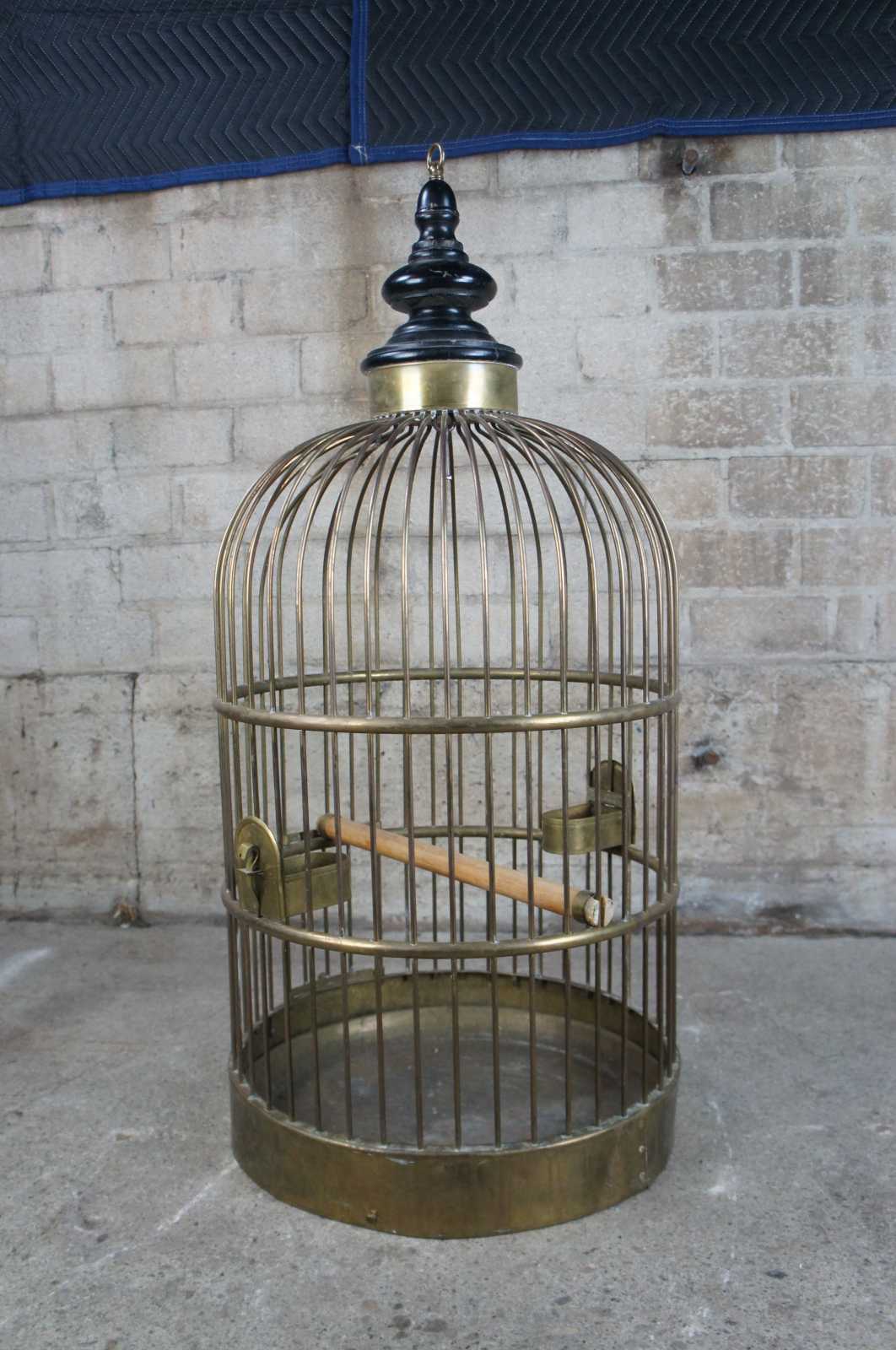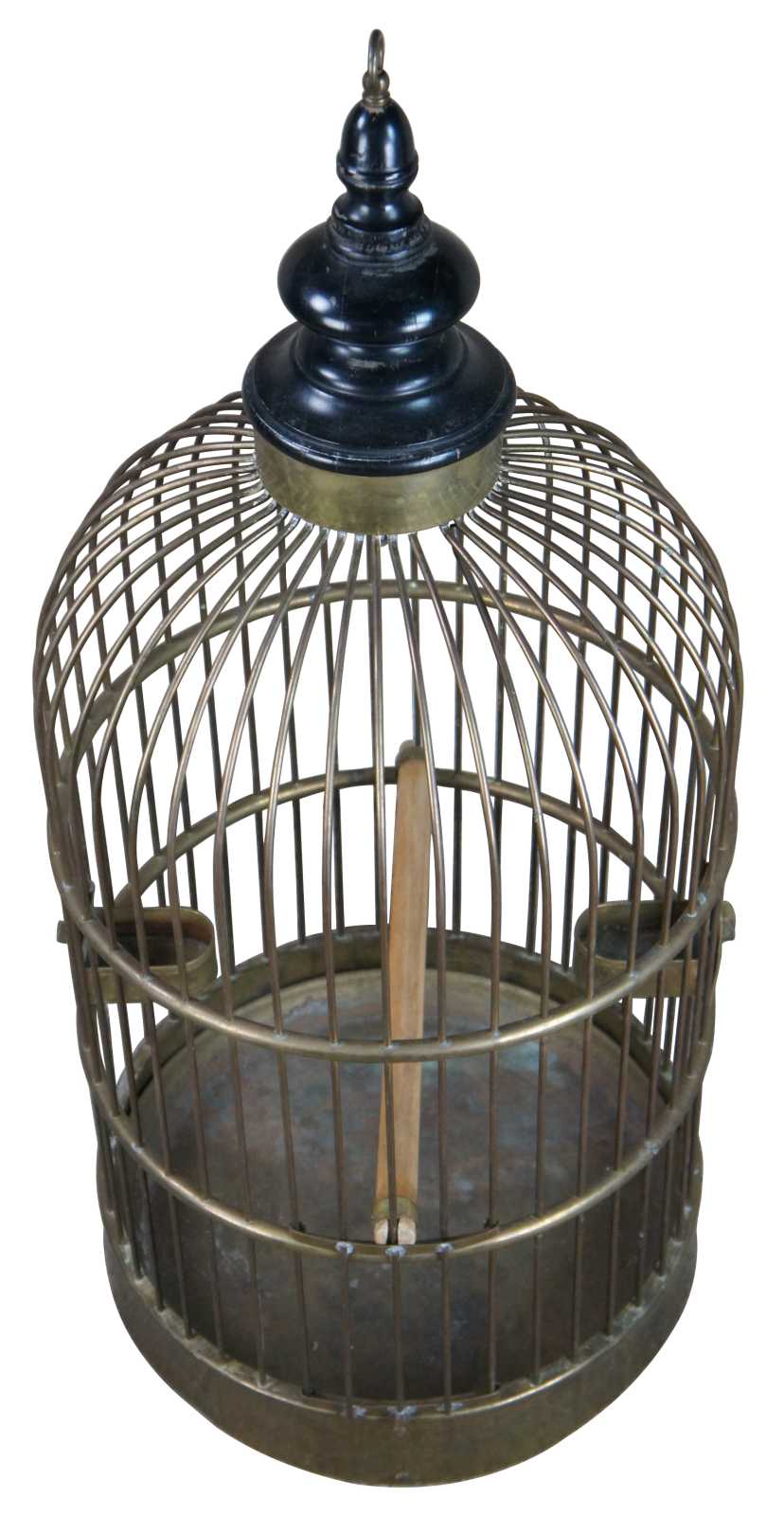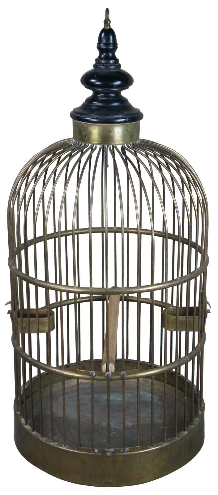 Monumental antique French bird cage featuring solid brass construction with turned wood finial, two brass feeders and perch.