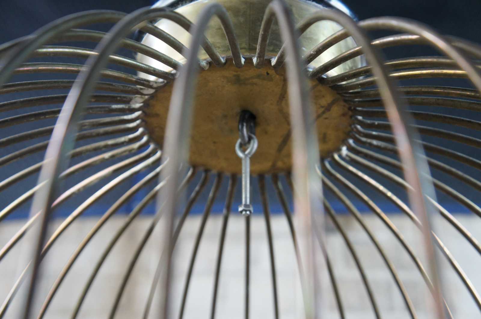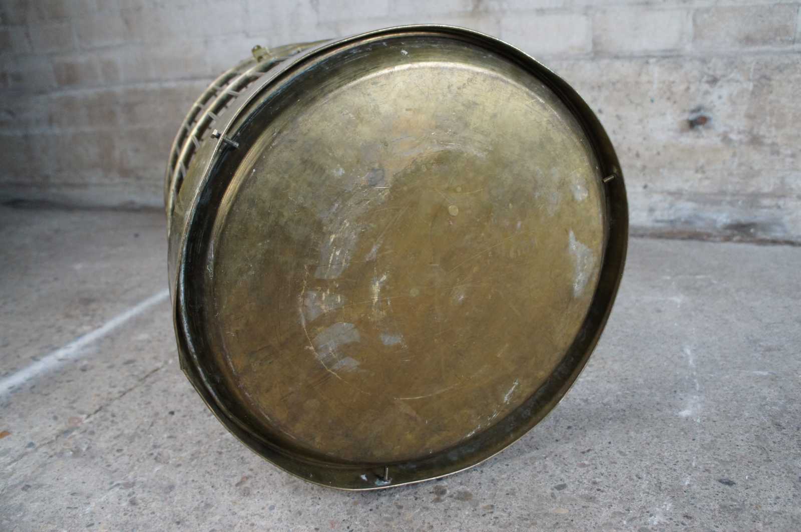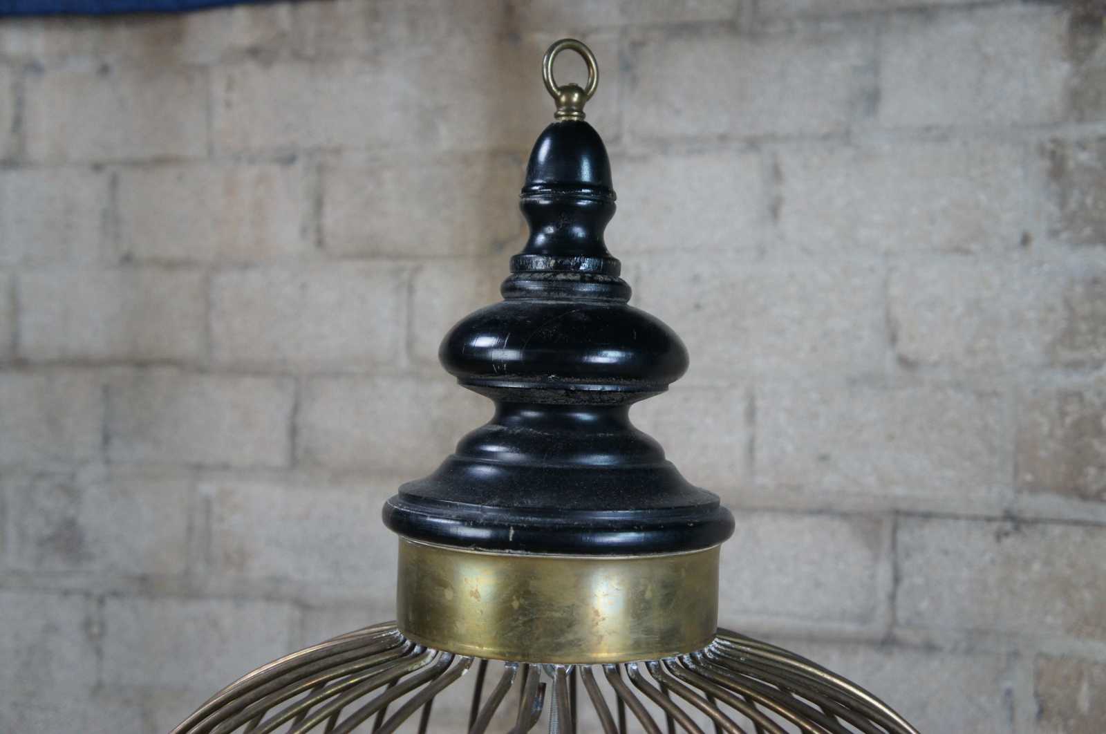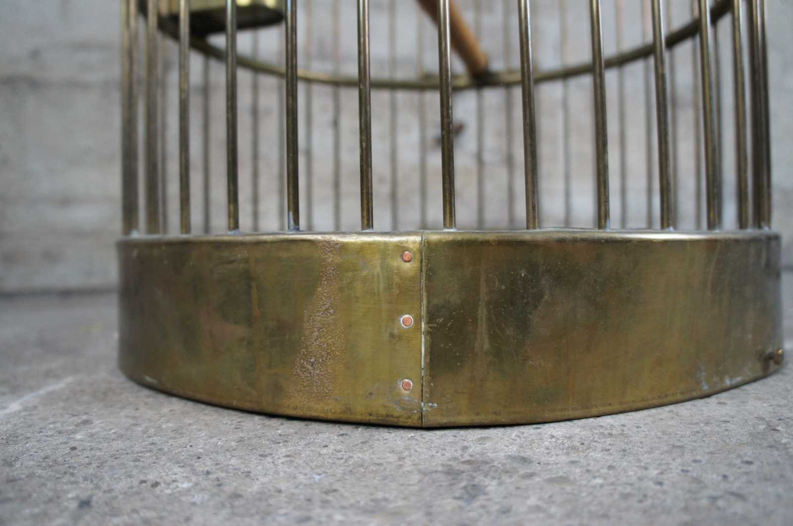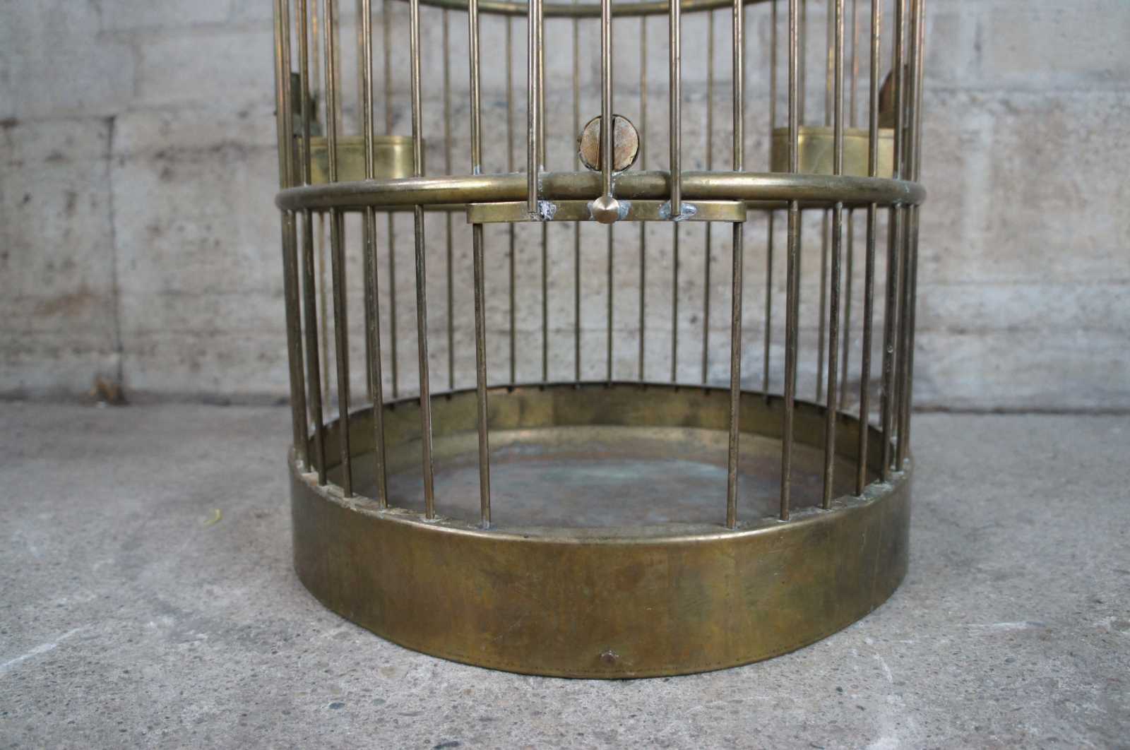 Monumental antique French bird cage featuring solid brass construction with turned wood finial, two brass feeders and perch.