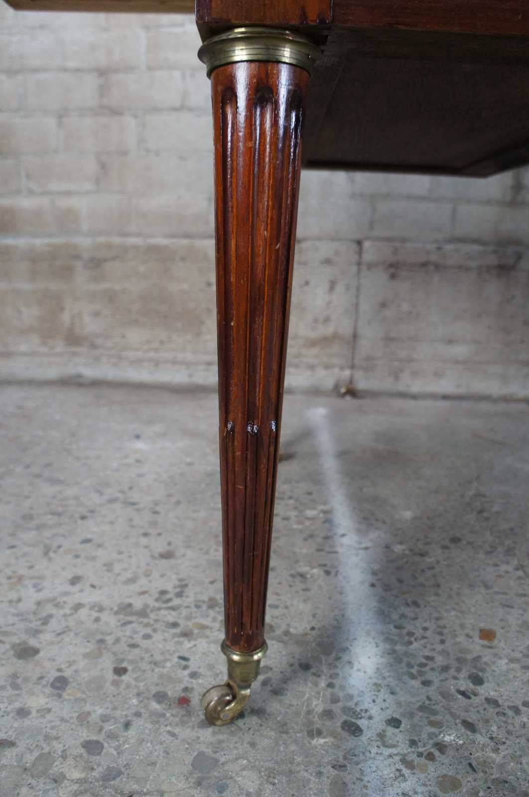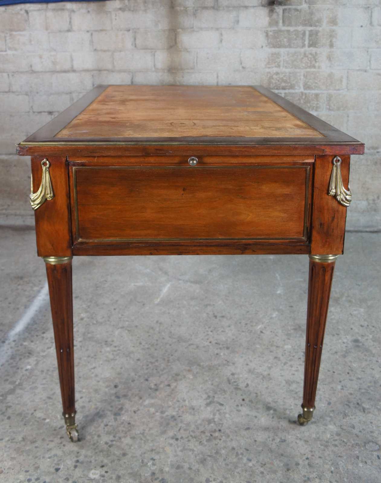 Antique French Louis XVI Directoire writing desk. Made of walnut featuring Neoclassical styling with leather top, two large extending pull out surfaces, four drawers, brass accents and tapered fluted legs over castors. Includes lockable drawers with additional interior lockbox to top right drawer.
