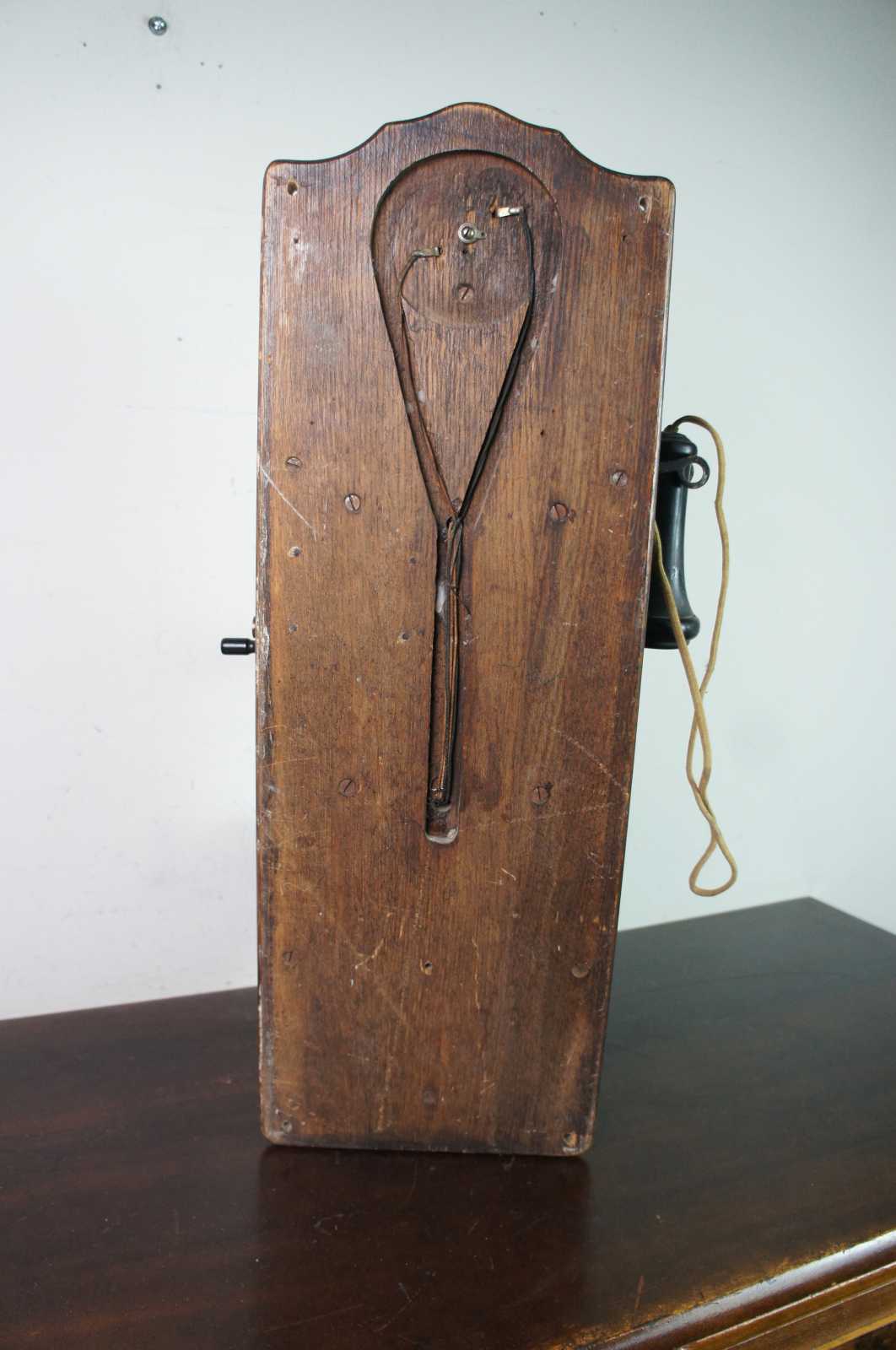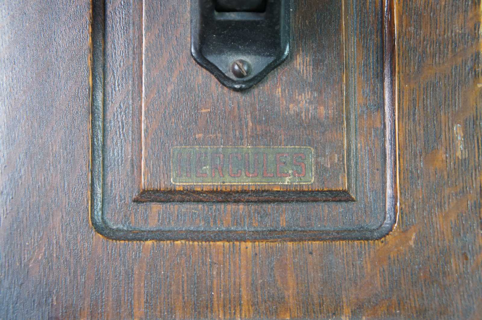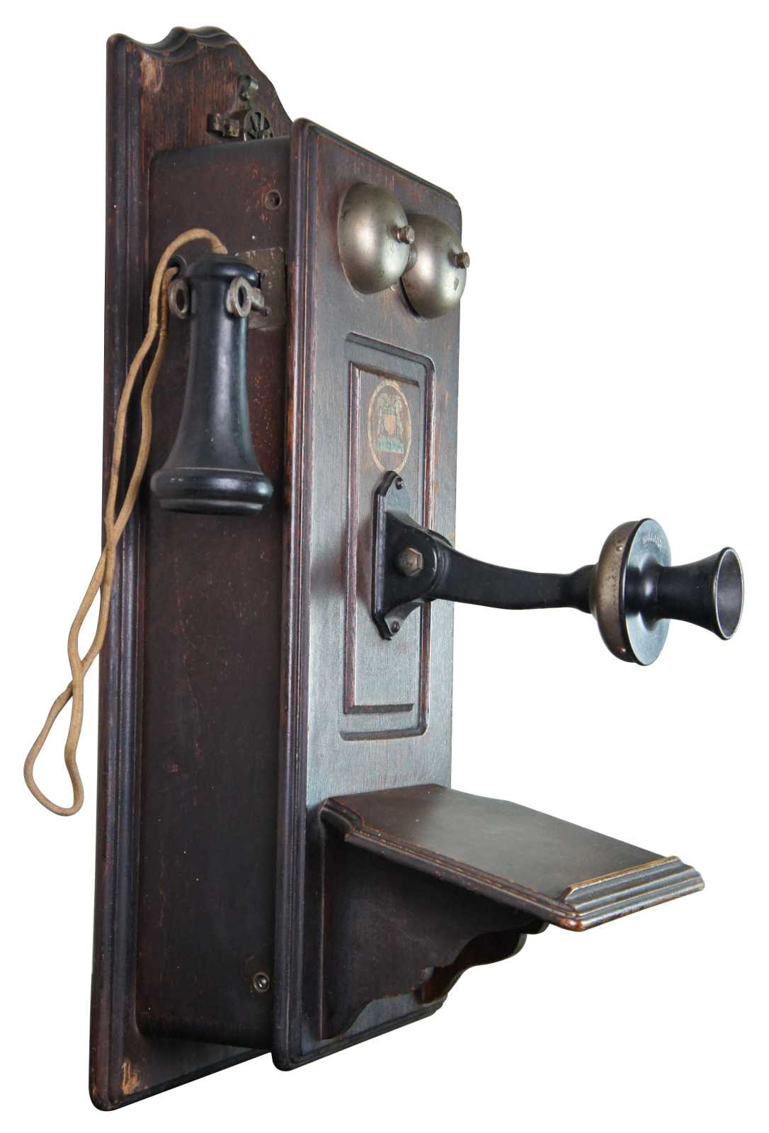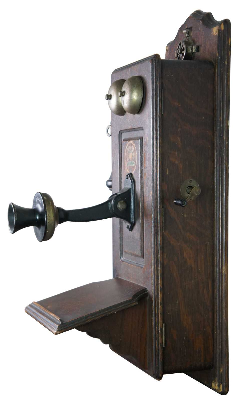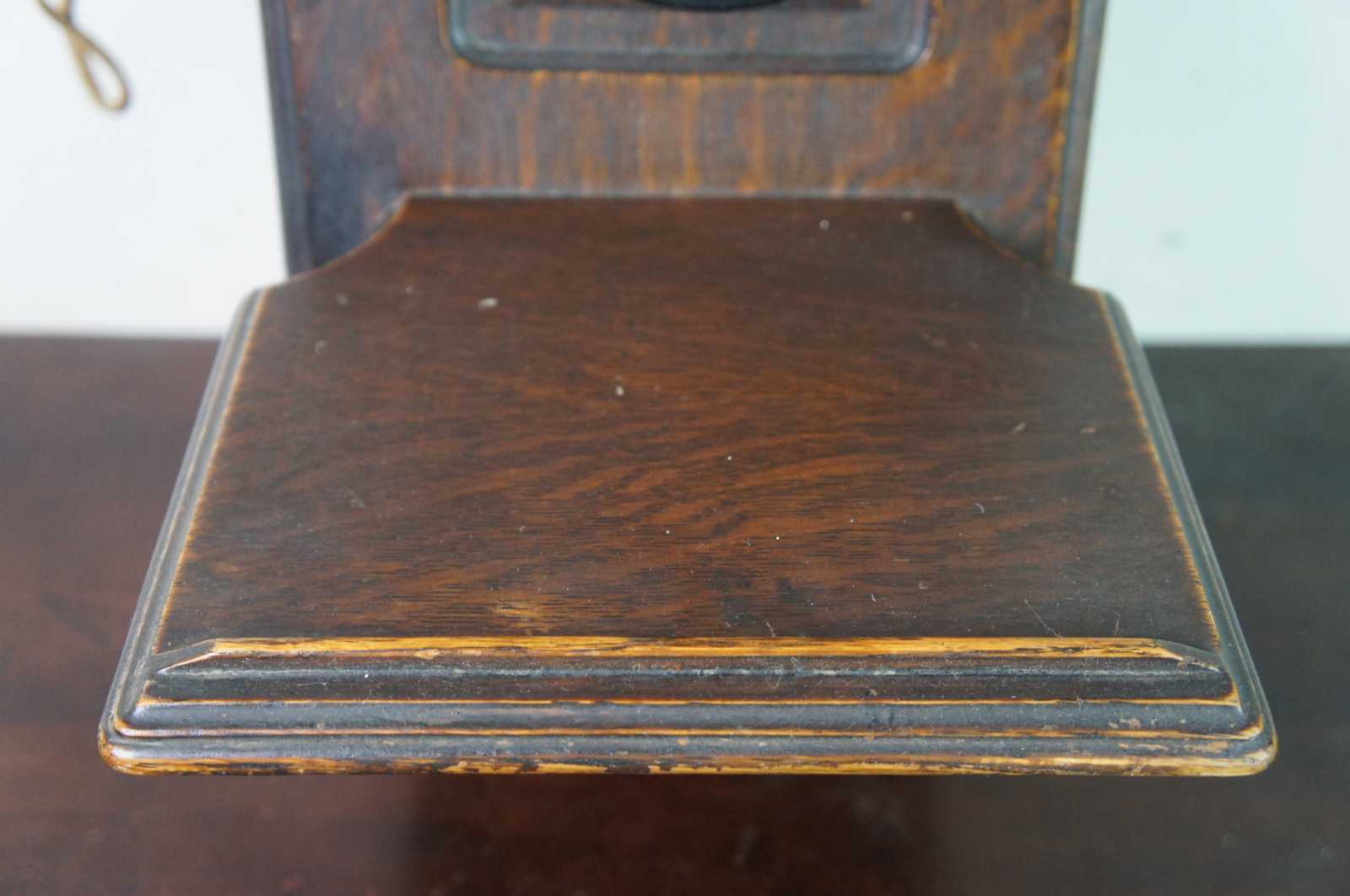 Antique Swedish American Telephone Company wall crank Hercules phone featuring quartersawn oak case with ledge. Circa 1900.