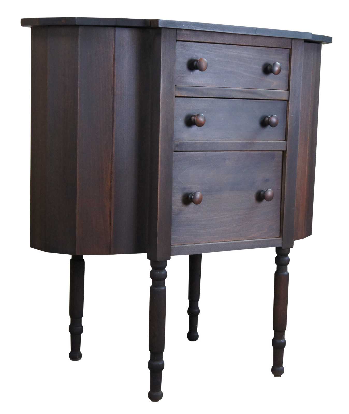 Antique Martha Washington style wooden sewing cabinet with two flip top end sections, three drawers, and turned spindle legs.