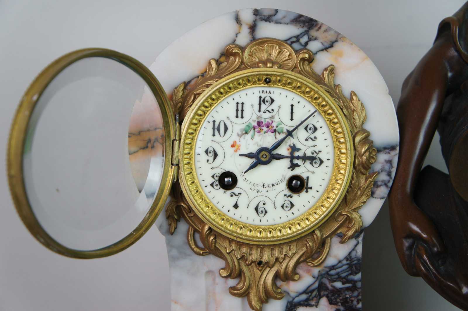 Antique AD Mougin French figural garniture clock and mantel urns. Made of marble and bronze with gilt accents and neoclassical styling featuring a figural bronze peasant woman carrying a sheath of wheat and cook pot flanked by two large mantel urns decorated with nude female figures, cherubs / puttis, flowers, a basket of fruit and tassels. The porcelain clock face is marked Bollot-Lemoine St. Quintin France.